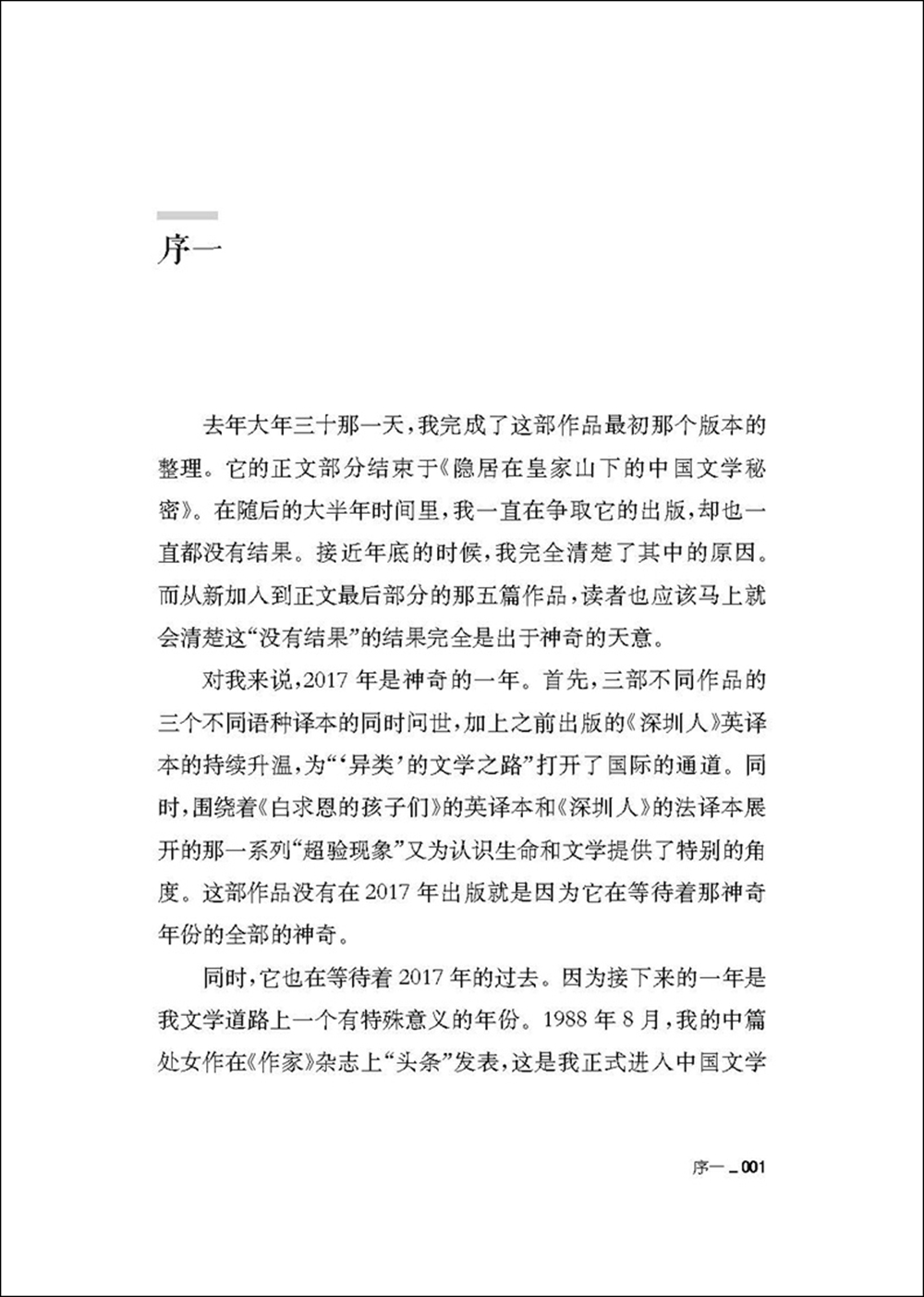 同时,它也在等待着2017年的过去。因为接下来的一年是我文学道路上一个有特殊意义的年份。1988年8月,我的中篇处女作在《作家》杂志上“头条”发表,这是我正式进入中国文学景区的标志。整整三十年过去了……能够在如此特殊的年份出版这部关于文学和人生的作品也同样应该是“成事在天”的例证。