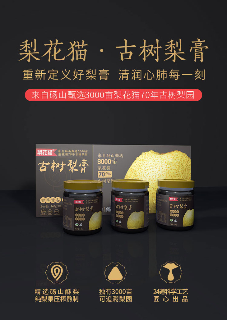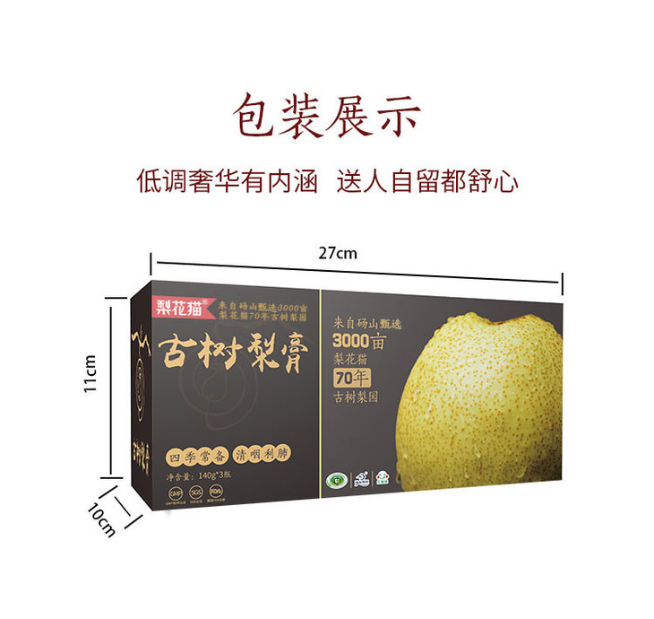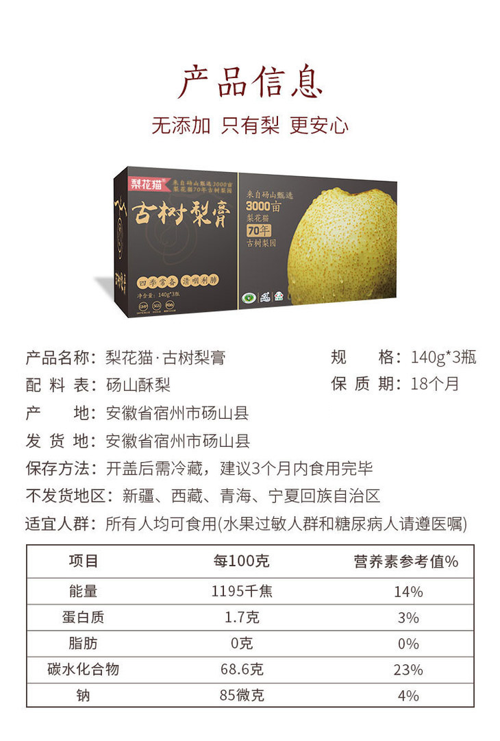 【产品规格】古树梨膏1盒装(140g×3瓶),古树梨膏2盒装(140g×6瓶)(每箱都是独立的包装,如购买多件分多个包裹发出,可能会前后陆续到货)。