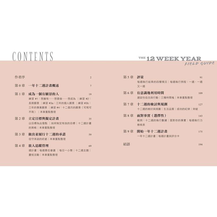 ■ 一年12週五步驟的應用方式,包含如何設定願景、規劃12週目標和計畫、追蹤管理執行進度、評量自己的成就,以及分配時間塊等