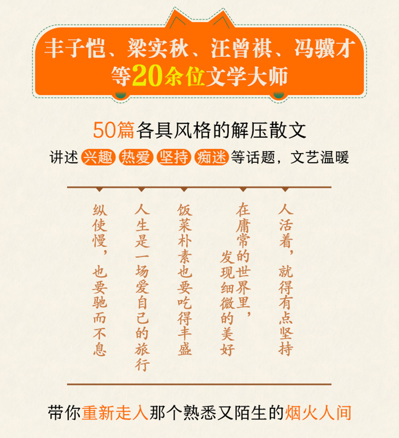 无论如何,万事都应该全力以赴,因为我们能掌握的只有眼前。书中20余位作家用不同时代的感受,凝聚成50篇或调侃、或鼓励、或洒脱的文章,他们无一不在表达着“全力以赴不是竭尽全力的用力过猛,而是投入全身心去感受当下”。认真生活,使一个短暂的瞬间也拥有丰腴的过去,才是属于自己独一无二的人生。