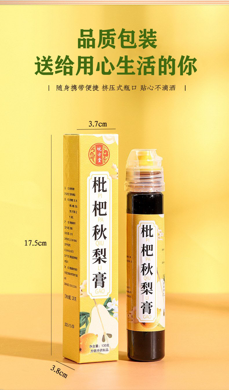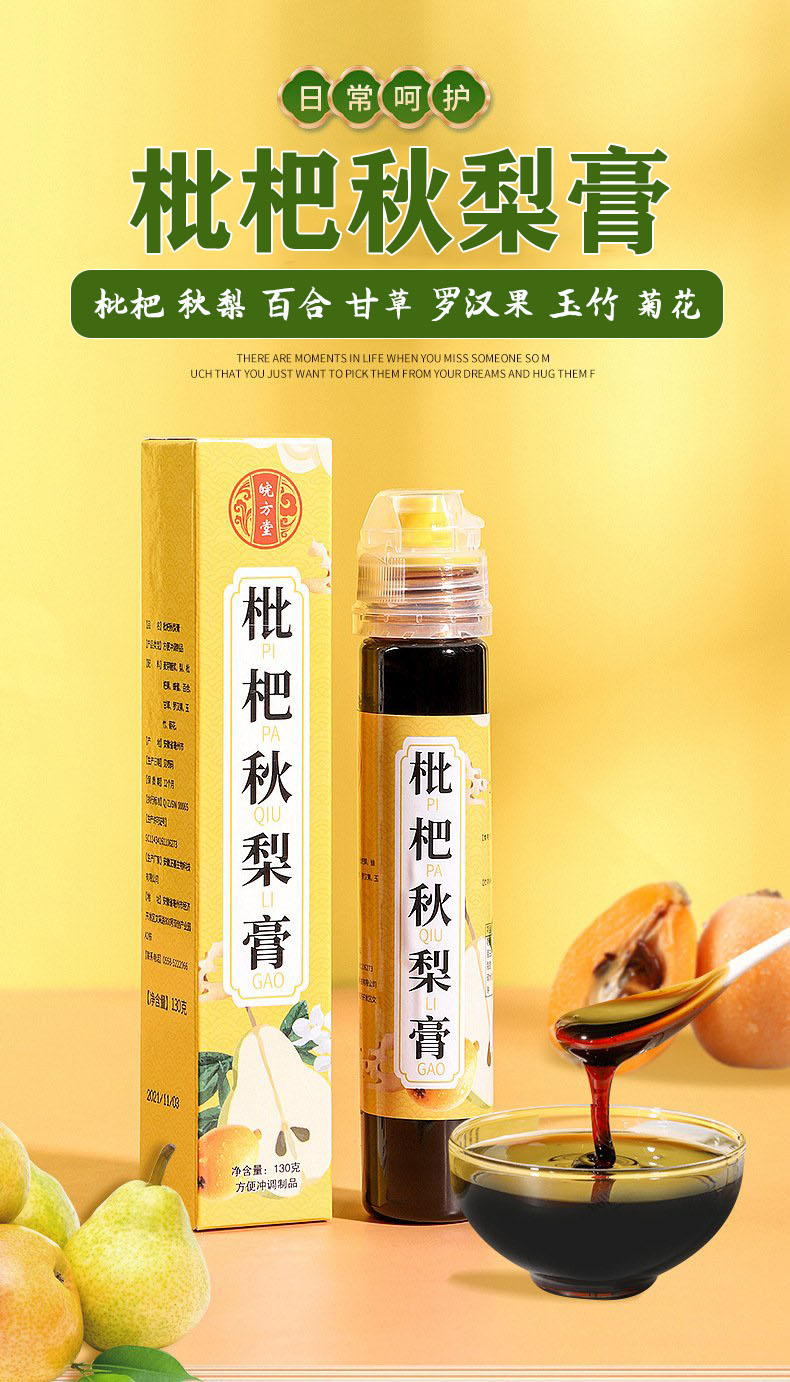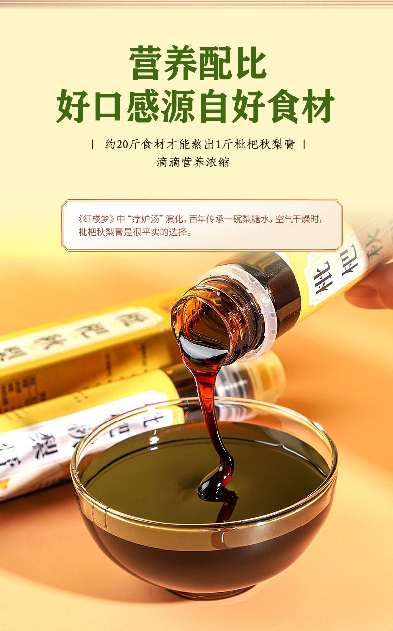 枇杷秋梨膏,15瓶组合,选上等枇杷、秋梨、百合、甘草、罗汉果、玉竹、菊花等营养食材,古法熬制而成,琥珀色泽,味道清润甘甜,舒爽顺滑,滴滴精华,营养丰富D