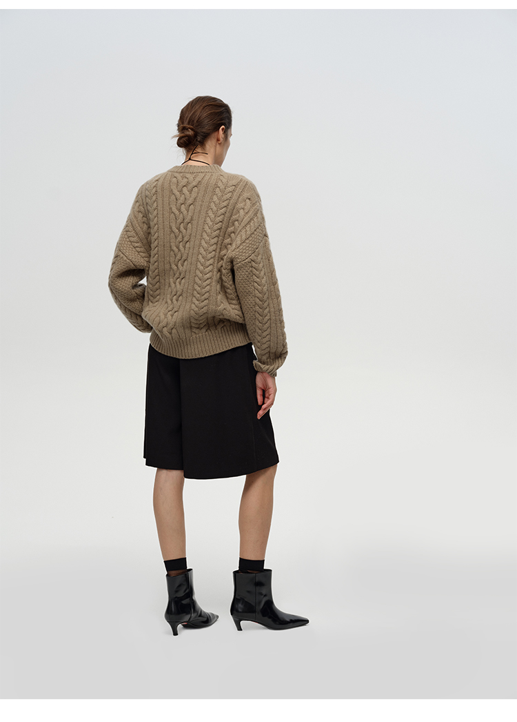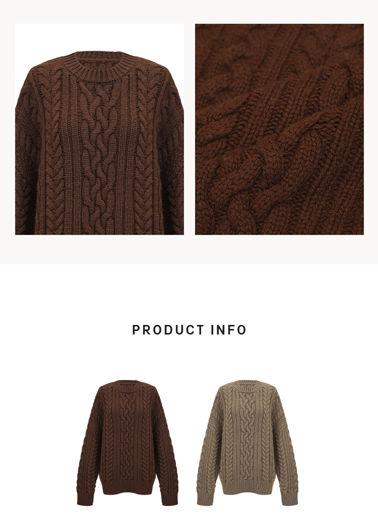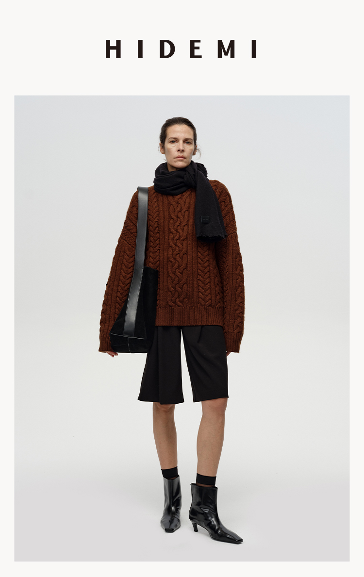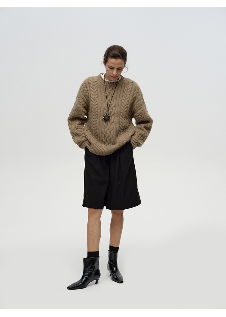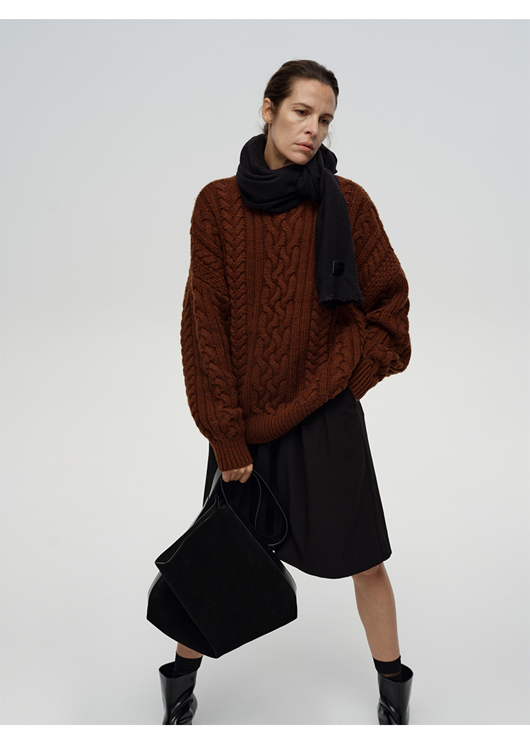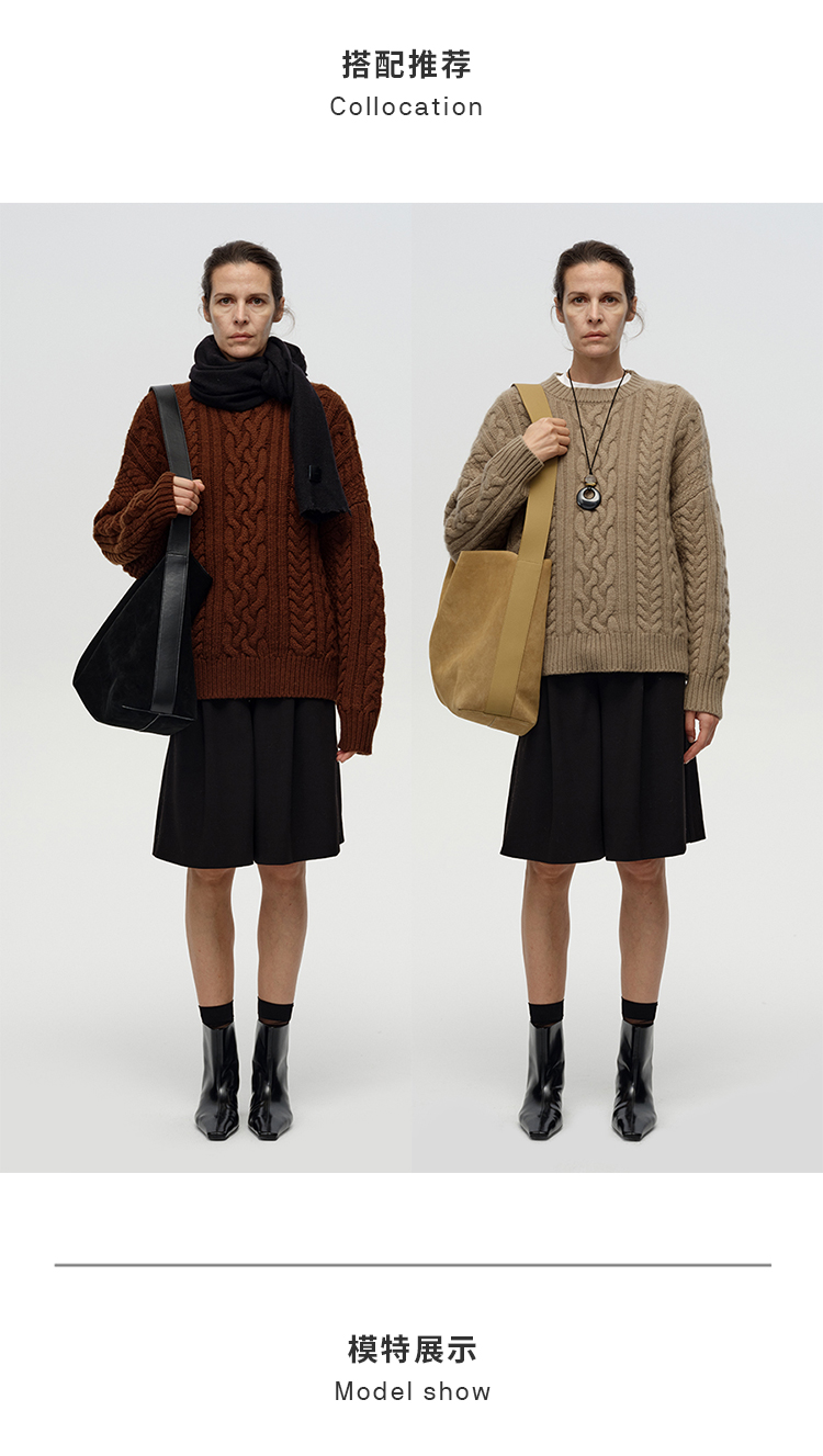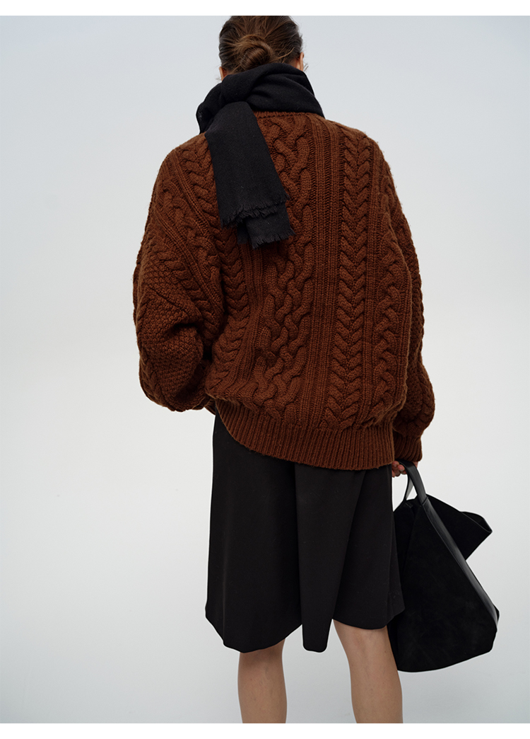 HIDEMI进口澳洲美利奴羊毛粗棒针绞花花针加厚款廓形宽松圆领套头大毛衣 鼠尾草灰绿|复古红棕