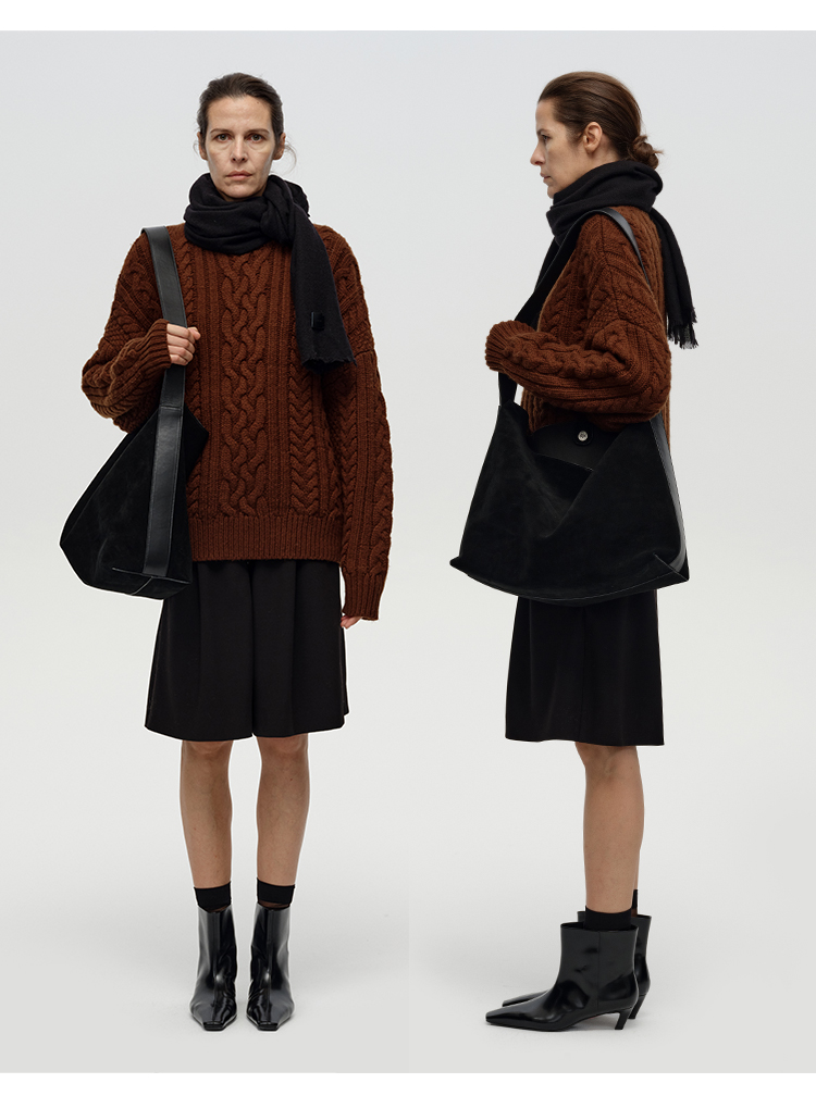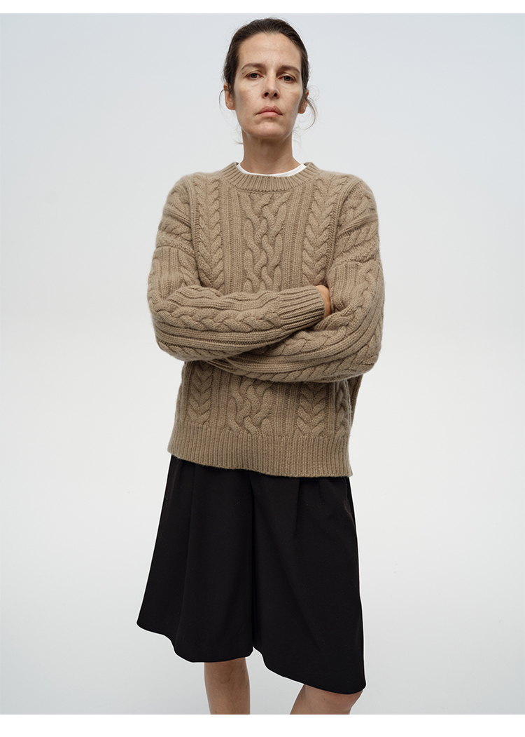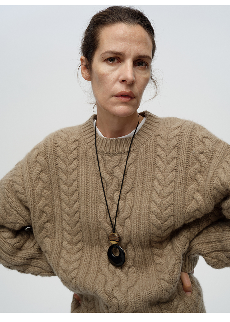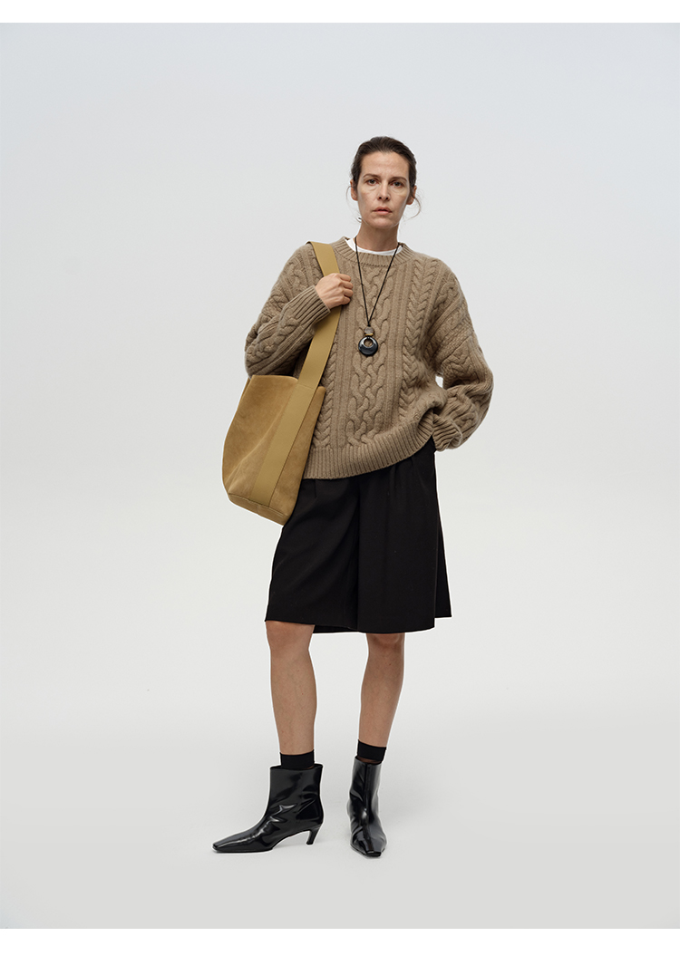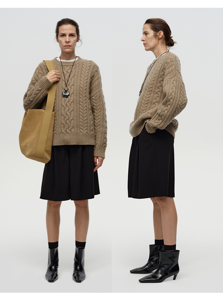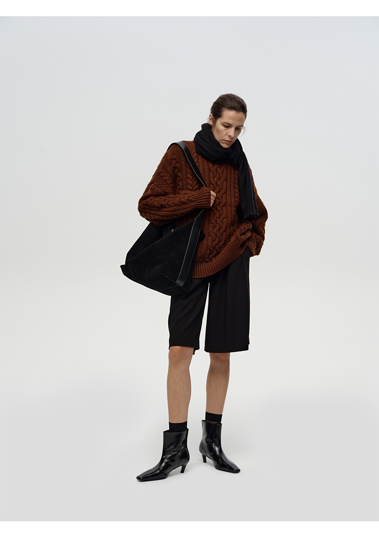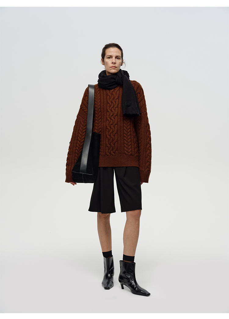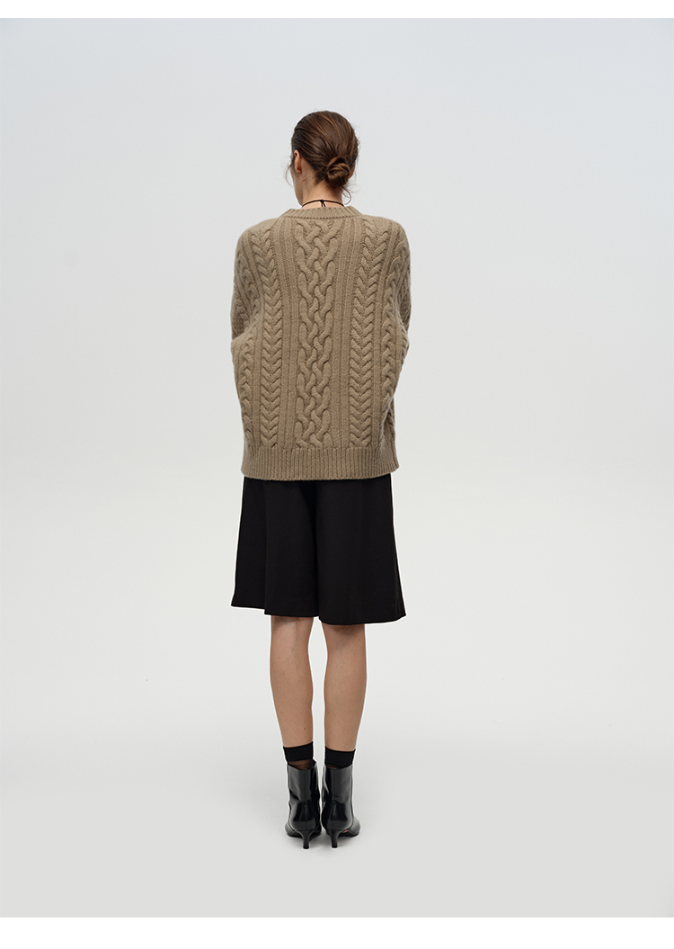 HIDEMI进口澳洲美利奴羊毛粗棒针绞花花针加厚款廓形宽松圆领套头大毛衣 鼠尾草灰绿|复古红棕