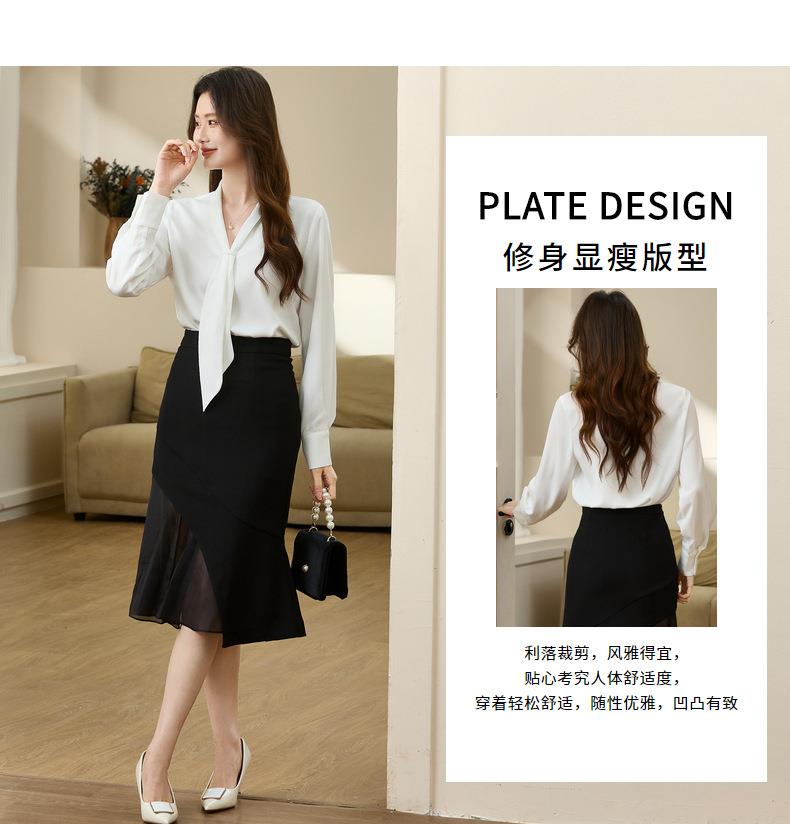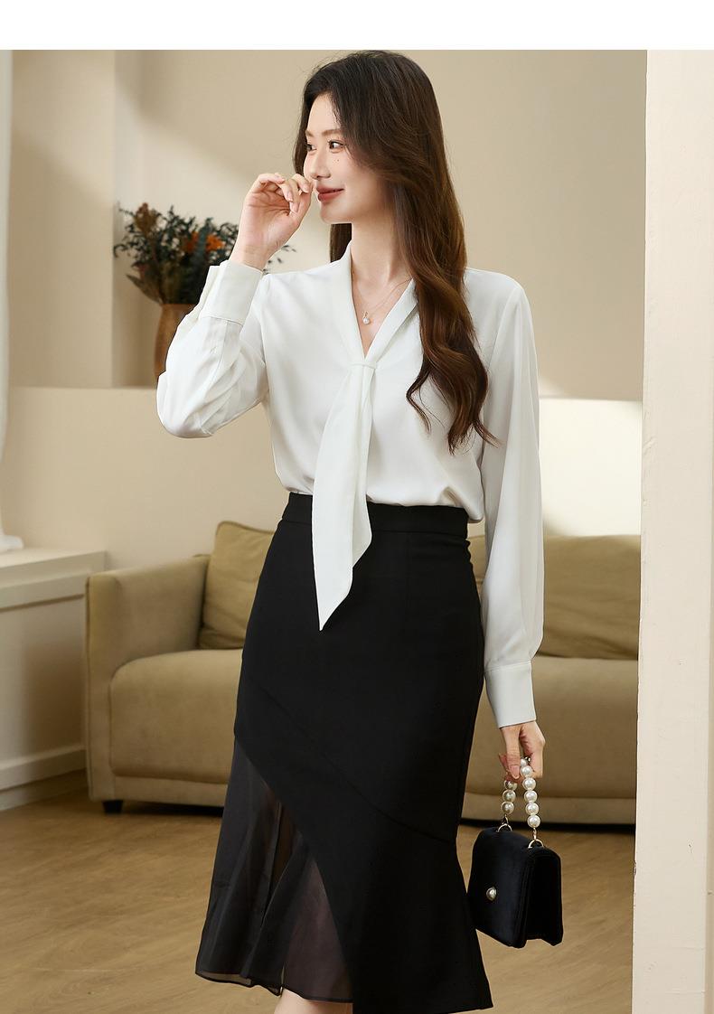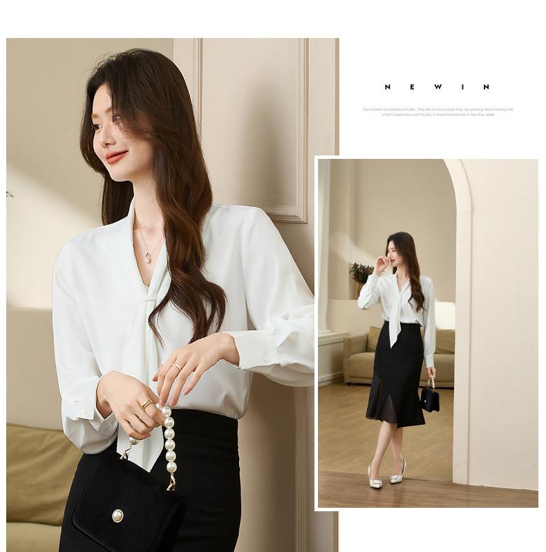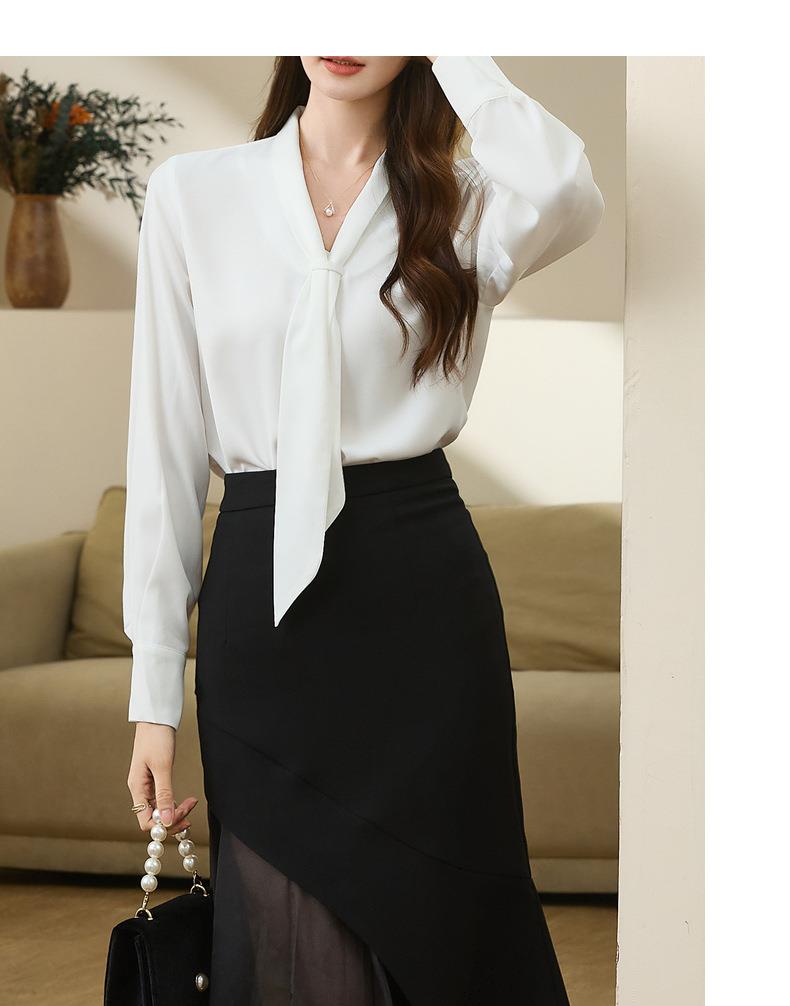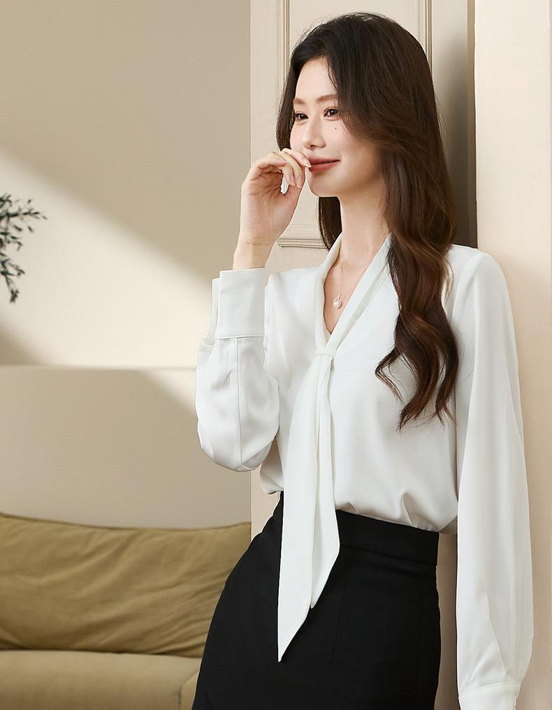 百姿 柔软垂顺通勤V领长袖衬衫2023早秋新款职业领带白衬衣231310