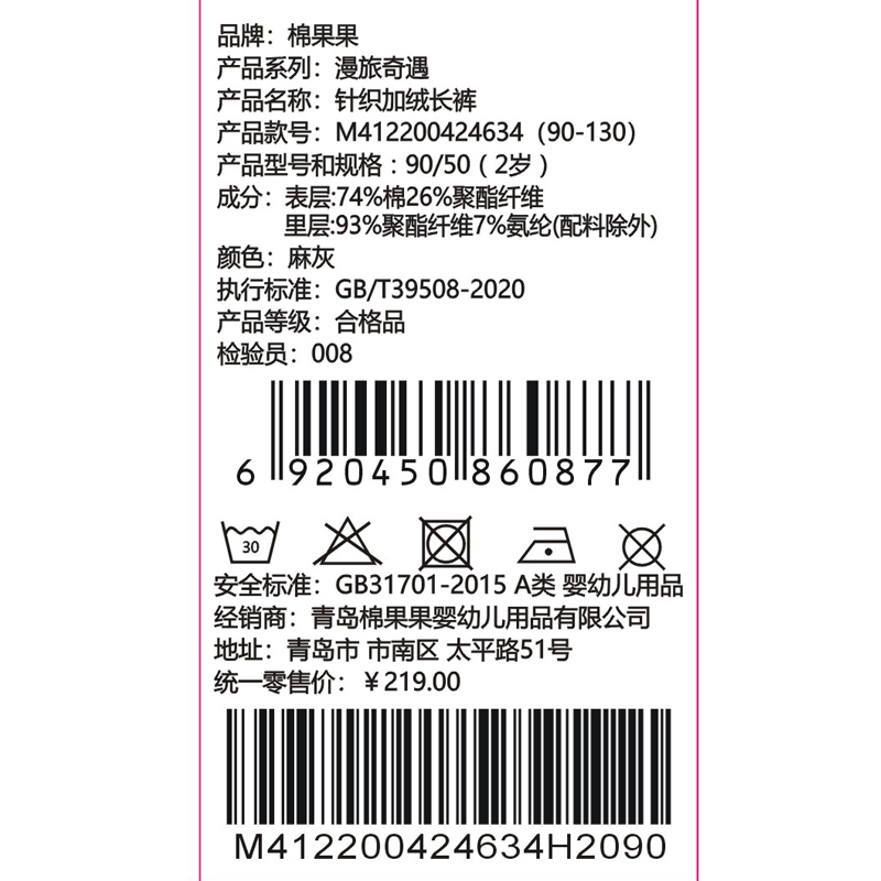 棉果果专柜同款冬季新品男童针织复合绒加绒长裤M412200424634