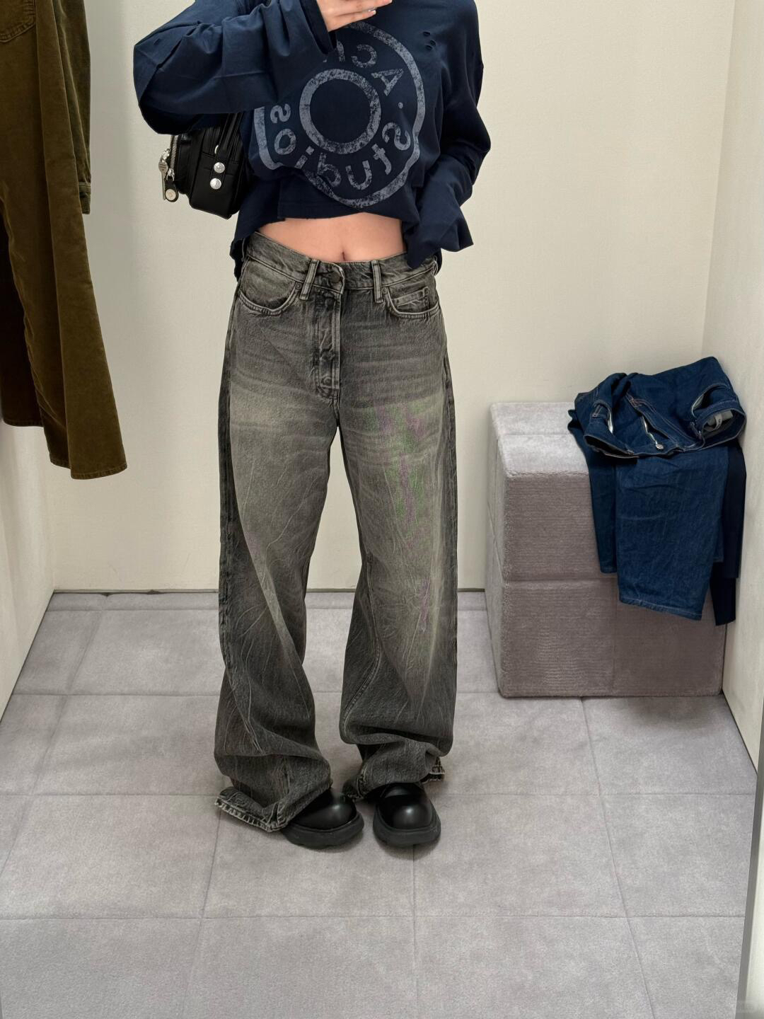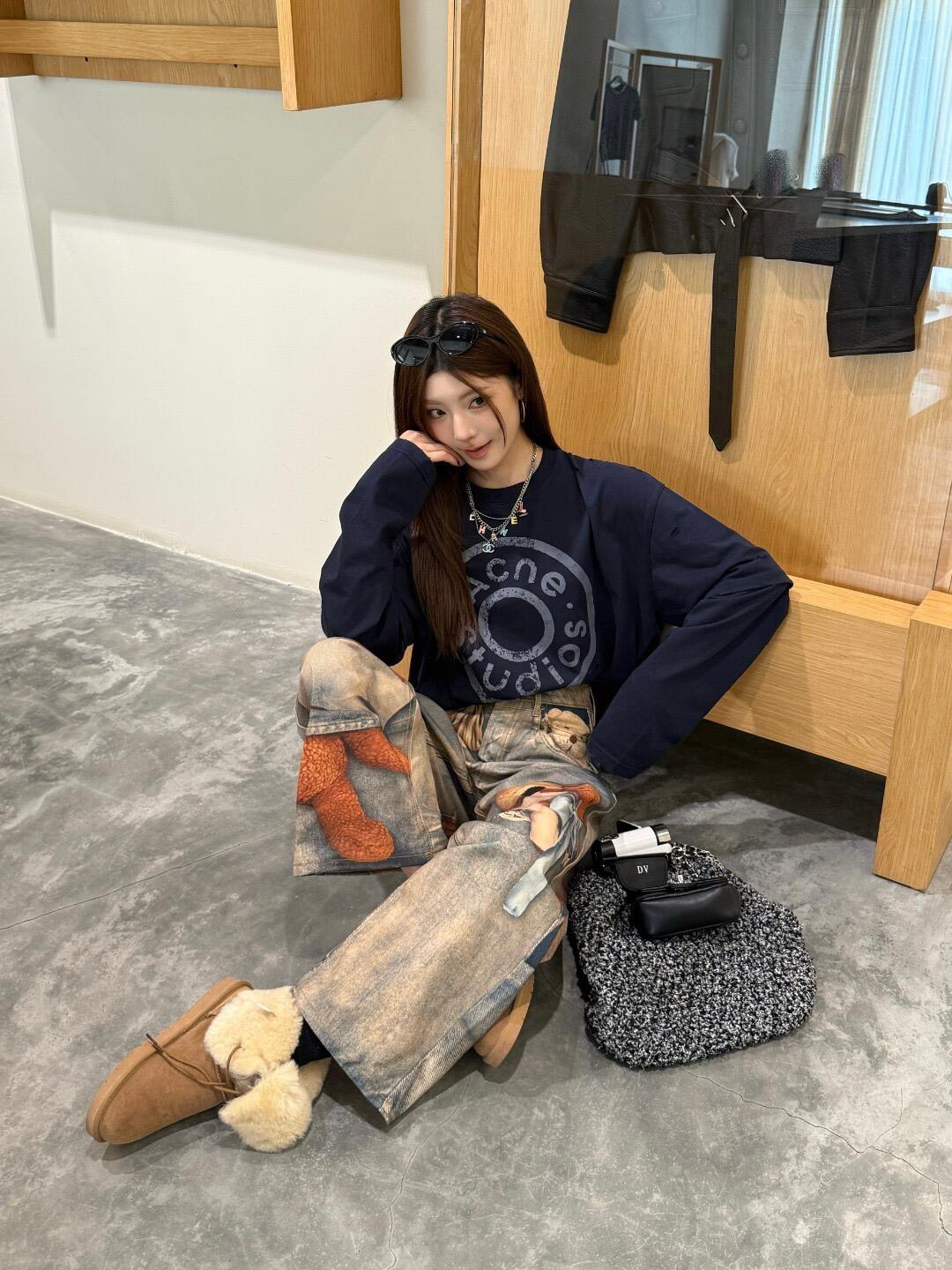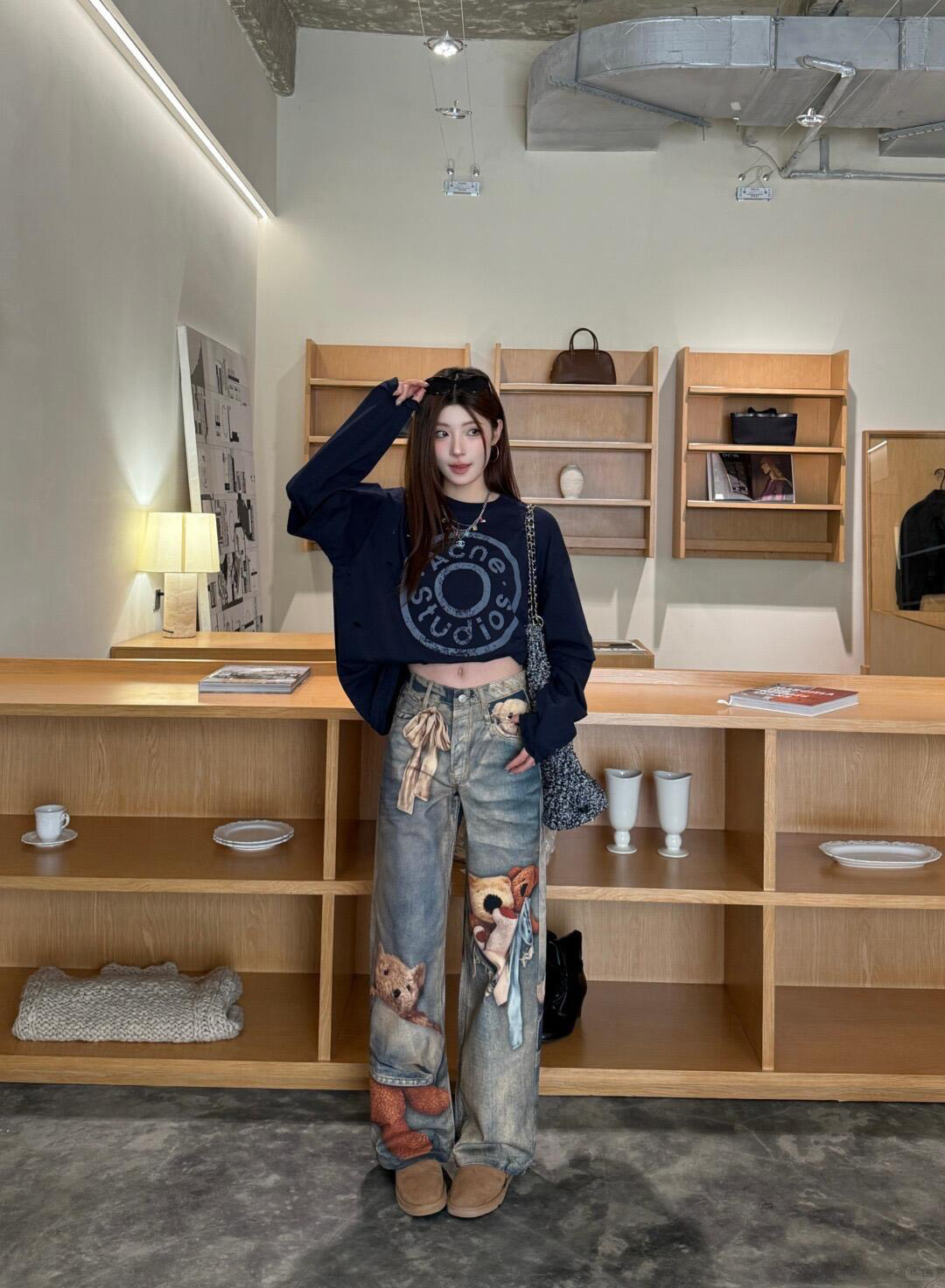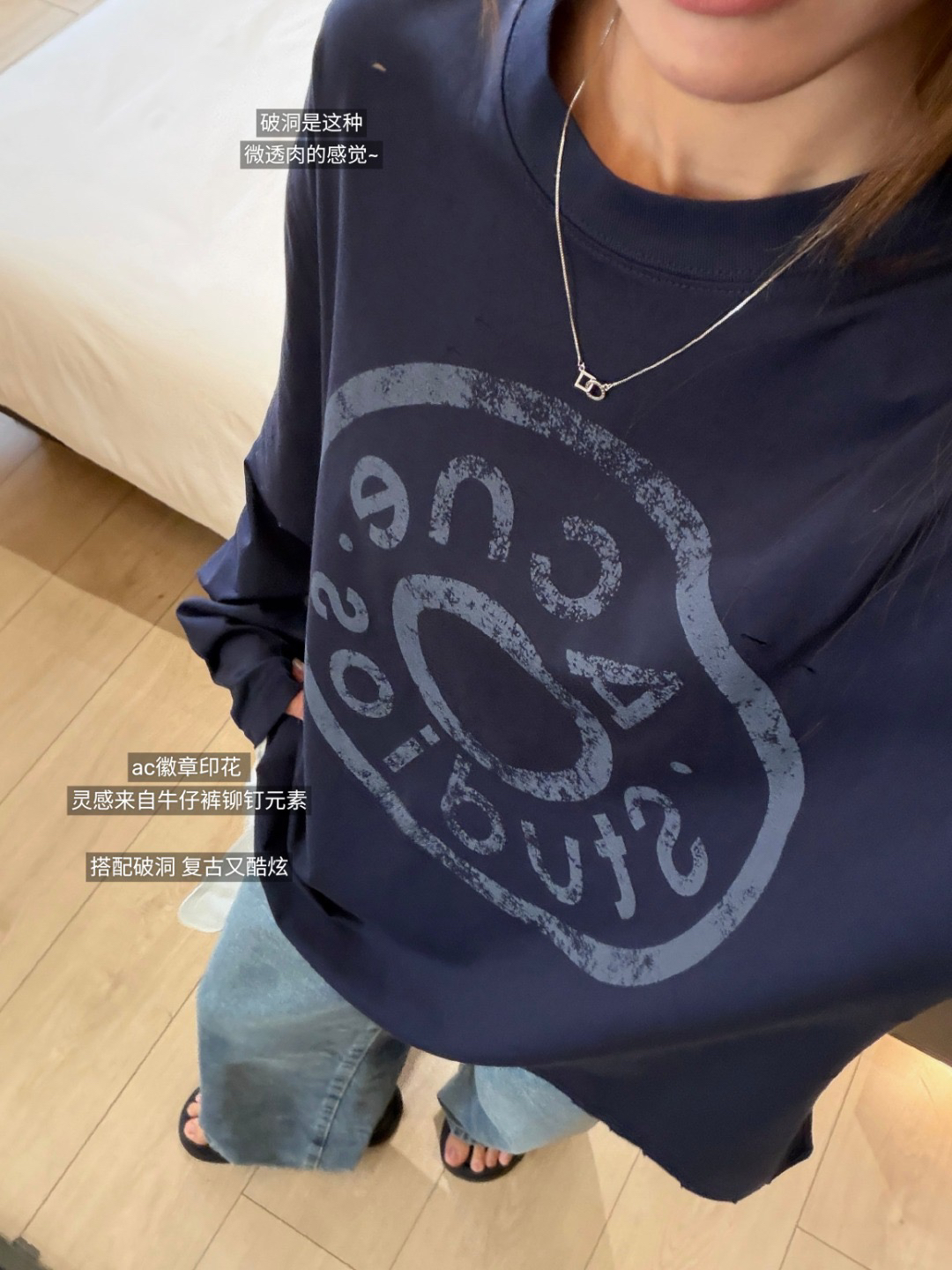 深蓝色主调 搭配胸前ac印花 灵感来自牛仔裤铆钉元素 很复古时尚