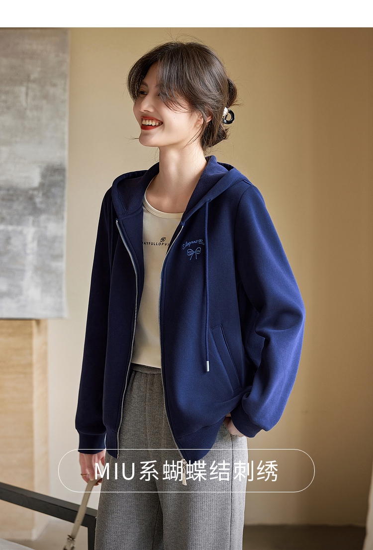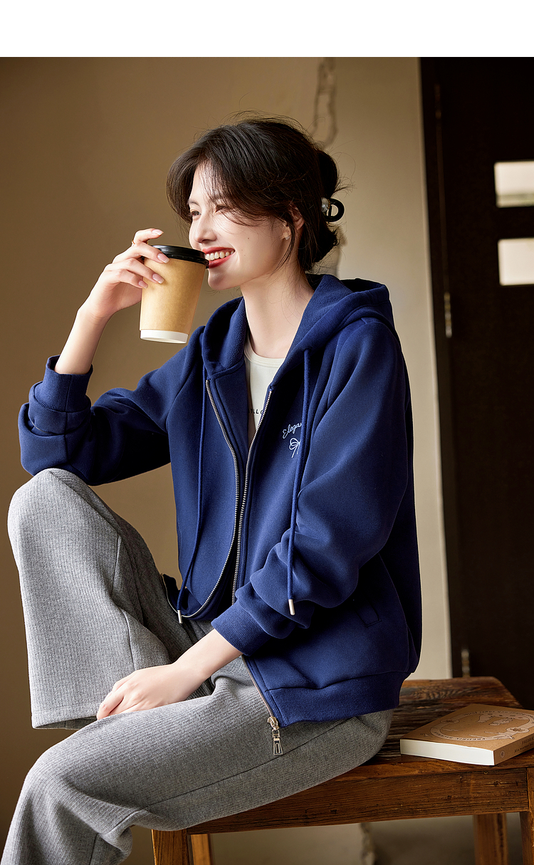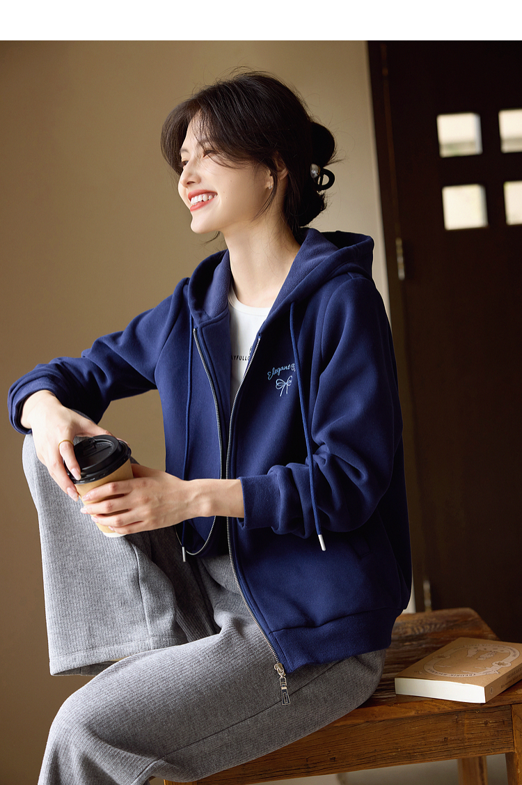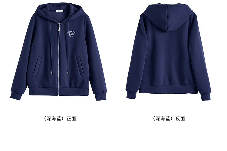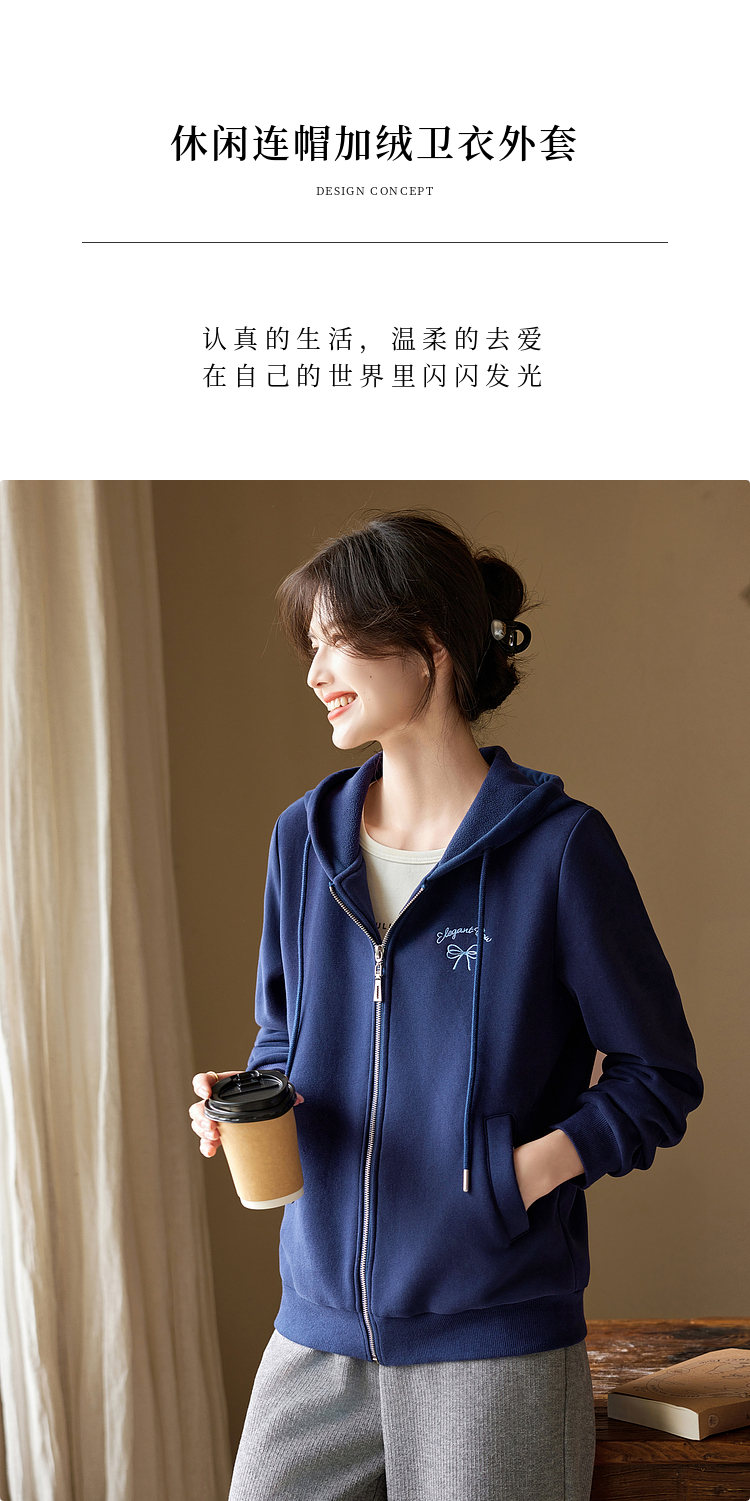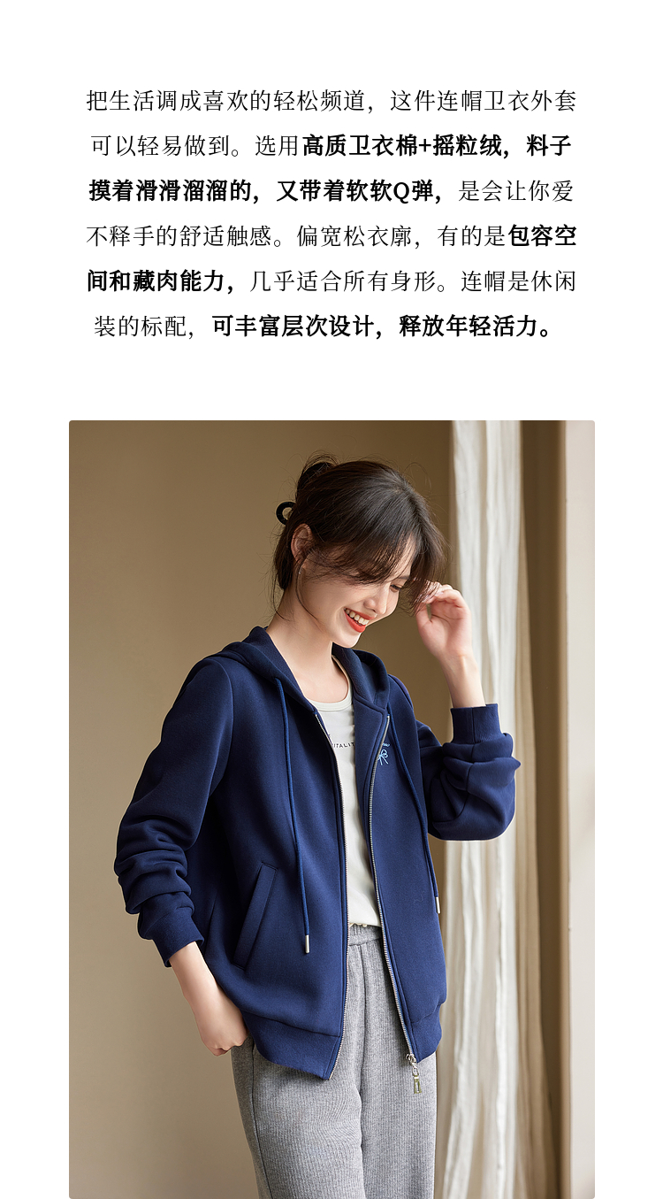【1件75折】熙世界宽松休闲拉链卫衣加绒女秋冬季刺绣加厚摇粒绒连帽开衫外套