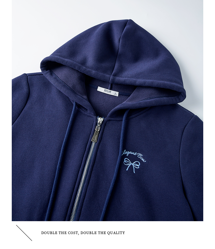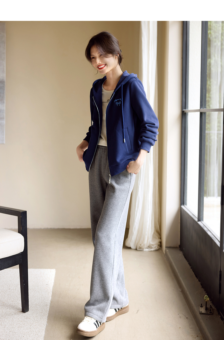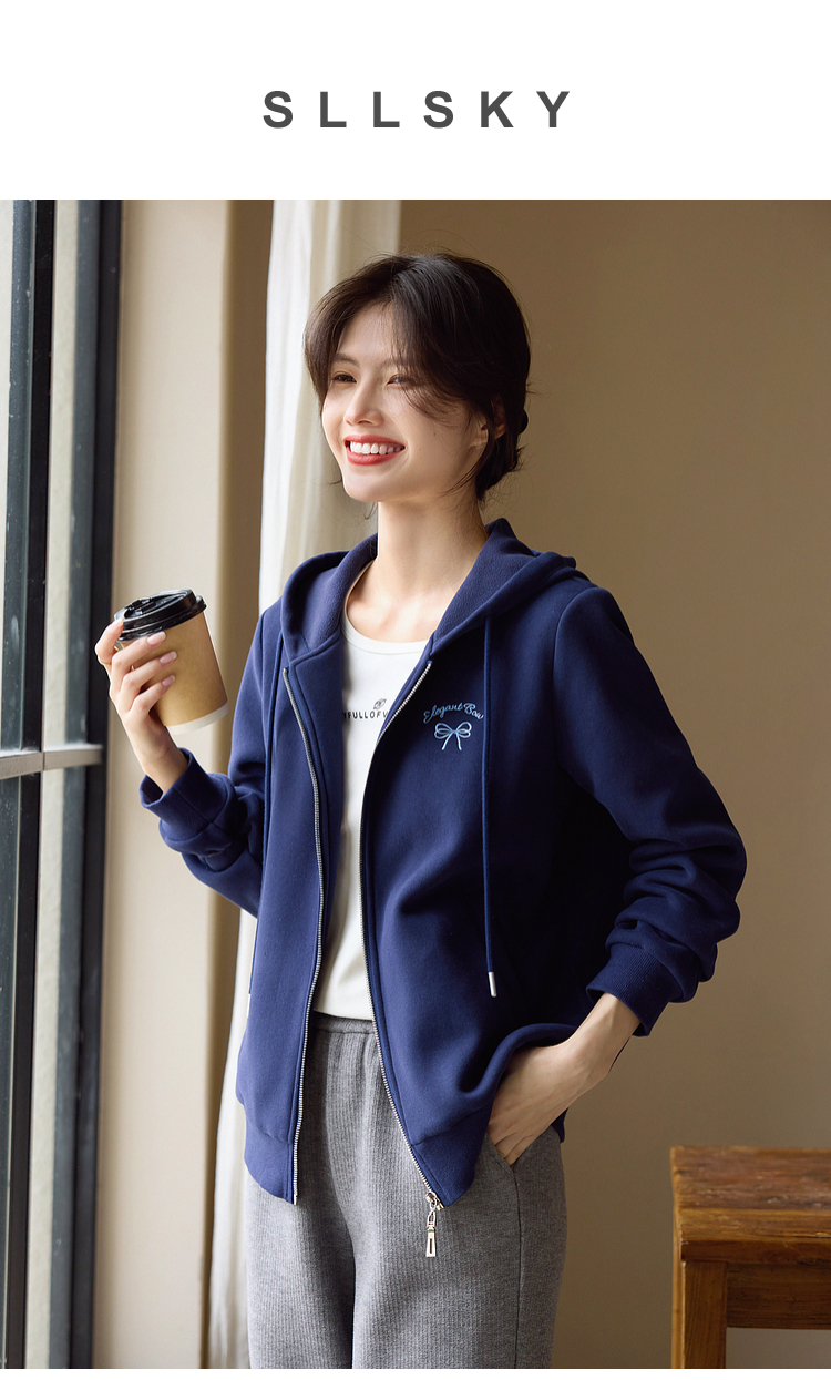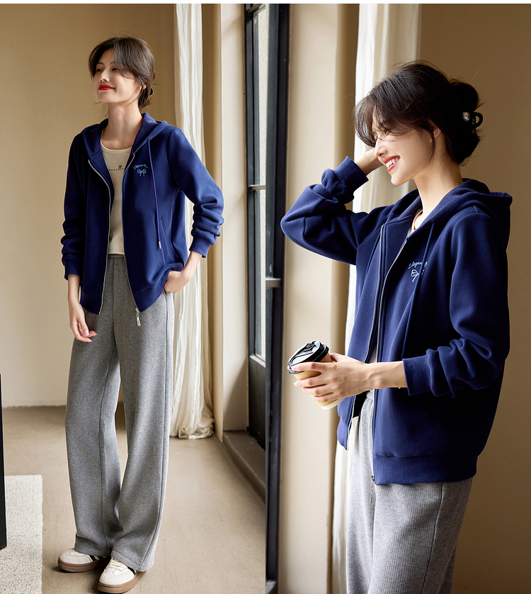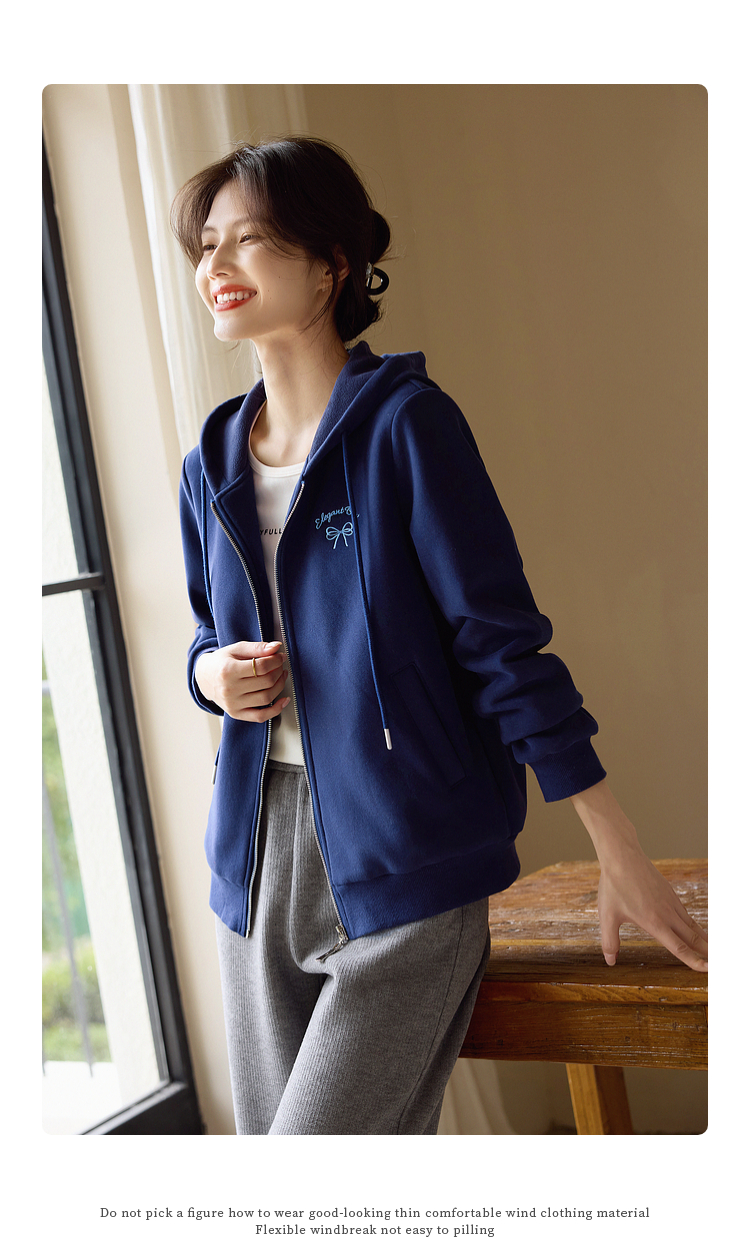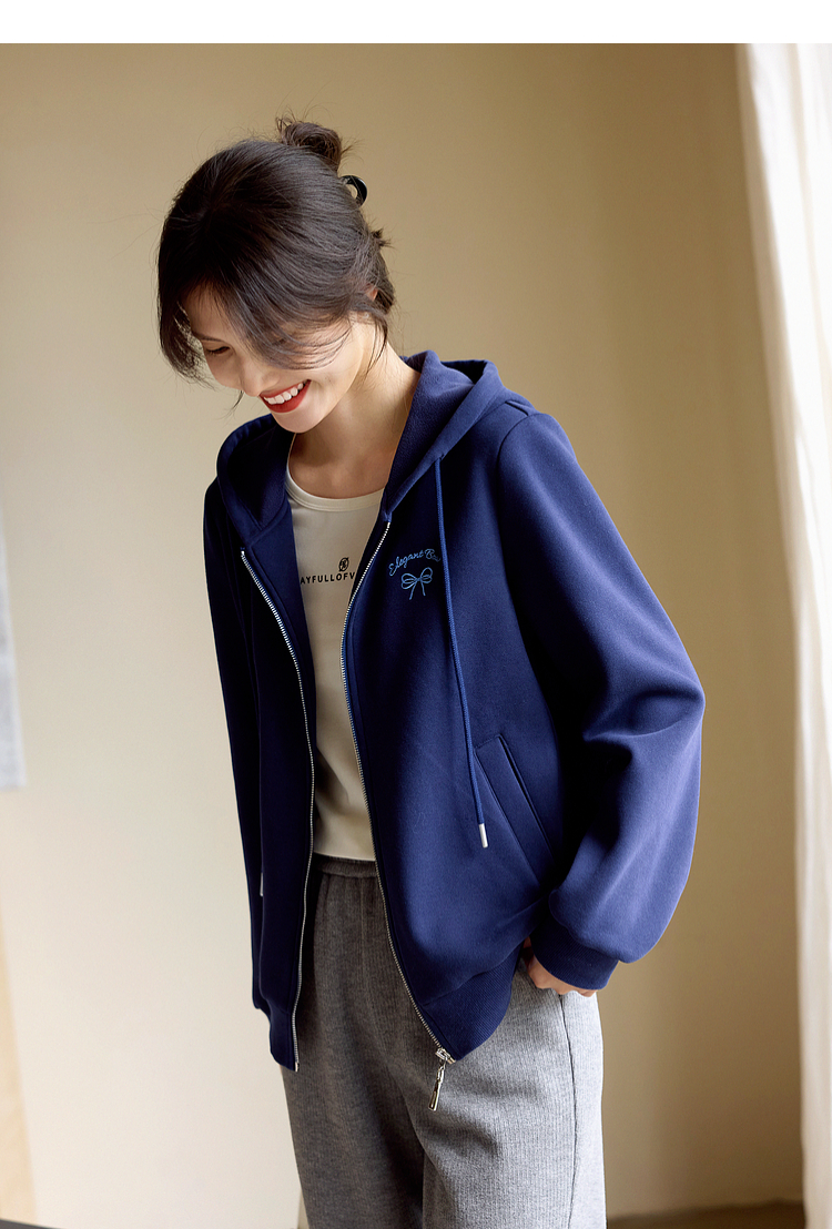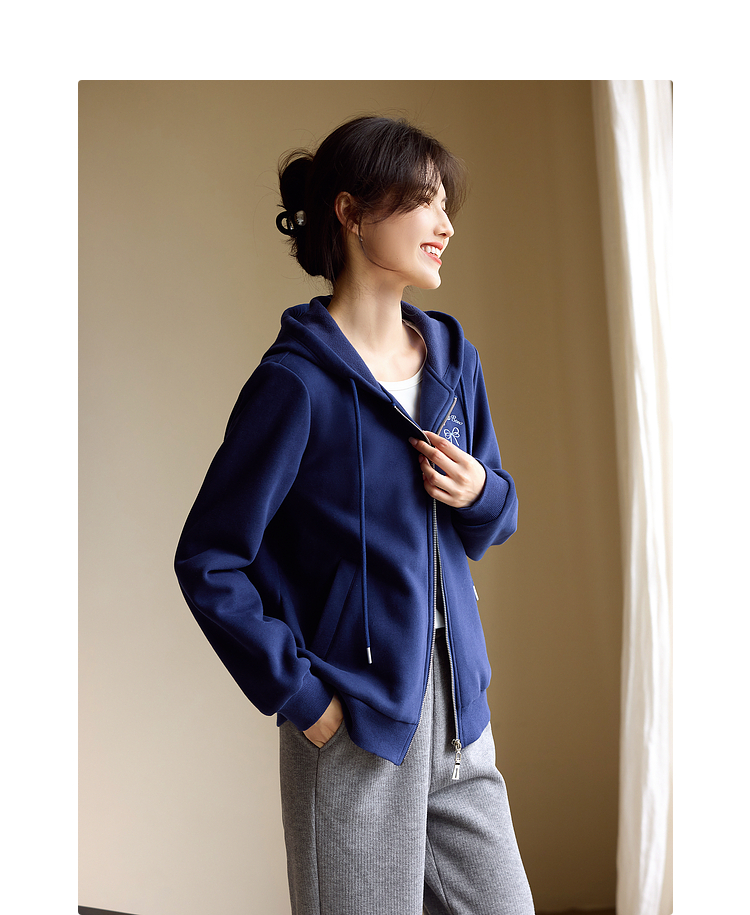【1件75折】熙世界宽松休闲拉链卫衣加绒女秋冬季刺绣加厚摇粒绒连帽开衫外套