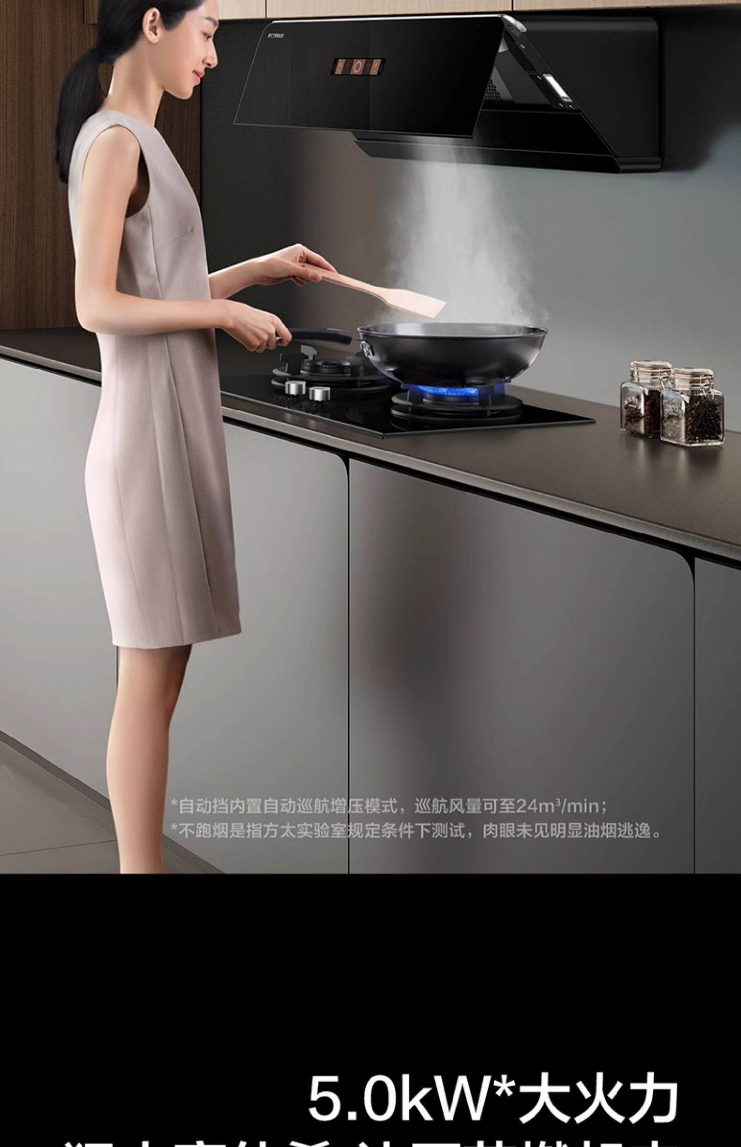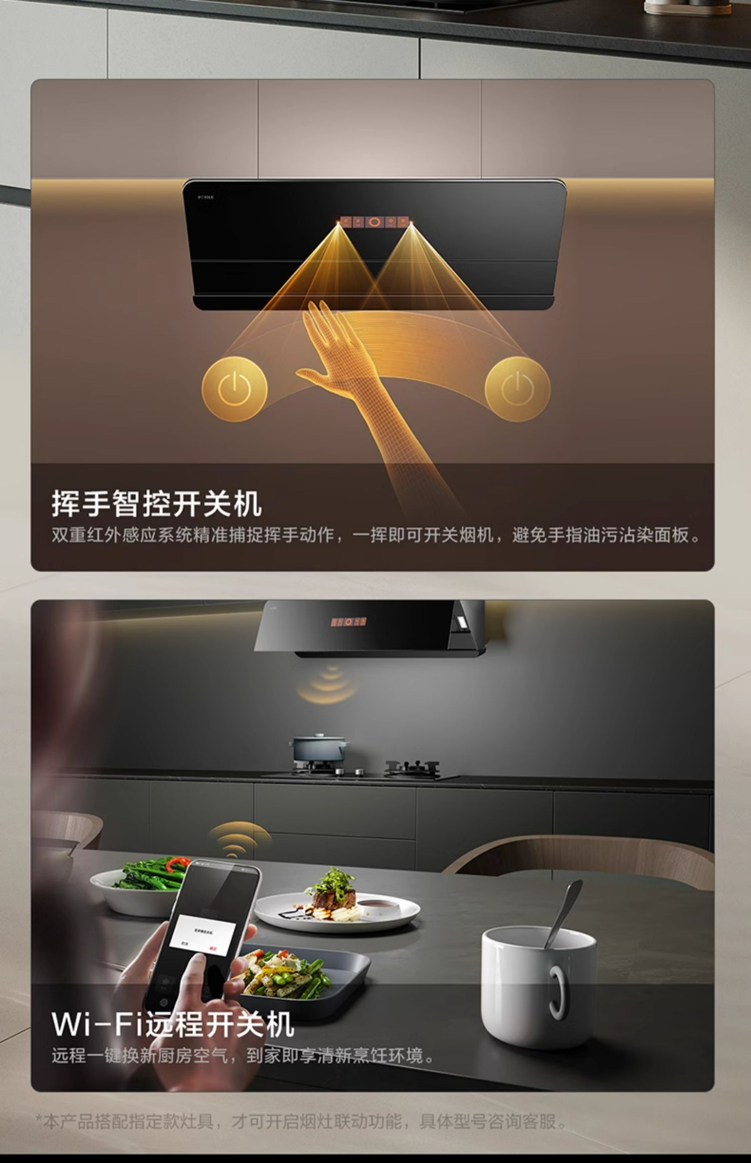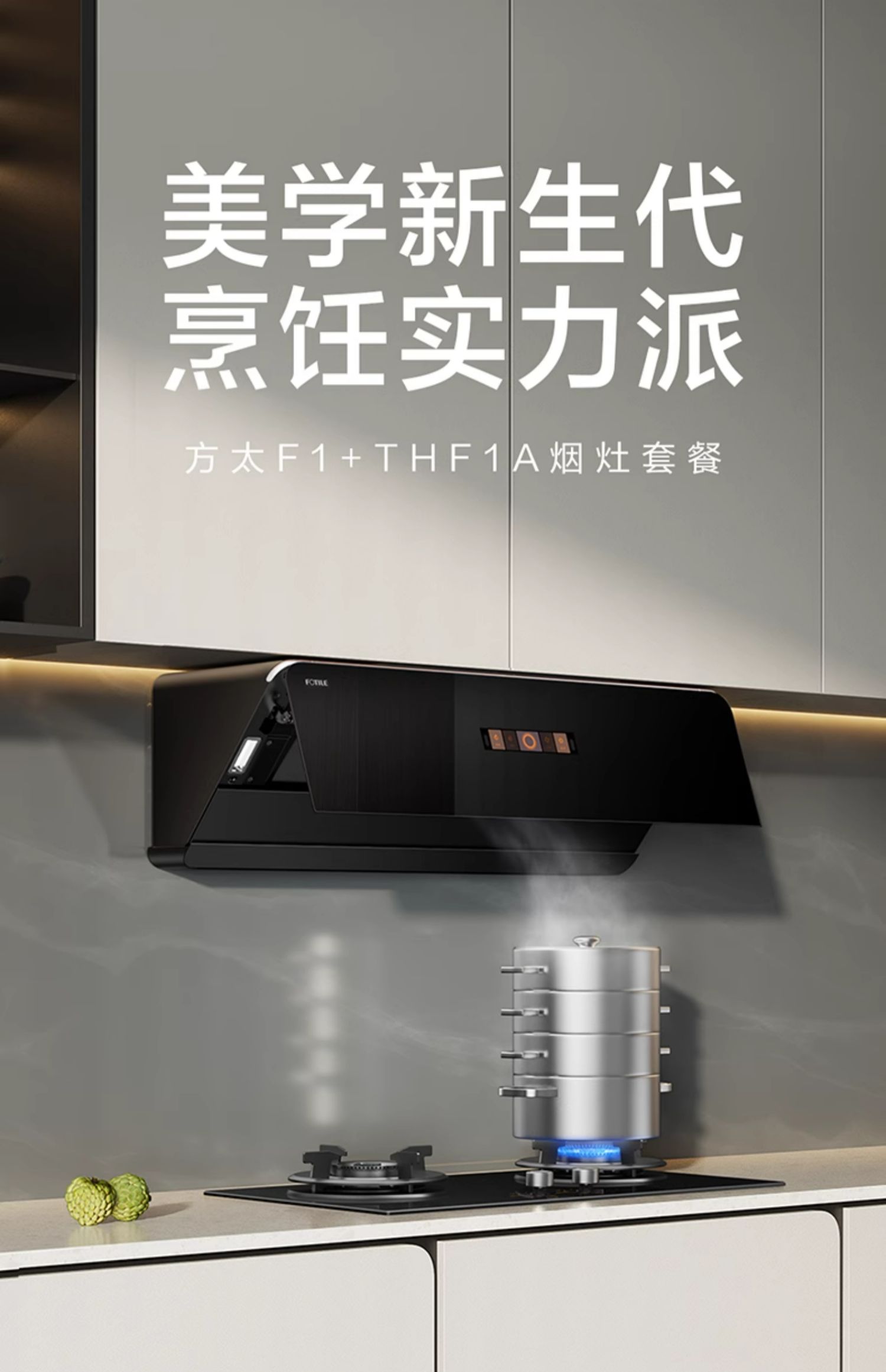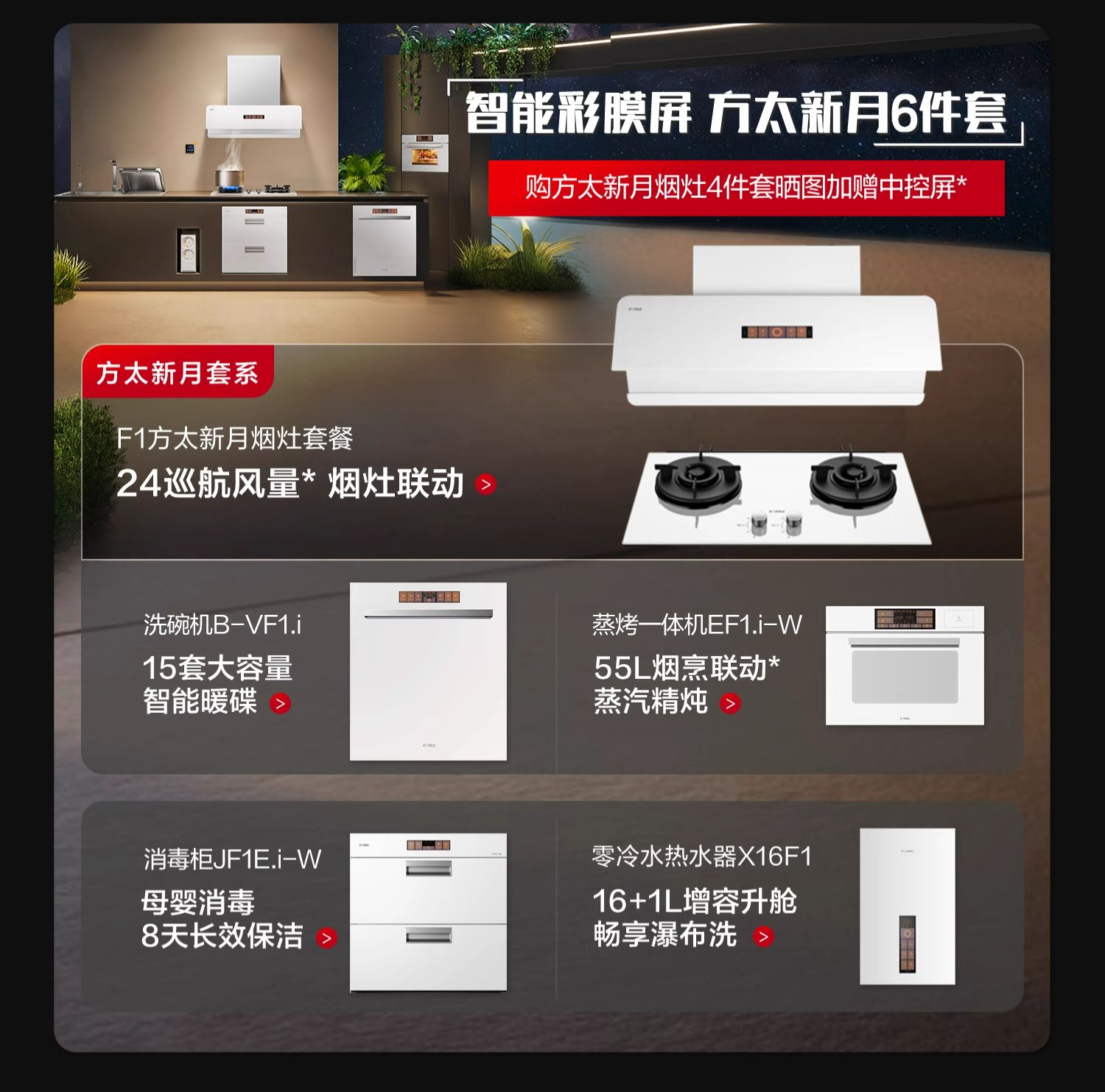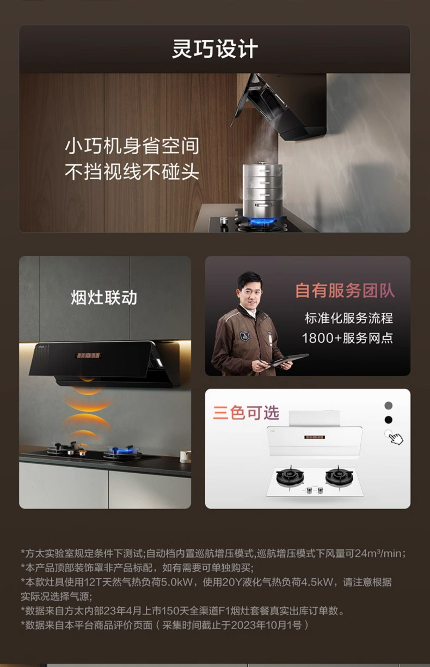 方太新月F1-W+THF1-W变频24m³巡航风量烟灶联动套装挥手开关家用白色侧吸油烟机燃气灶套餐5.0kw官方正品
