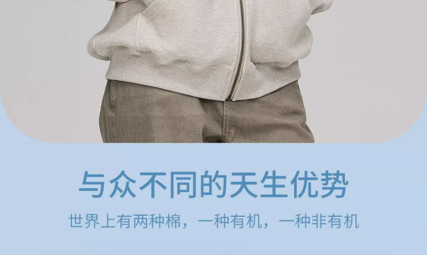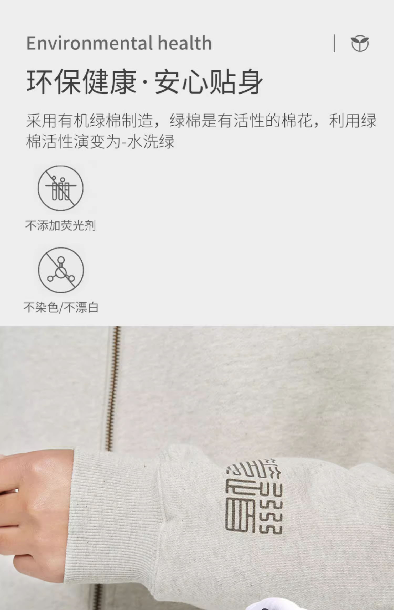 产品卖点:采用100%有机彩棉面料,大身用400克针织毛圈面料,袖口选用针织罗纹面料,穿着舒适,柔软,亲肤,透气,安全,健康,无荧光,无静电,拉锁选用高标准的YKK,拉头定制LOGO标识,彰显品牌文化。