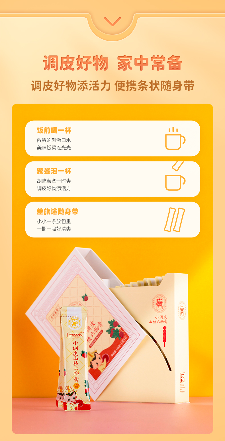 小调皮山楂六物膏是抽拉小盒包装,一盒14条条装膏方,随身携带很方便。