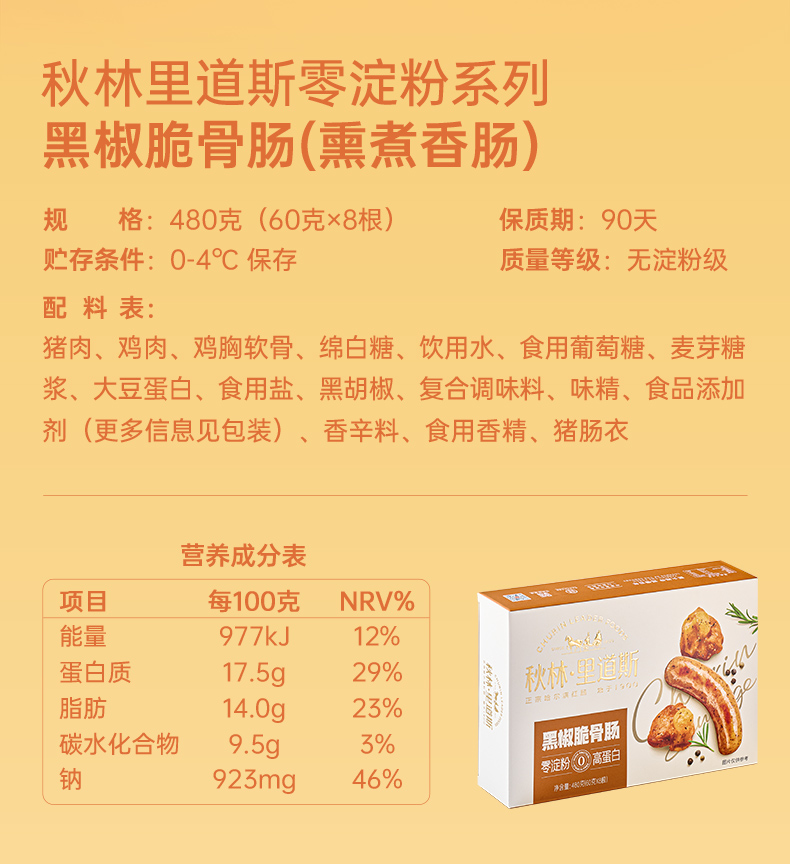 秋林里道斯旗舰店黑椒脆骨肠烤香肠即食480g/盒早餐肠