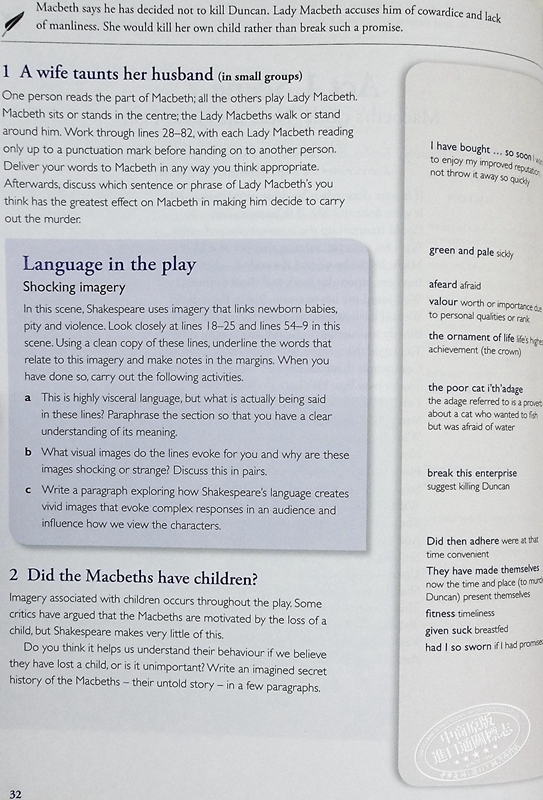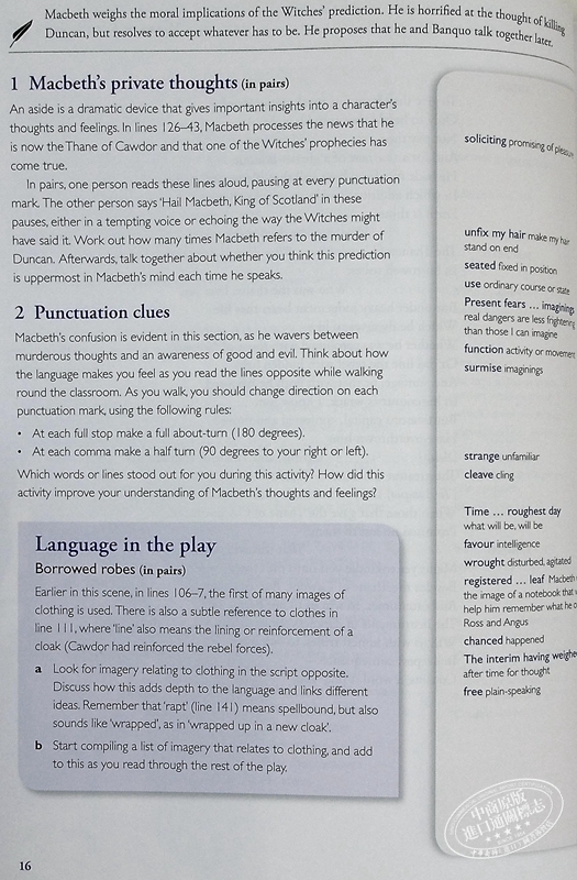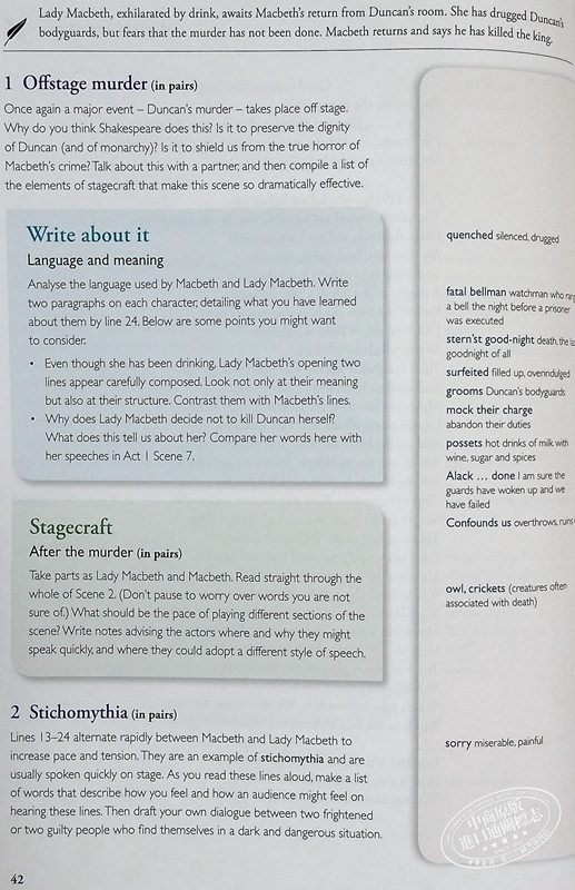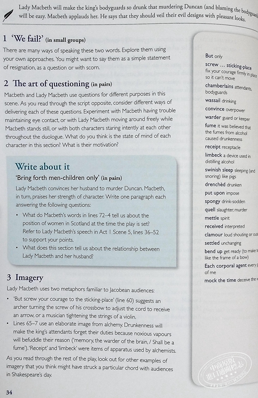 课堂莎士比亚的积极方法使学生能够以易于理解和创造性的方式融入莎士比亚的想象世界。 鼓励学生分享莎士比亚对语言的热爱、对性格的兴趣和戏剧感。课堂活动经过大幅修改和扩展,色彩丰富,以独特的“Stagecraft”、“Write about it”、“Language in the play”、 “角色”和“主题”功能。 扩展词汇表与播放文本对齐,以便于参考。 扩展的尾注包括广泛的“麦克白”和莎士比亚的论文写作指导。包括来自世界各地的“麦克白”表演的丰富、激动人心的彩色照片。