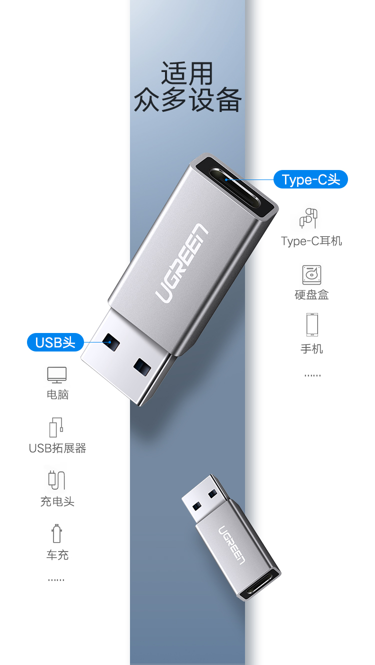 绿联 Type-C母转USB3.0公数据线转接头 USB-C母降噪耳机充电器转换头 通用三星小米华为荣耀手机电脑 30705灰
