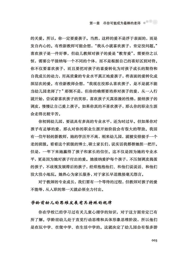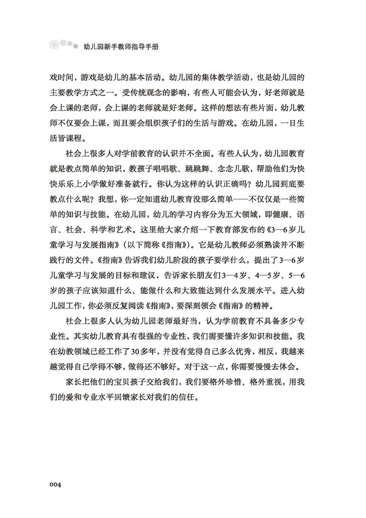 面对上述问题,初入职的幼儿教师应该怎么解决呢?《幼儿园新手教师指导手册》这本书给出了接地气的答案。作者运用贴心的话语和生动的案例,阐述 了各种问题的应对方法。本书没有“高大上”的语言和晦涩的理论,有的只是手把手的实操指导。新教师可以通过阅读这本书,在幼教道路上少走弯路,获得扎实的专业成长。