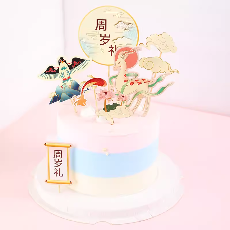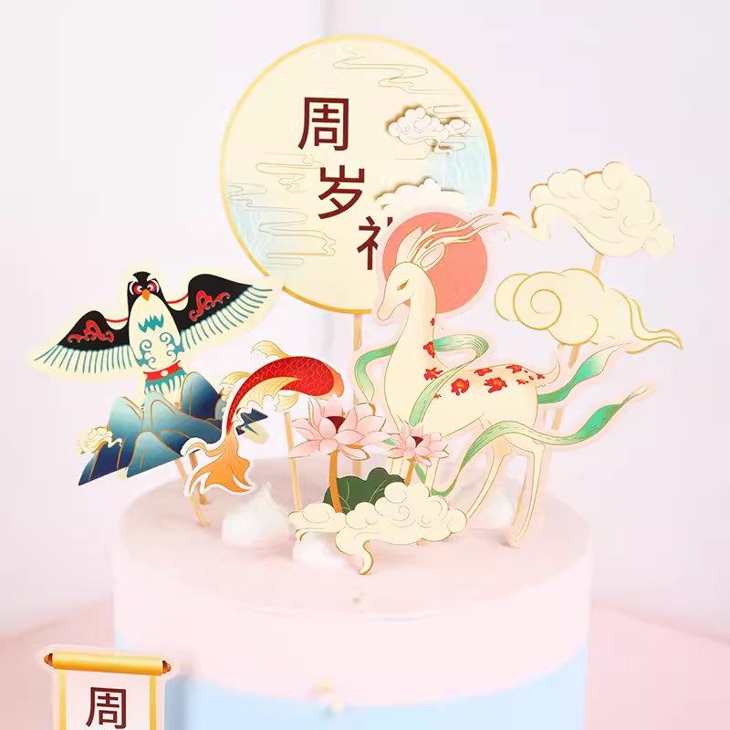 周岁礼装饰插件 新中式国风宝宝宴周岁礼 甜品台插件 鲤鱼麋鹿祥云燕子荷花插件