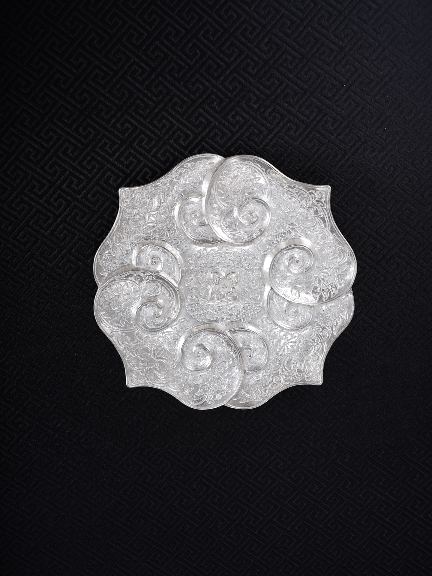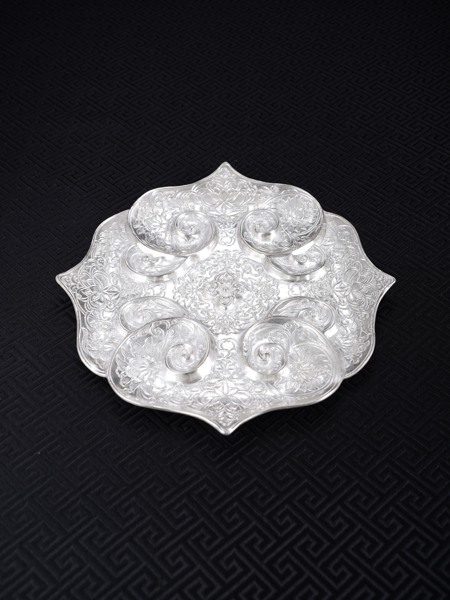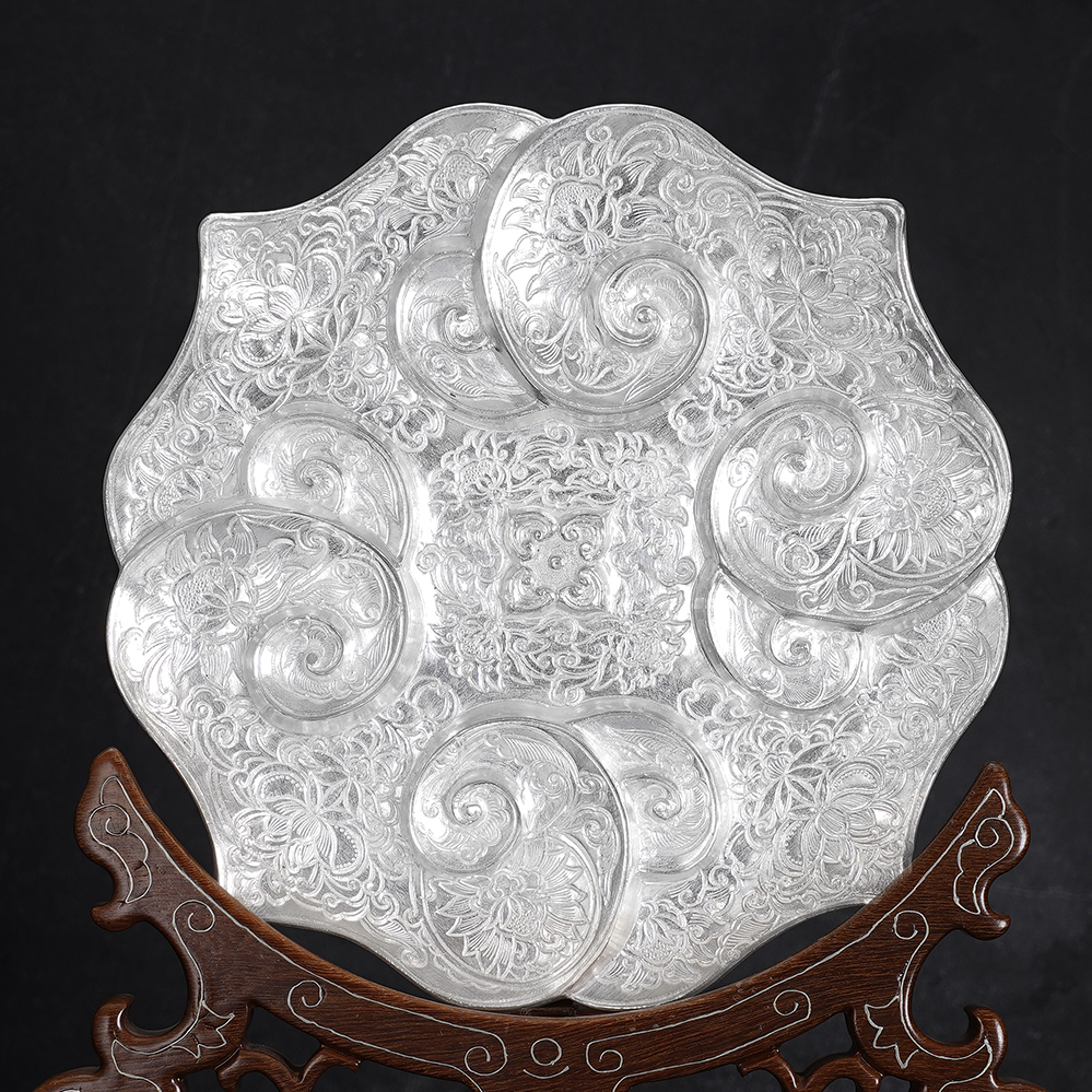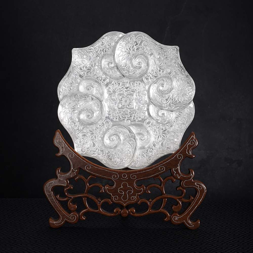 【寓意】:作品设计灵感源自南京博物院元代如意云纹金盘,采足银材质1:1复刻锻造。由四个如意云头相互叠合构成盘身,盘心饰以四个微凸小如意云纹,形成“四四如意”的吉祥构图。盘内外满饰錾刻缠枝花卉纹,寓意富贵吉祥、多子多福。工艺上融合锤揲与刘氏錾刻技艺,线条细密如发,繁复精妙,尽显刘氏传统银器制作技艺之精髓。