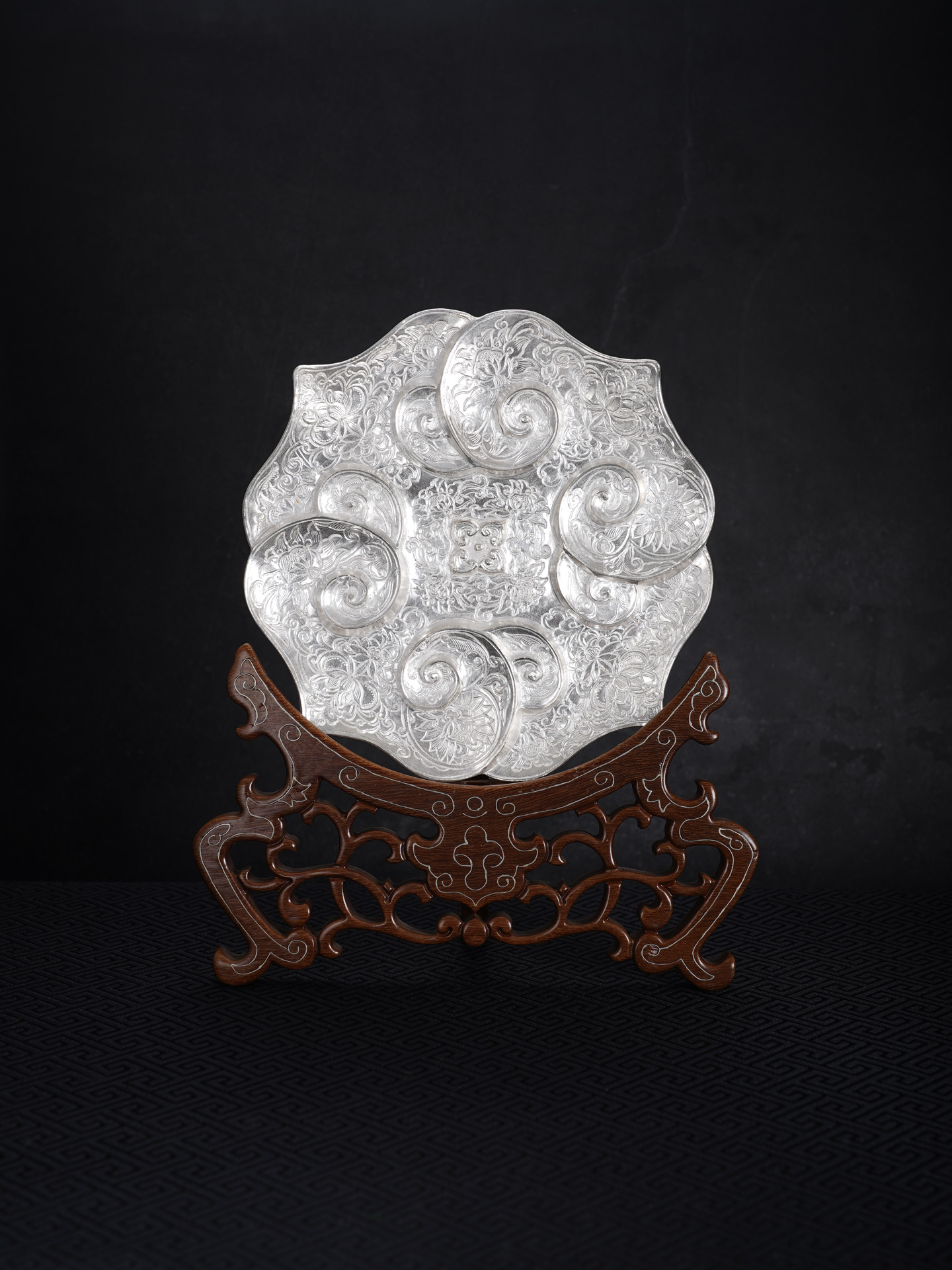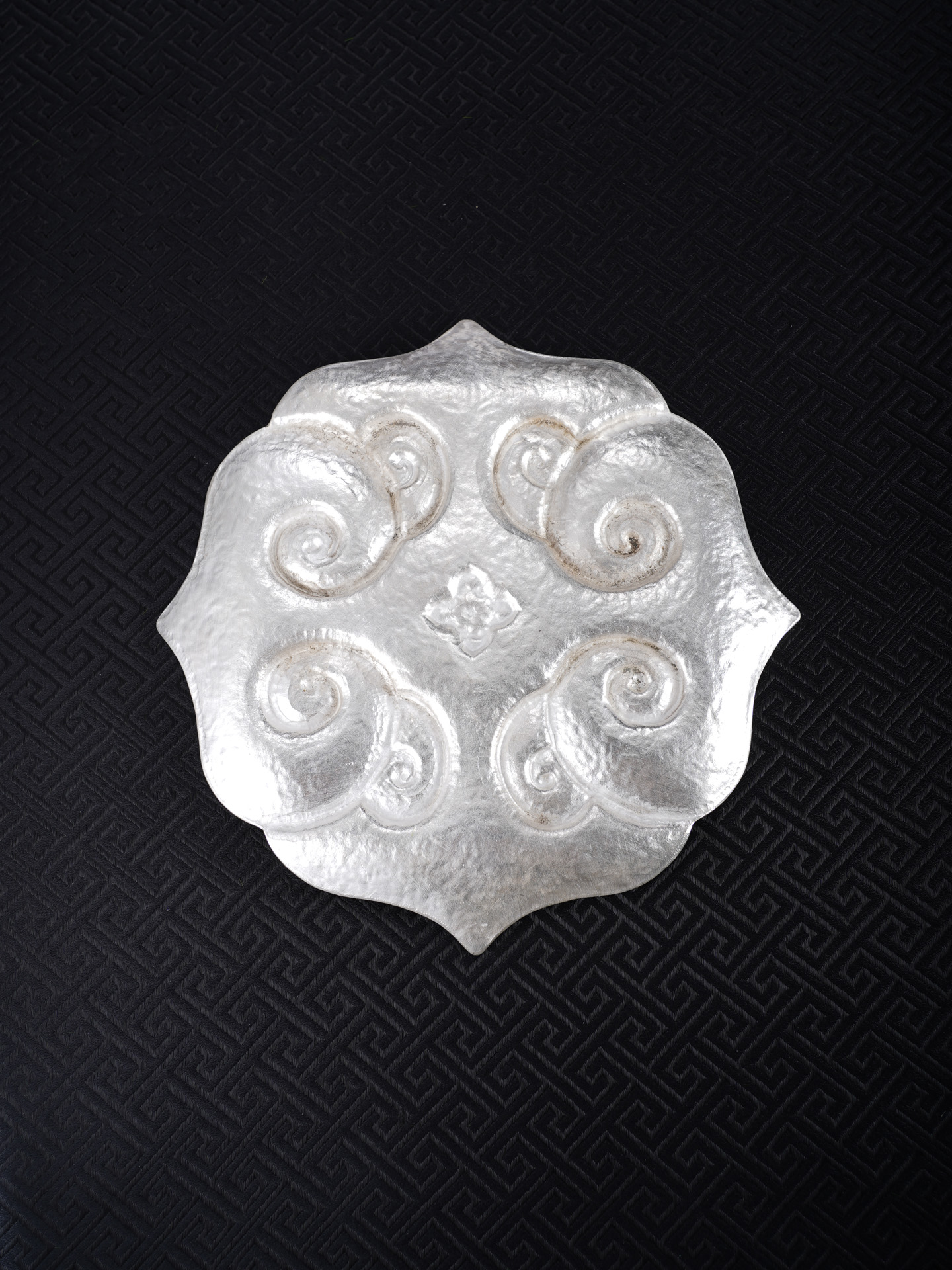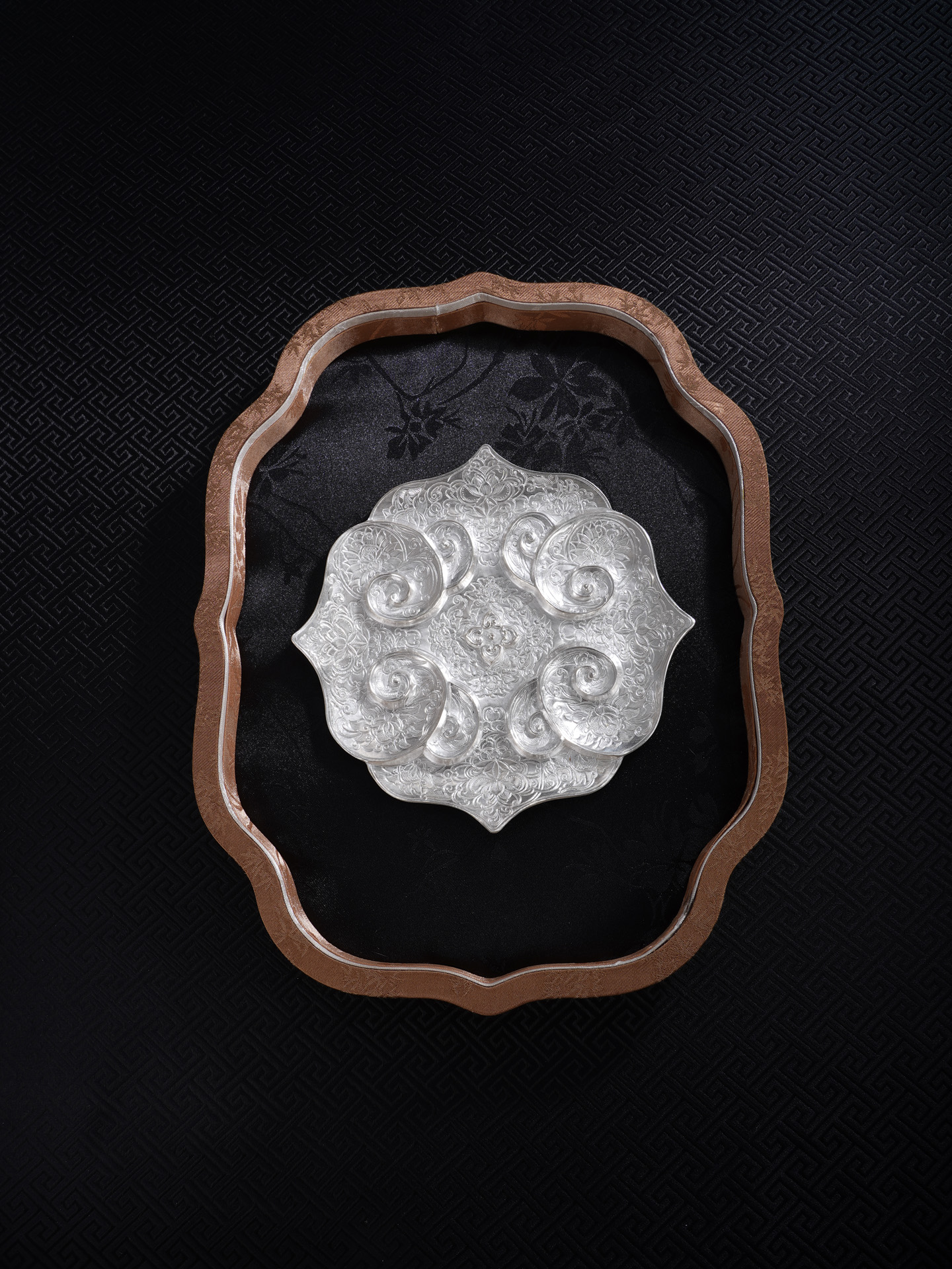 【寓意】:作品设计灵感源自南京博物院元代如意云纹金盘,采足银材质1:1复刻锻造。由四个如意云头相互叠合构成盘身,盘心饰以四个微凸小如意云纹,形成“四四如意”的吉祥构图。盘内外满饰錾刻缠枝花卉纹,寓意富贵吉祥、多子多福。工艺上融合锤揲与刘氏錾刻技艺,线条细密如发,繁复精妙,尽显刘氏传统银器制作技艺之精髓。