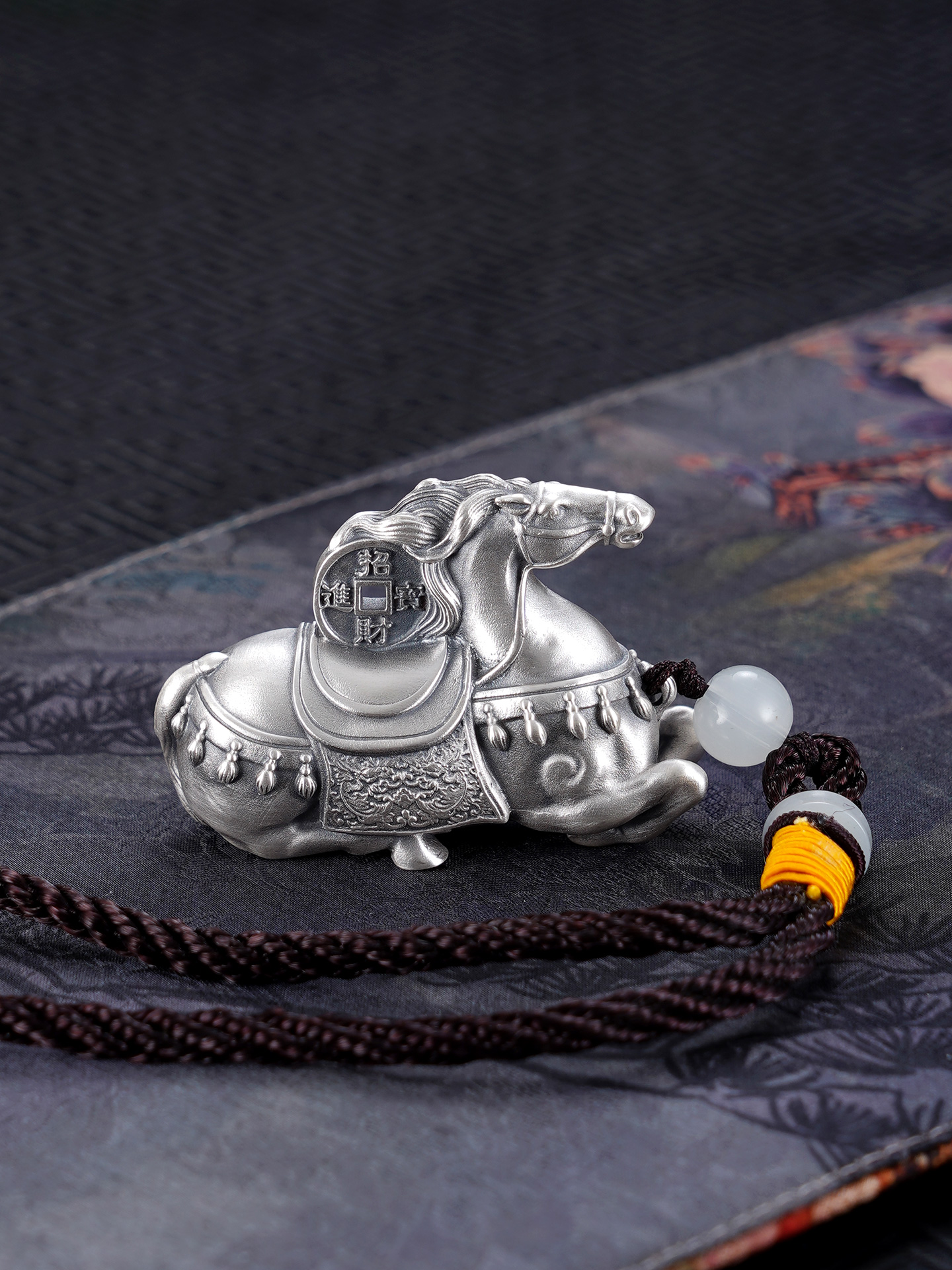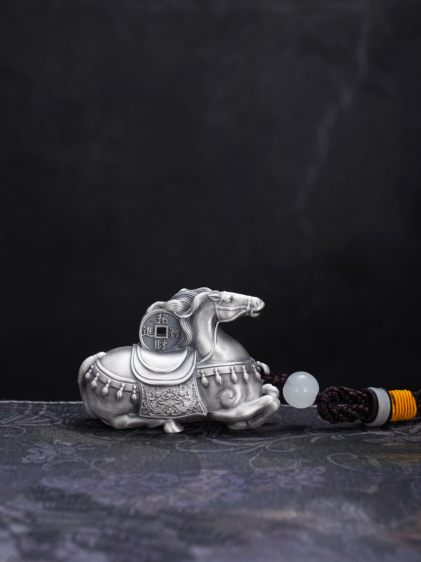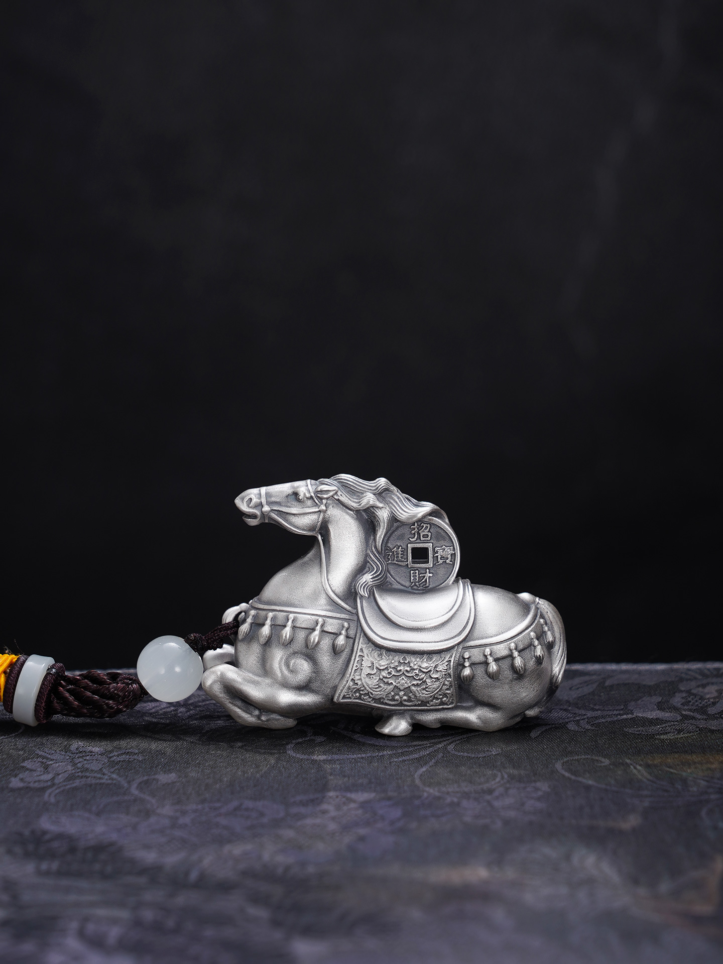 【寓意】:作品以俯身趴卧之姿呈现骏马形象,暗喻韬光养晦、蓄势待发;马背之上摆放铜钱的设计,象征“马上发财”、富贵可期。