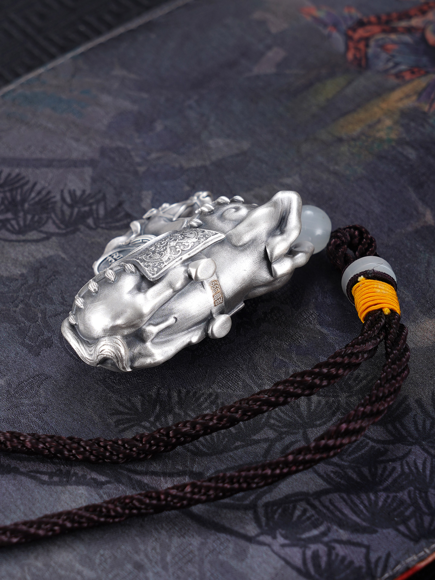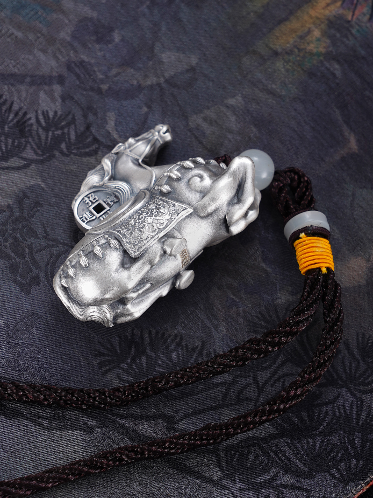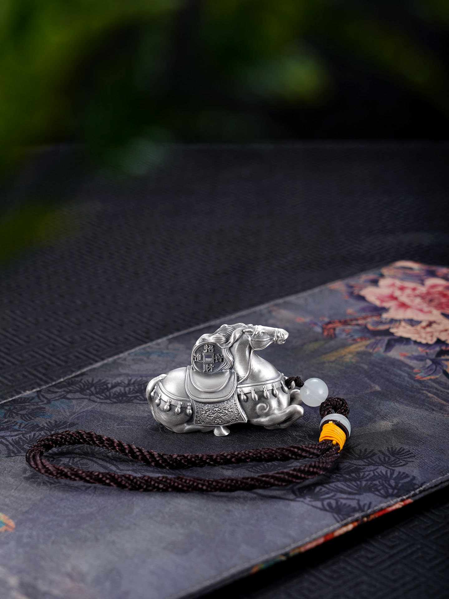 【寓意】:作品以俯身趴卧之姿呈现骏马形象,暗喻韬光养晦、蓄势待发;马背之上摆放铜钱的设计,象征“马上发财”、富贵可期。