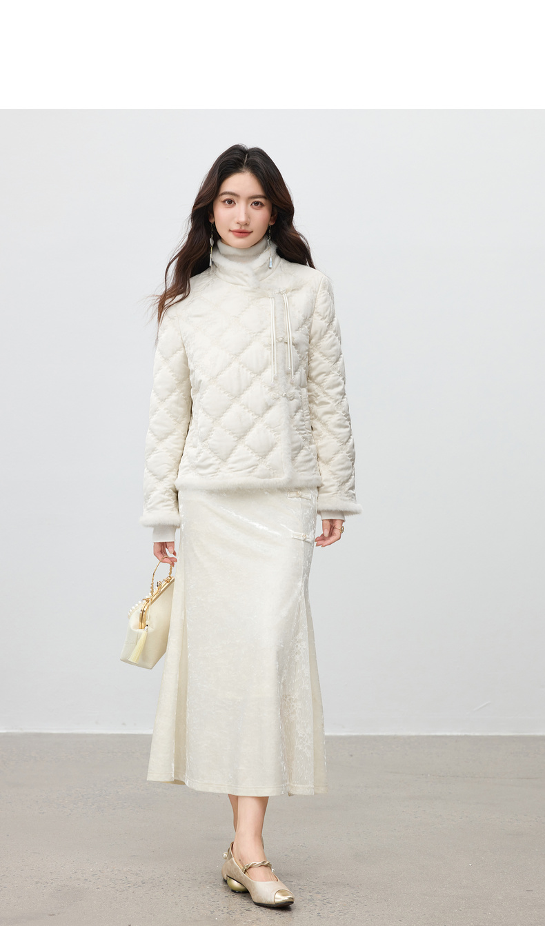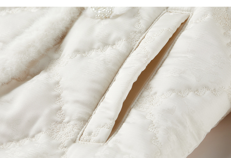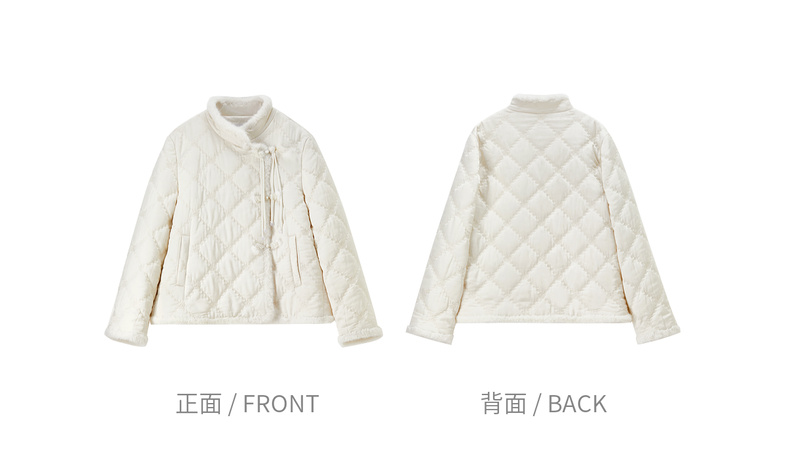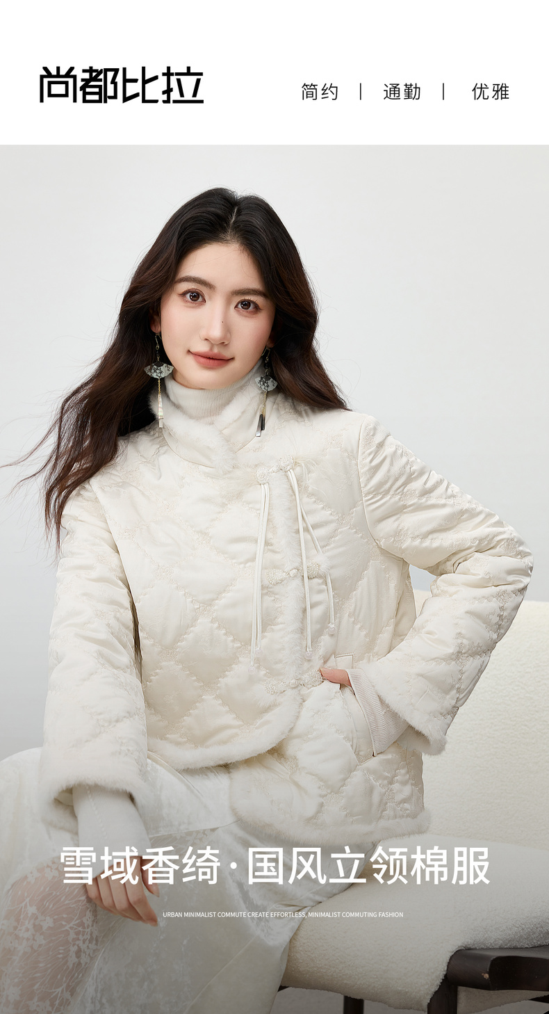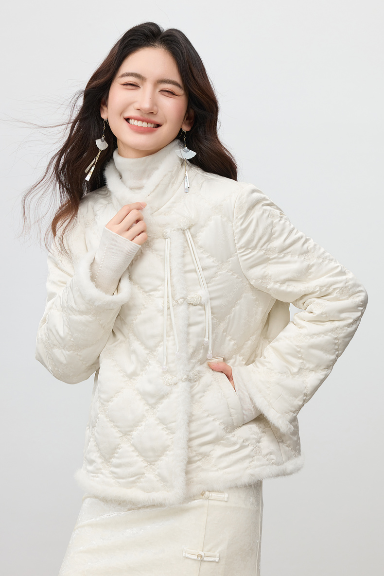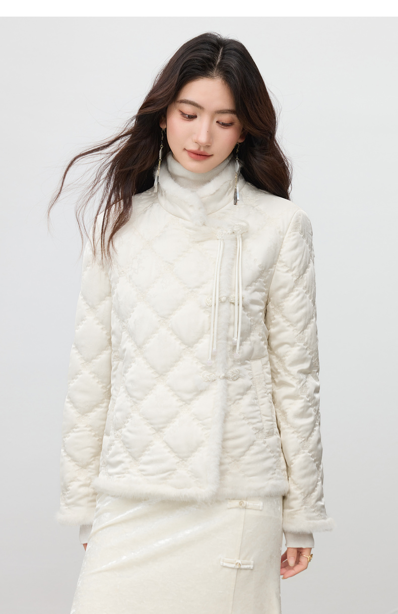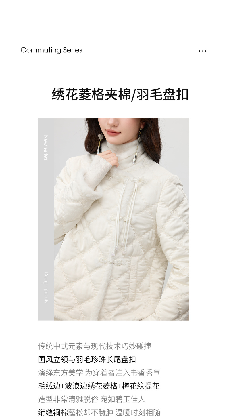 【内购】【夹棉保暖】国风立领羽毛长尾盘扣波浪形绣花菱格绗缝不臃肿棉服-Q54MB4075