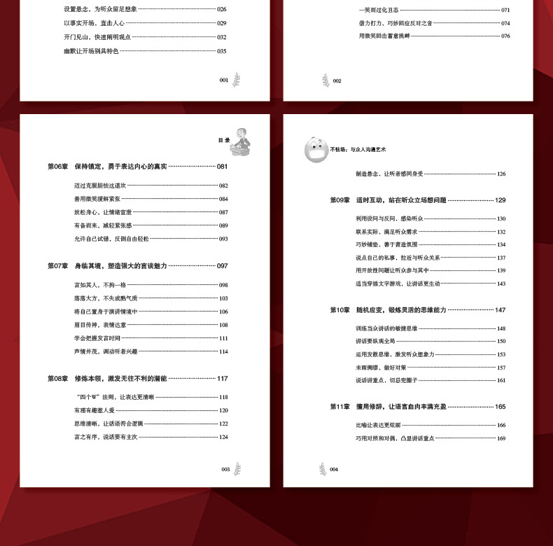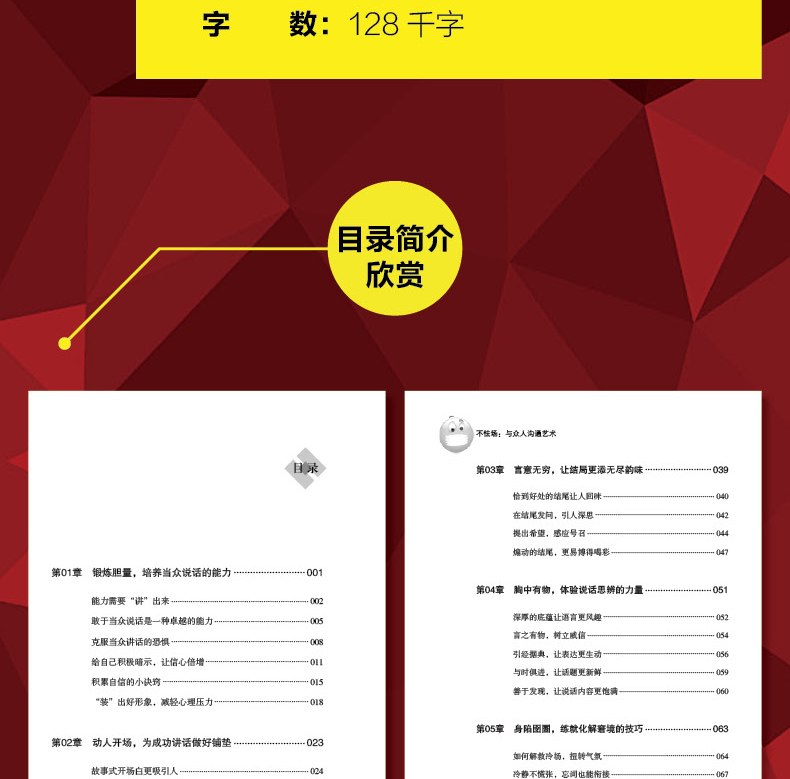 第01章 锻炼胆量,培养当众说话的能力 001能力需要“讲”出来 002敢于当众说话是一种的能力 005克服当众讲话的恐惧 008给自己积极暗示,让信心倍增 011积累自信的小诀窍 015“装”出好形象,轻心理压力 018第02章 动人开场,为成功讲话做好铺垫 023故事式开场白更吸引人 024设置悬念,为听众留足想象 026以事实开场,直击人心 029开门见山,快速阐明观点 032幽默让开场别具特色 035第03章 言意无穷,让结局更添无尽韵味 039恰到好处的结尾让人回味 040在结尾发问,引人深思 042提出希望,感应号召 044煽动的结尾,更易博得喝彩 047第04章 胸中有物,体验说话思辨的力量 051深厚的底蕴让语言更风趣 052言之有物,树立 054引经据典,让表达更生动 056与时俱进,让话题更新鲜 059善于发现,让说话内容更饱满 060第05章 身陷囹圄,练就化解窘境的技巧 063如何解救冷场,扭转气氛 064冷静不慌张,忘词也能衔接 067一笑而过化丑态 071借力打力,巧妙回应反对之音 074用微笑回击蓄意挑衅 076第06章 保持,勇于表达内心的真实 081迈过克服胆怯这道坎 082善用微笑缓解紧张 084放松身心,让情绪宣泄 087有备而来,轻紧张感 089允许自己试错,反倒自由轻松 093第07章 身临其境,塑造强大的言谈魅力 097言如其人,不拘一格 098落落大方,不失成熟气质 103将自己置身于演讲情境中 106眉目传神,表情达意 108学会把握发言时间 111声情并茂,调动听者兴趣 114第08章 修炼本领,激发无往不利的潜能 117“四个W”法则,让表达更清晰 118有理有趣惹人爱 120思维清晰,让话语符合逻辑 122言之有序,说话要有主次 124制造悬念,让听者感同身受 126第09章 适时互动,站在听众立场想问题 129利用设问与反问,感染听众 130联系实际,满足听众需求 132巧妙铺垫,善于营造氛围 134说点自己的私事,拉近与听众关系 137用开放性问题让听众参与其中 139适当穿插文字游戏,让讲话更生动 1430章 应变,锻炼灵活的思维能力 147训练当众讲话的敏捷思维 148讲话要纵观全局 150运用发散思维,激发听众想象力 153未雨绸缪,做好对策 157说话讲重点,切忌兜圈子 1611章 擅用修辞,让语言血肉丰满充盈 165比喻让表达更炫丽 166巧用对照和对偶,凸显讲话重点 169一语双关,回味无穷 172夸张让语气更震撼 174善于引用,增强语言感染力 1772章 细枝末节,提升讲话渲染效果183语速快慢适中,掷地有声 184声音洪亮,方能展现自信 187用语气表达情感 190惟妙惟肖,让演讲博得眼球 193手势的使用,为表达锦上添花 195参考文献198