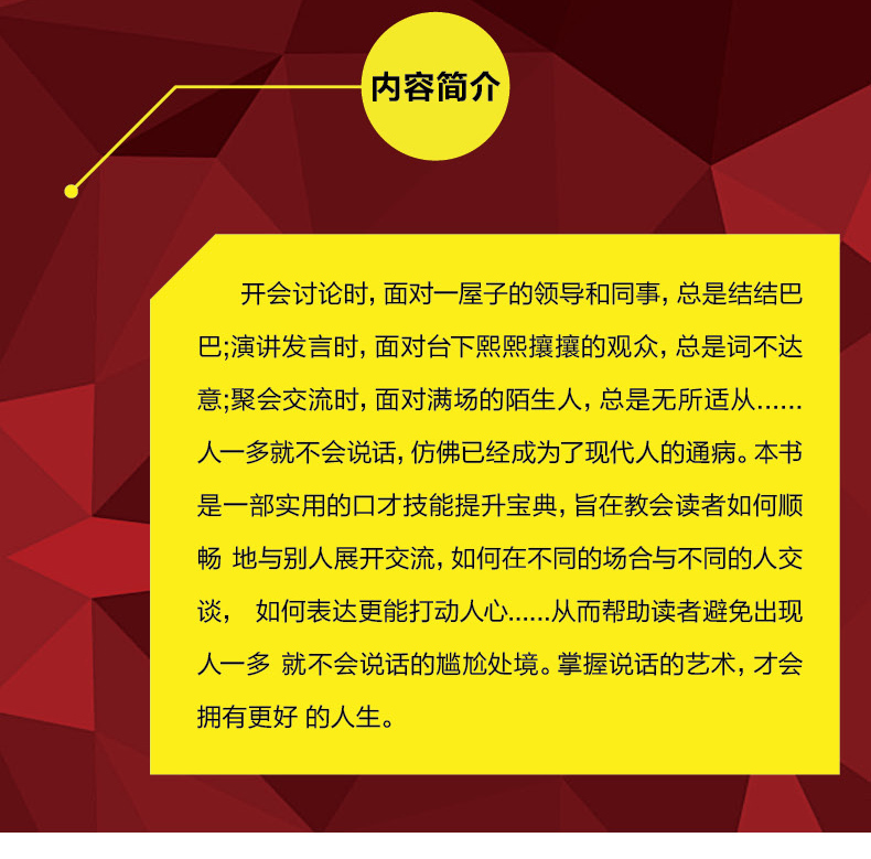开会讨论时,面对一屋子的领导和同事,总是结结巴巴;演讲发言时,面对台下熙熙攘攘的观众,总是词不达意;聚会交流时,面对满场的陌生人,总是无所适从……人一多就不会说话,仿佛已经成为了现代人的通病。《不怯场:与众人沟通艺术》是一部实用的口才技能提升宝典,旨在教会读者如何顺畅地与别人展开交流,如何在不同的场合与不同的人交谈,如何表达更能打动人心……从而帮助读者避免出现人一多就不会说话的尴尬处境。掌握说话的艺术,才会拥有更好的人生。
