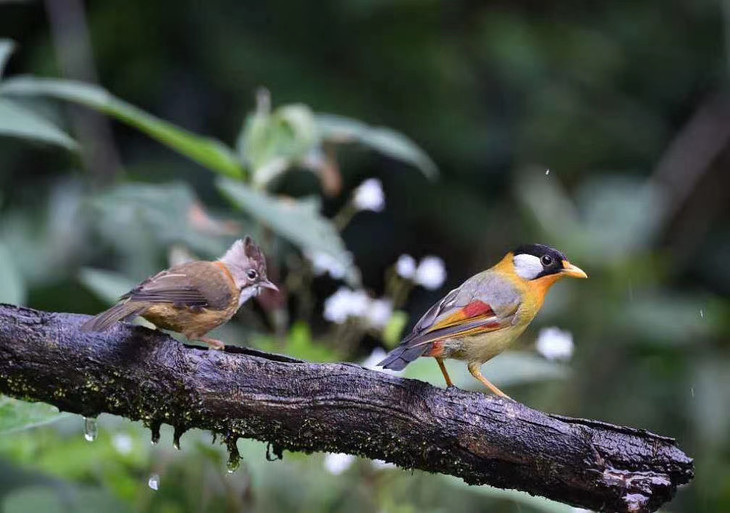 血雀,剑嘴鹛,红喉山鹧鸪,纹背捕蛛鸟,黄颈凤鹛,蓝希鹛,灰眶雀鹛,褐胁雀鹛,白腹凤鹛,黑头奇鹛,长尾奇鹛,丽色奇鹛,白喉鸲鹟,红头穗鹛,黑头穗鹛,金头穗鹛,黄绿鹎,纵纹绿鹎,黑鹎,凤头雀嘴鹎,赤胸啄木鸟,大拟啄木鸟,蓝喉拟啄木鸟,金喉拟啄木鸟,方尾鹟,赤尾噪鹛,红翅薮鹛,赤尾噪鹛,蓝翅噪鹛,灰胁噪鹛,纯色噪鹛,小仙鹟,大仙鹟,棕腹大仙鹟,栗臀鳾,黑胸鸫,橙头地鸫,白眉鸫,长尾地鸫,虎斑地鸫,灰林鸲,银耳相思鸟,红嘴相思鸟,红嘴蓝雀,金眼鹛雀,白喉扇尾鹟,斑胸勾嘴鹛,灰腹地莺,栗头地莺,小鳞胸鹪鹛,金眶鹟莺,锈胸蓝够鹟,红胁绣眼,黑胸太阳鸟,蓝喉太阳鸟,黄腰太阳鸟,绿喉太阳鸟,棕背田鸡,棕胸竹鸡,等了100多种鸟左右。
