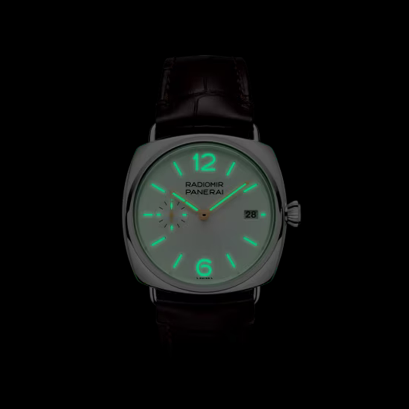 镜面材质 | 蓝宝石水晶玻璃 | 表盘 | 抛光精钢表壳 白色表盘,附阿拉伯数字及夜光圆点。3点钟位置设日期显示,9点钟位置设蓝色小秒针小秒盘。 磨砂精钢表冠护桥(沛纳海专利) |
