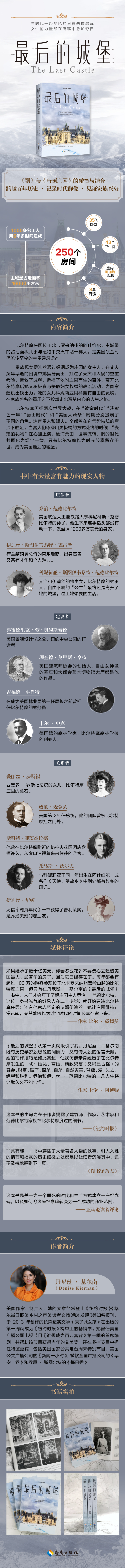 读《最后的城堡》时,流畅的小说式叙事实际上是在“讲述美国”。它是关于名人文化、贫富差距、少数富人卓越的慈善和远见、创造和保持家族遗产的强烈欲望,以及在其黑暗时刻永远存在的个人悲剧的可能性。——《阿什维尔公民报》