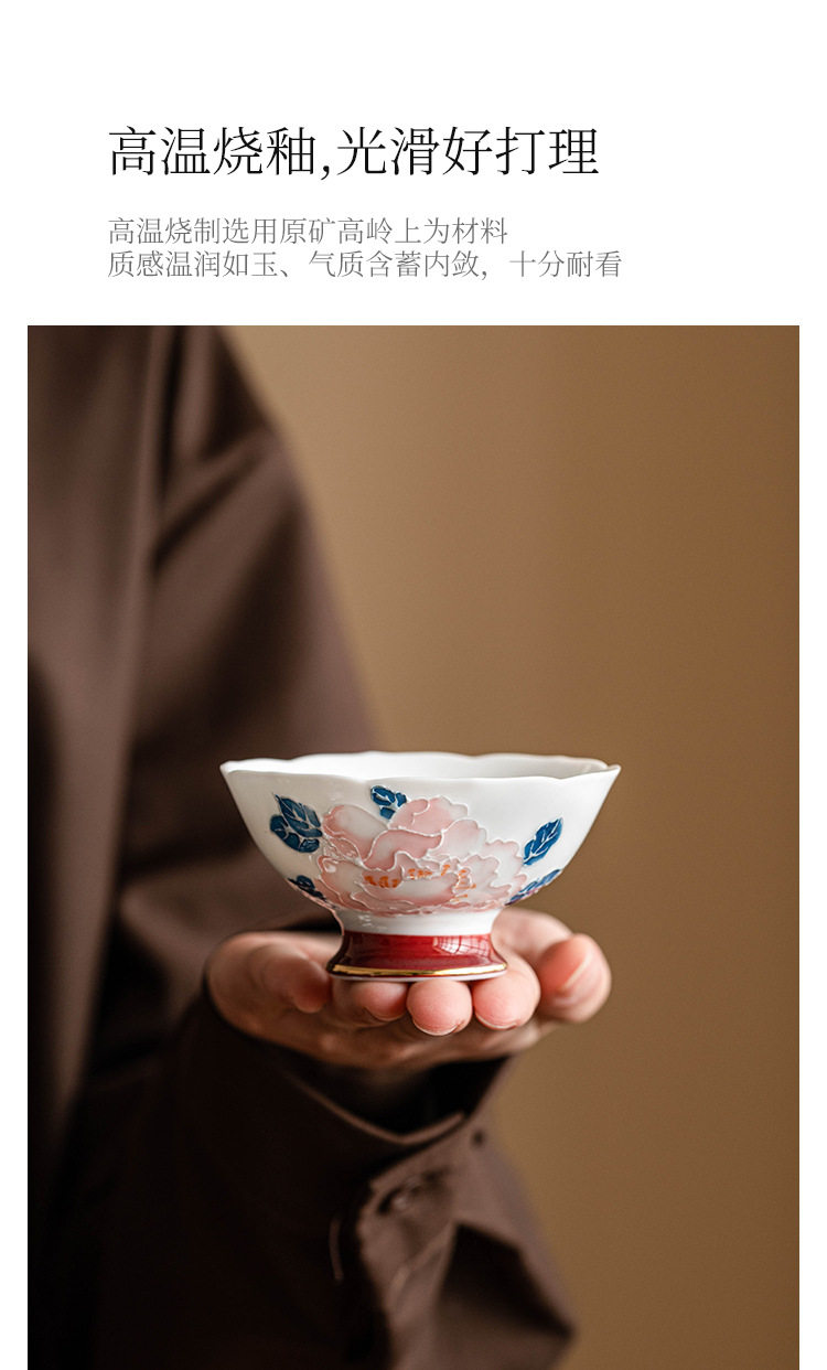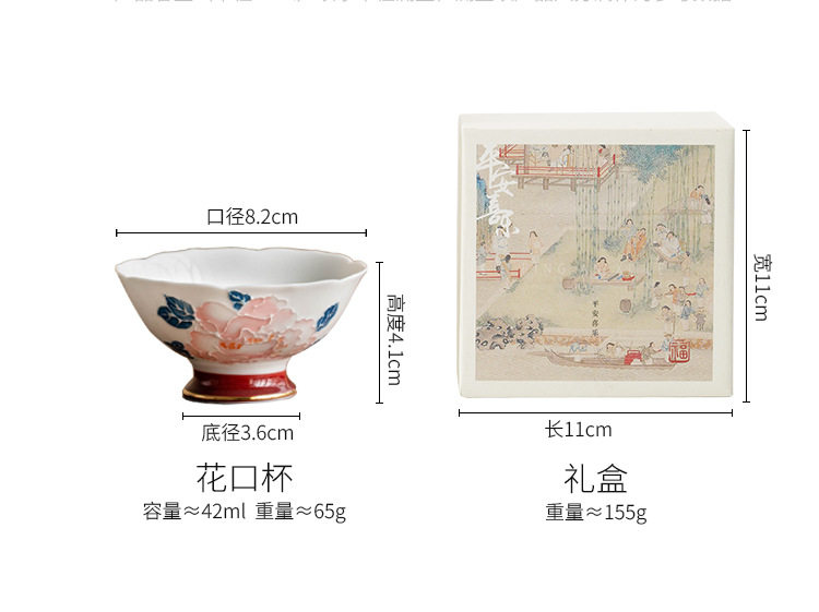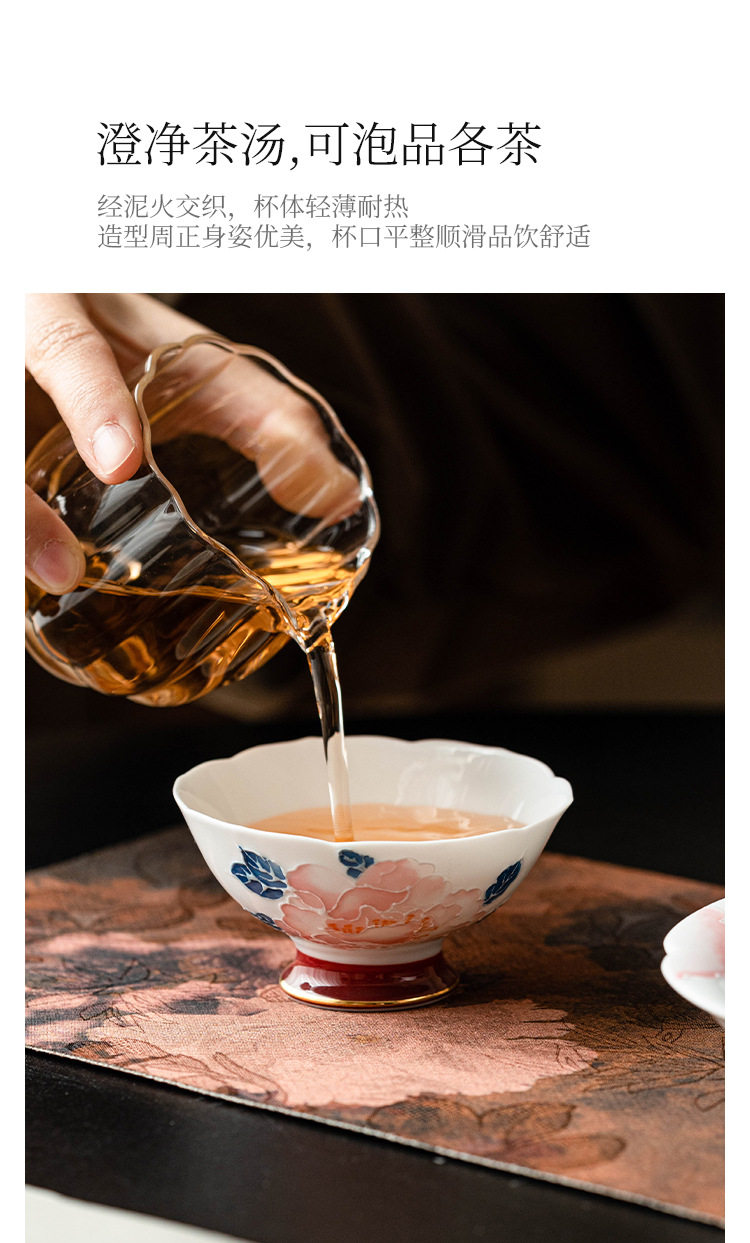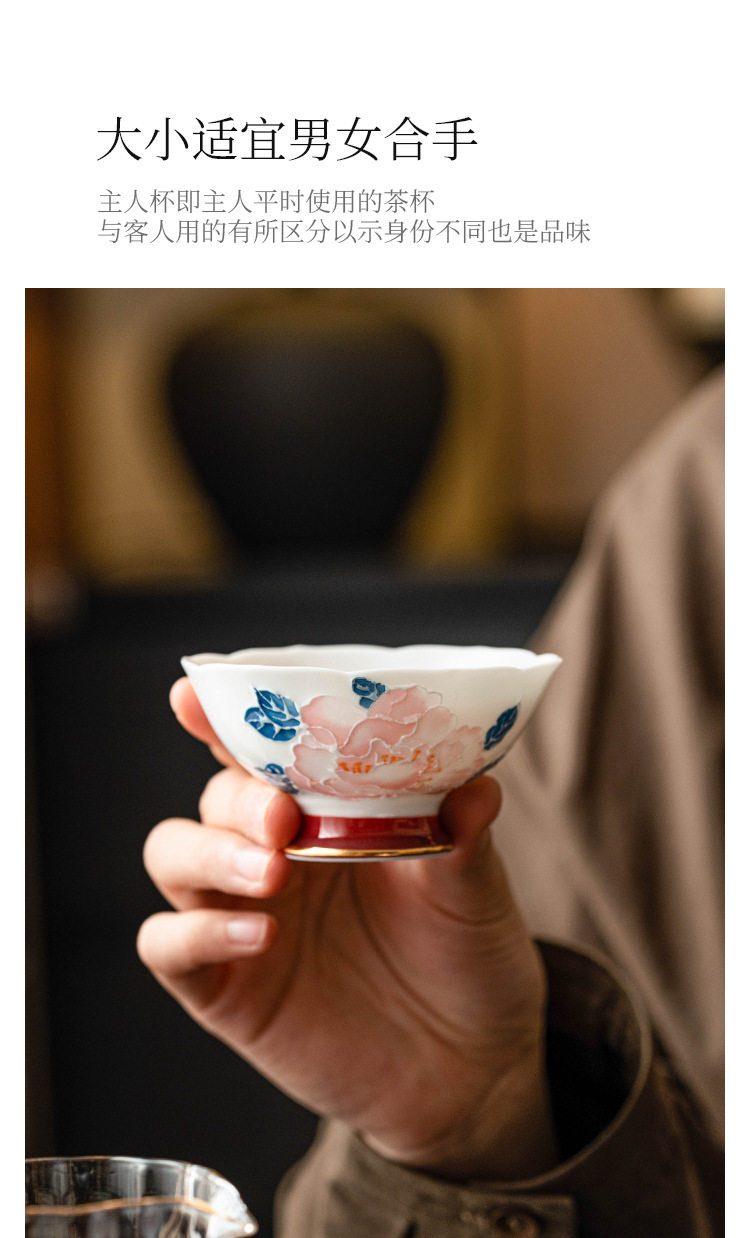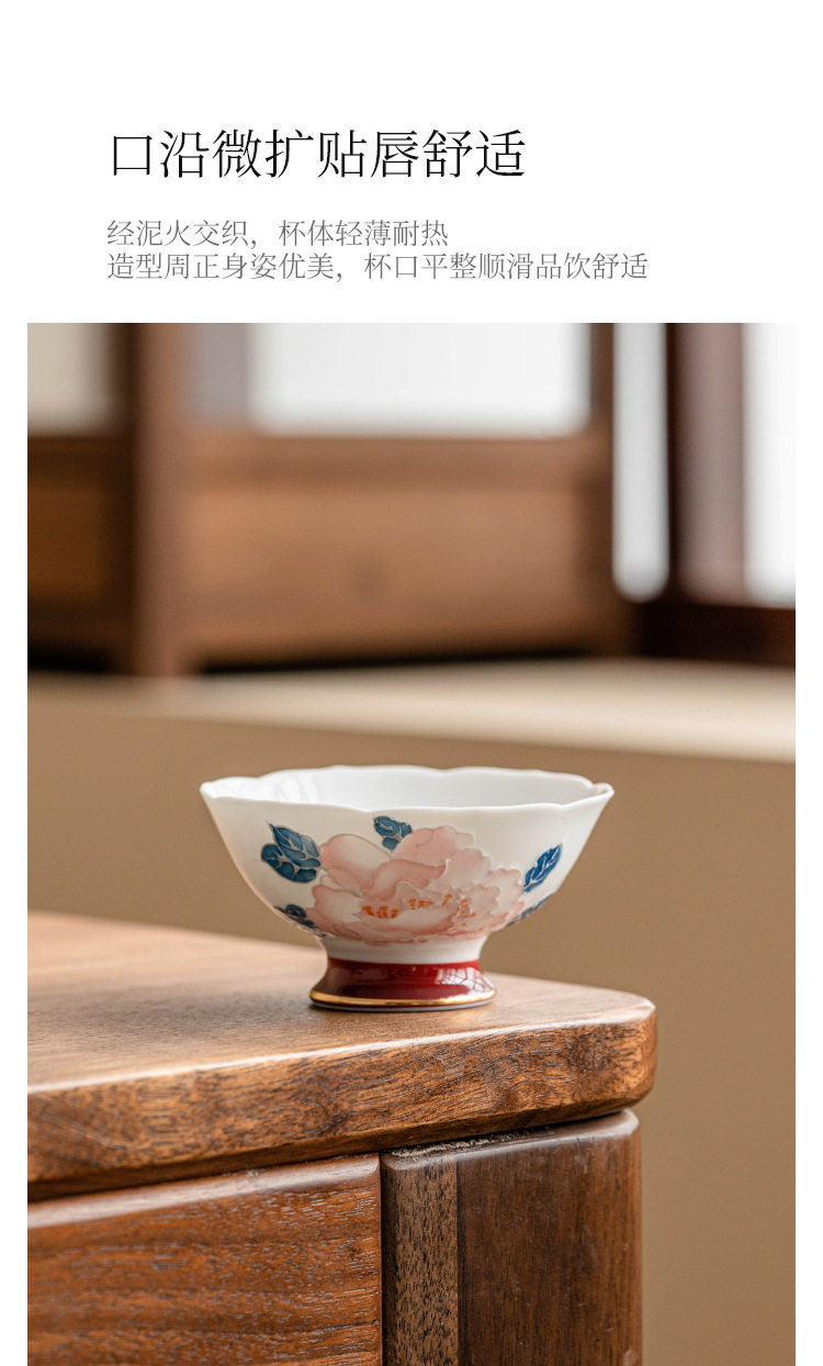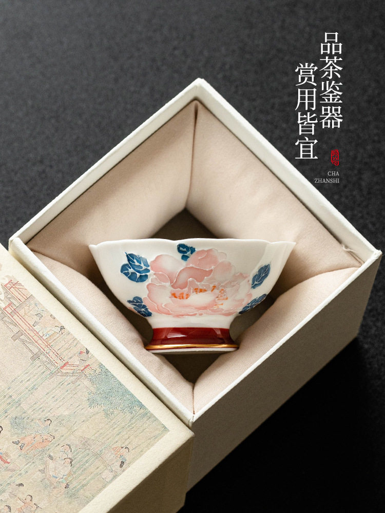主人杯礼盒品茗描金功夫茶茶杯口杯牡丹花杯喝茶手绘家用陶瓷杯子