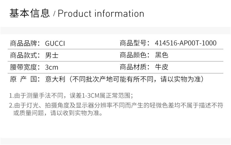 GUCCI/古驰 男士黑色双G带扣皮革腰带 414516-AP00T-1000JPY带授权招加盟代理