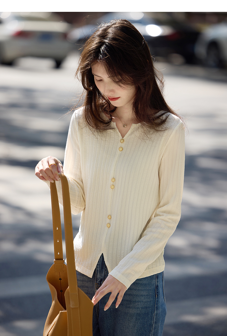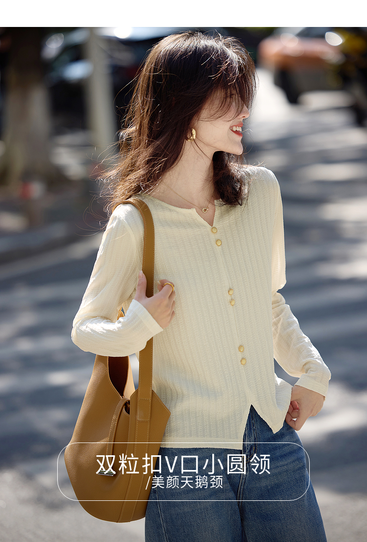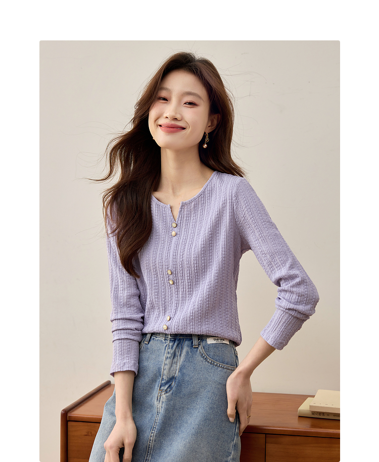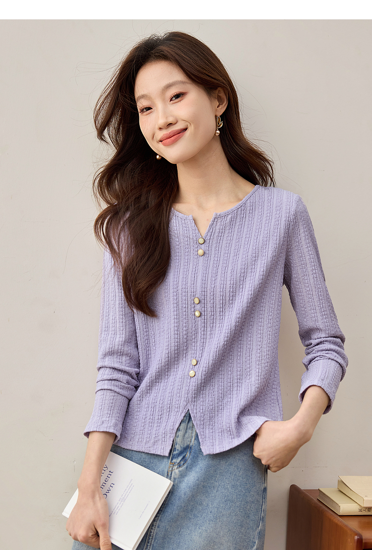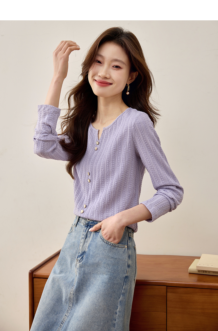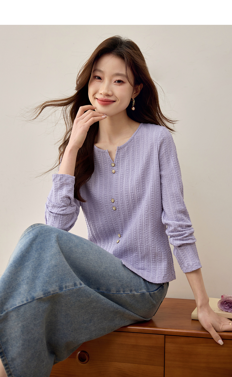 【年终特卖】熙世界2025春秋新款肌理感压花法式T恤女设计感开叉长袖正肩上衣