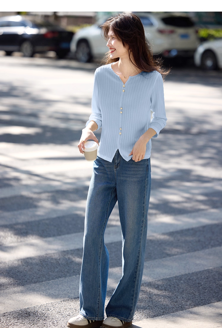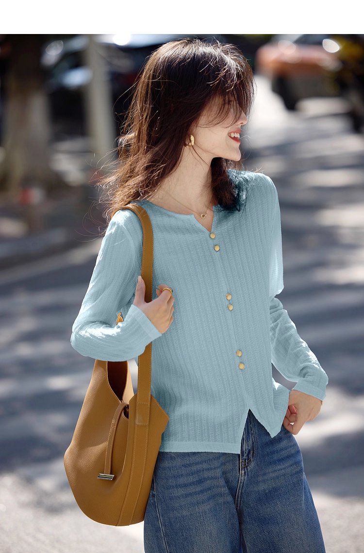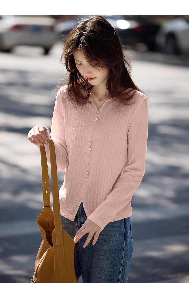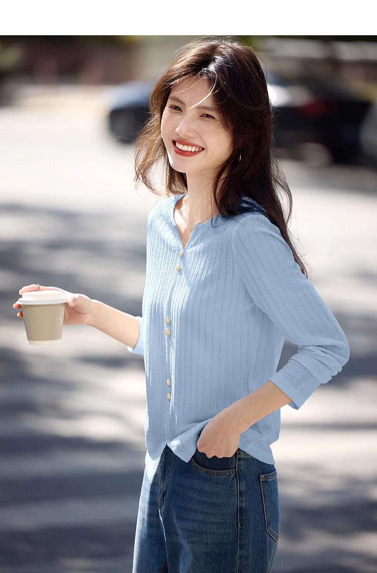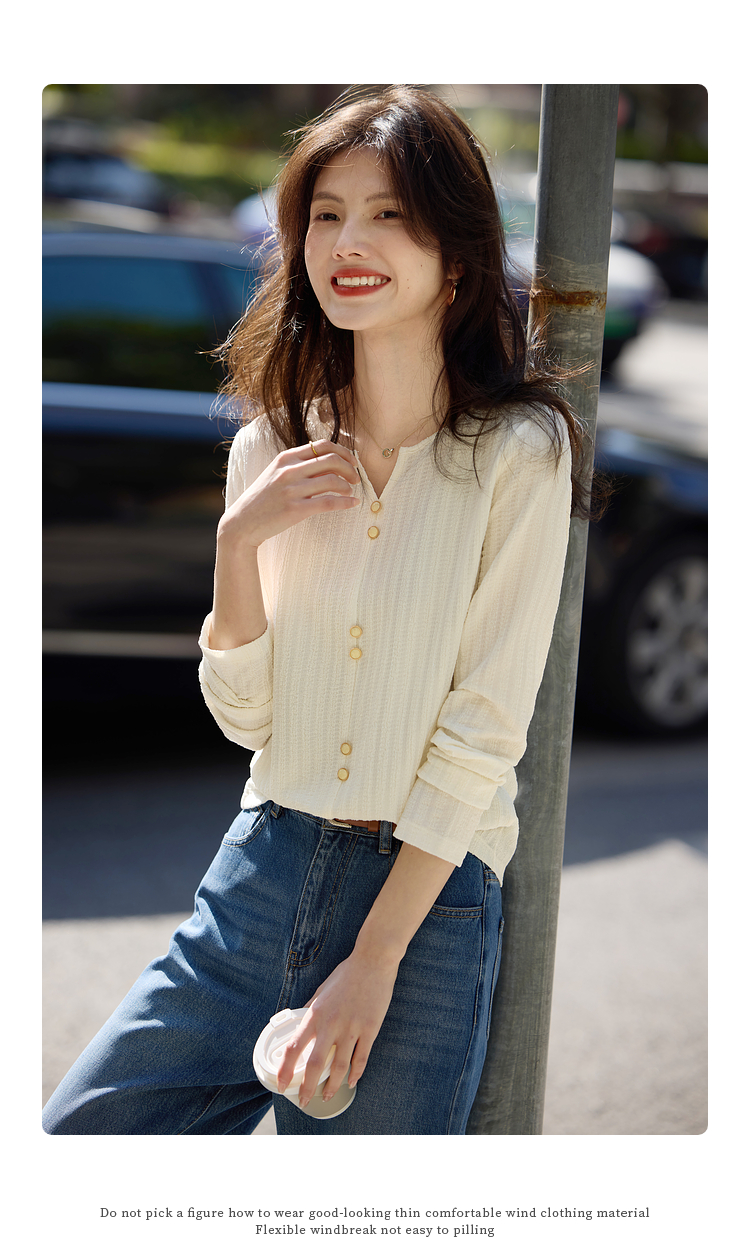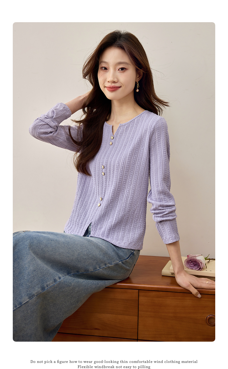 【年终特卖】熙世界2025春秋新款肌理感压花法式T恤女设计感开叉长袖正肩上衣