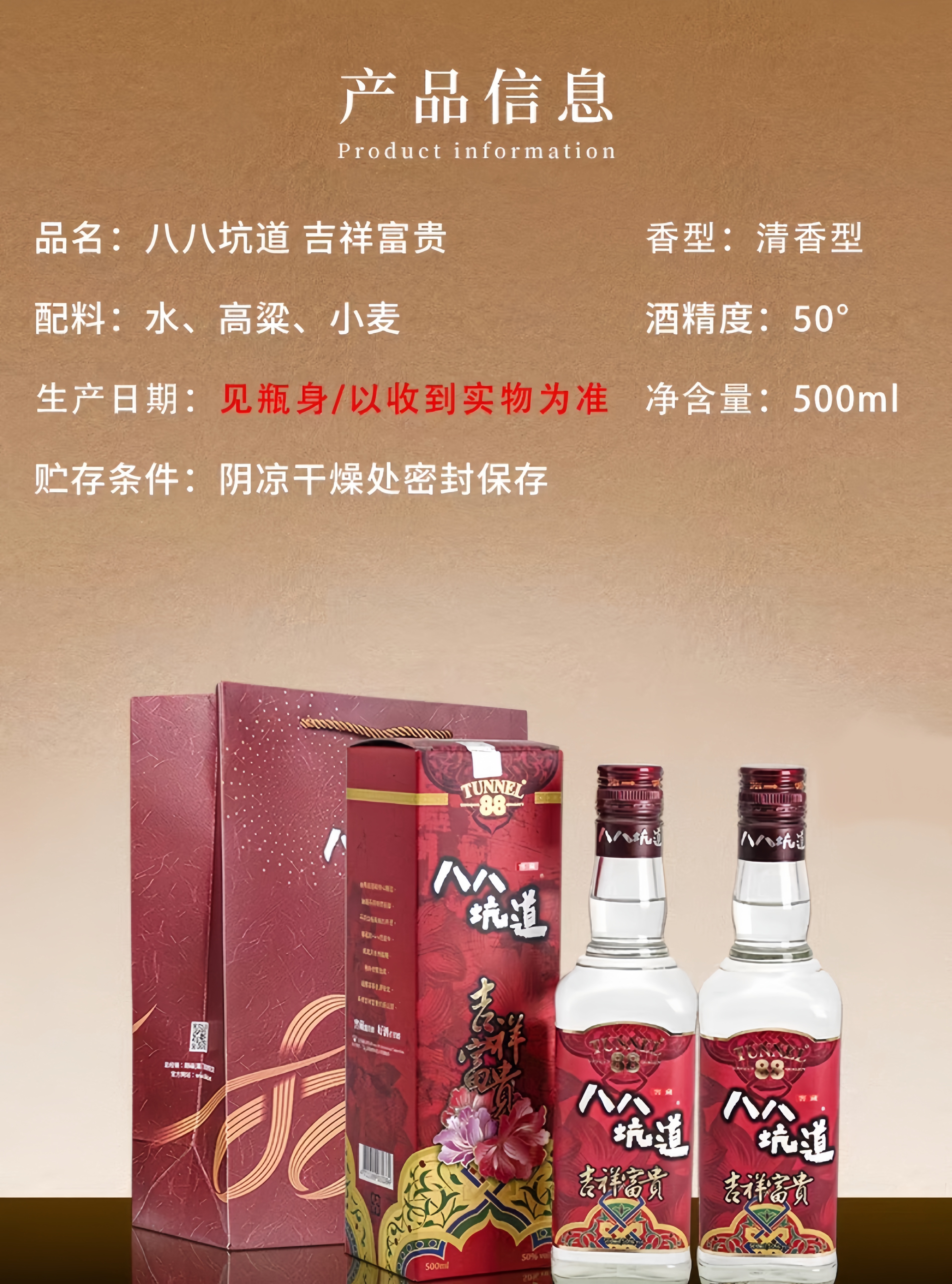 自营(耀金台)-八八坑道台湾经典白酒50°富贵吉祥高粱酒500ml/瓶