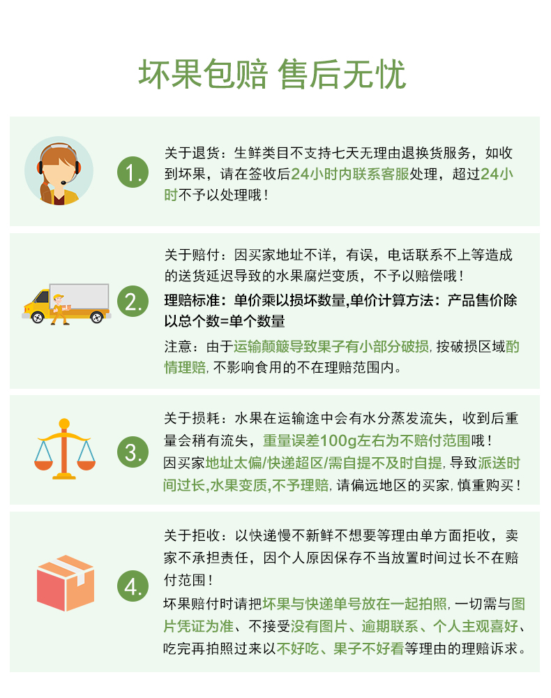 2.如收到坏果,请在收到货24小时内,将坏果和快递单一起拍照,需清晰,缺一不可,否则不可理赔哦。