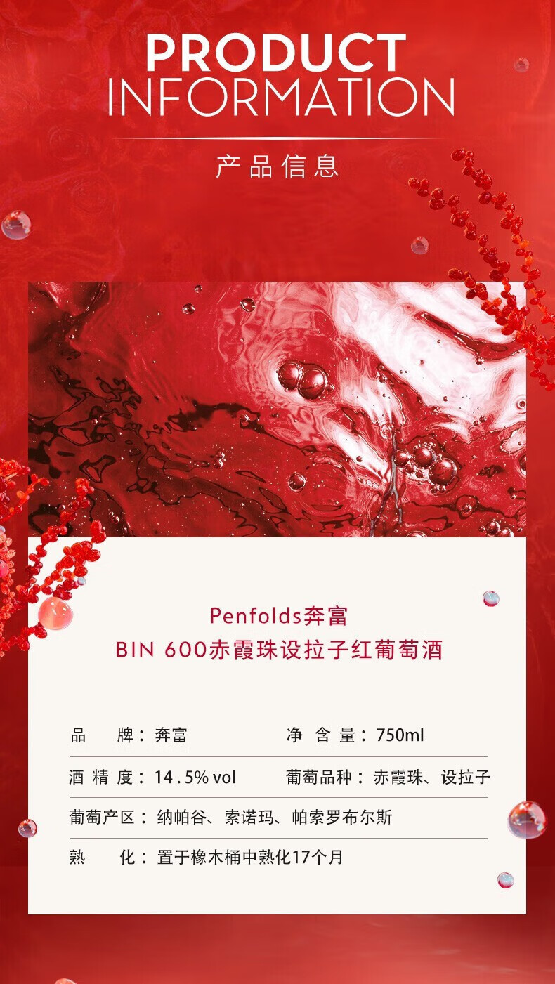 奔富BIN600赤霞珠设拉子葡萄酒750ml/210017 赤霞珠设拉子红葡萄酒醒目的绯红色
