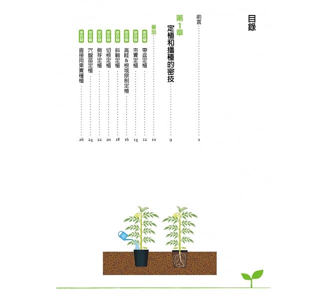 同一種蔬菜,並非只有一種培育方法。按照本書介紹的多種定植或播種方法,選擇符合生長目標的密技來種植喜愛的蔬菜吧!配合簡單明瞭的根部生長剖面圖作為參考,可以與原種植情況相互比較,了解得更為透徹。