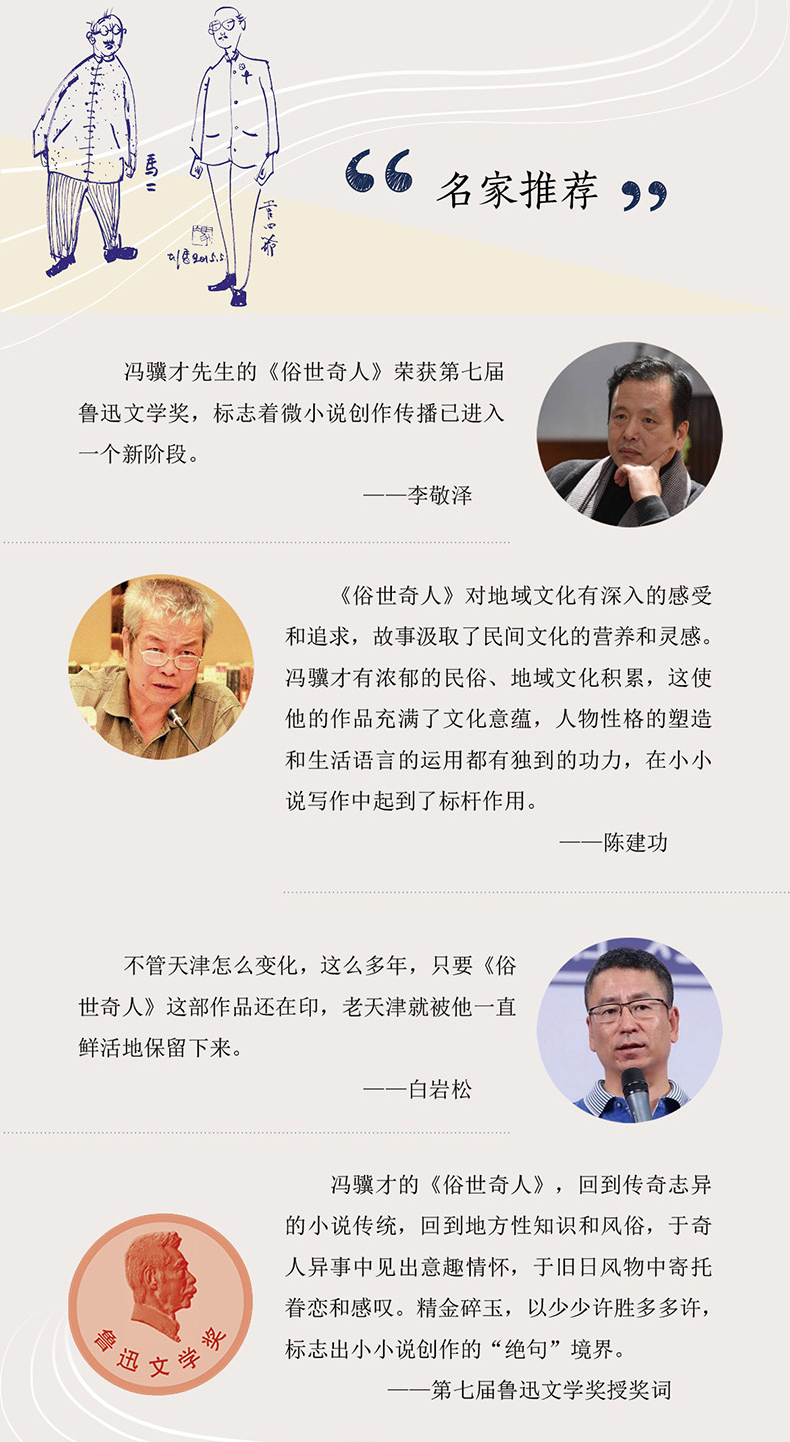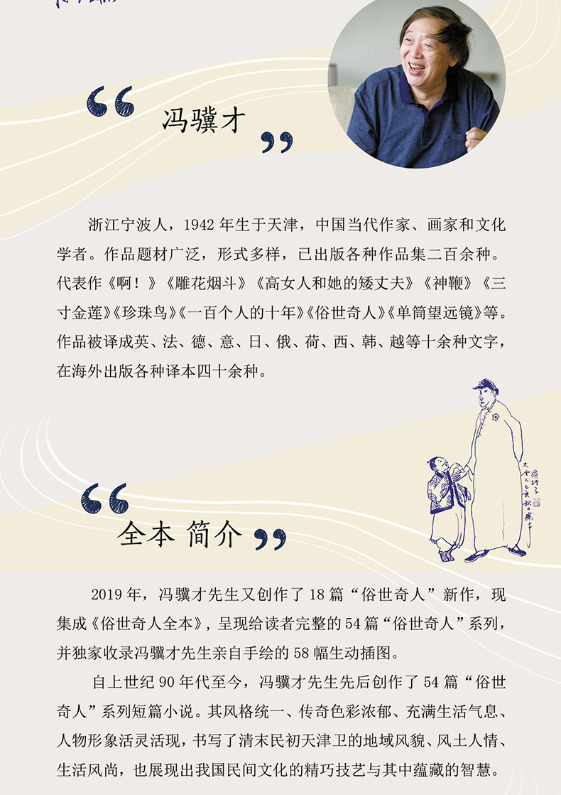 天津卫本是水陆码头,居民五方杂处,性格迥然相异。然燕赵故地,血气刚烈;水咸土碱,风习强悍。近百余年来,举凡中华大灾大难,无不首当其冲,因生出各种怪异人物,既在显耀上层,更在市井民间。故而随想随记,始作于今;每人一篇,各不相关,冠之总名《俗世奇人》耳。2019年,冯骥才先生又创作了18篇“俗世奇人”新作,现集成《俗世奇人全本》,呈现给读者完整的54篇“俗世奇人”系列,并定制收录冯骥才先生亲自手绘的58幅生动插图。自上世纪九十年代至今,冯骥才先生先后创作了五十四篇“俗世奇人”系列短篇小说。其风格统一、传奇色彩浓郁、充满生活气息、人物形象活灵活现,书写了清末民初天津卫的地域风貌、风土人情、生活风尚,也展现出我国民间文化的精巧技艺与其中蕴藏的智慧。
