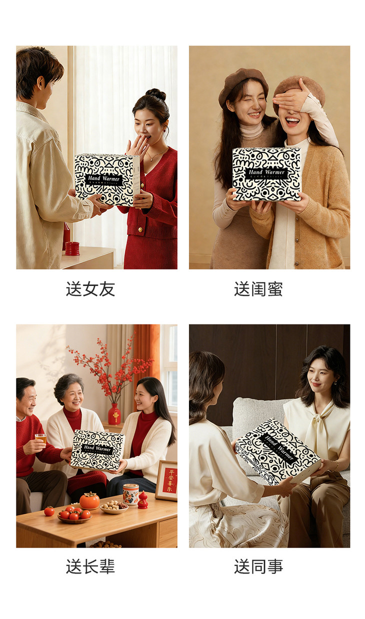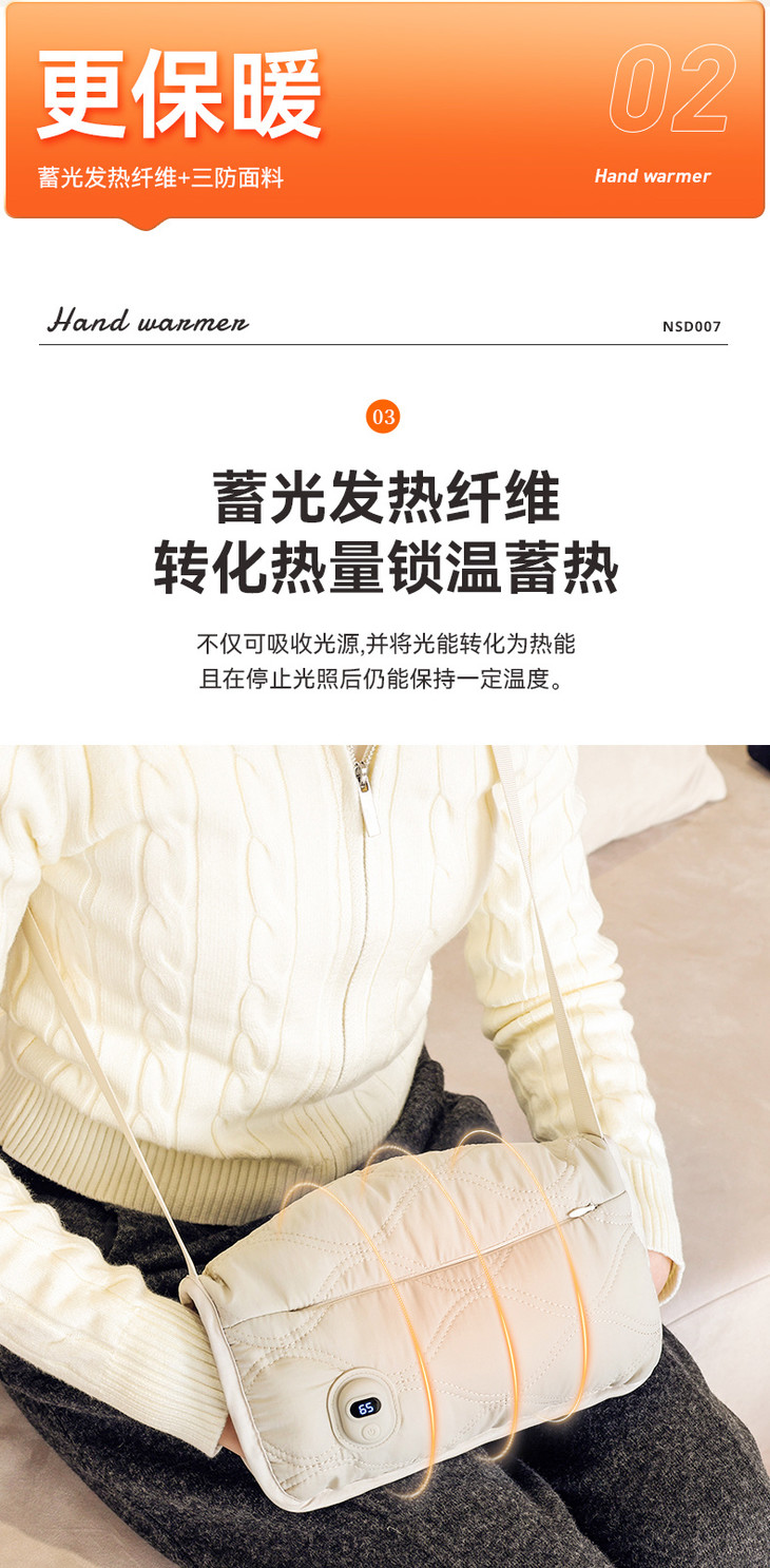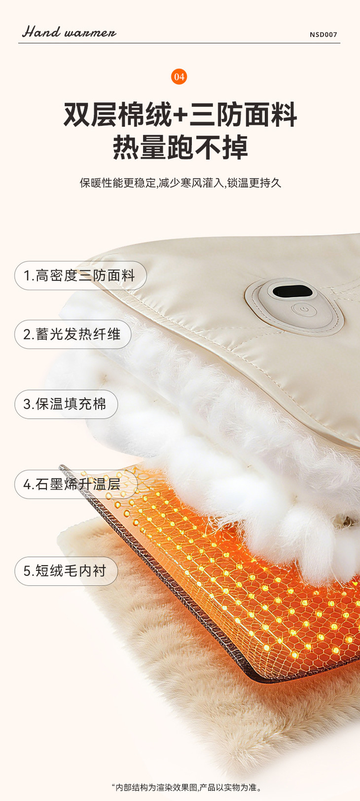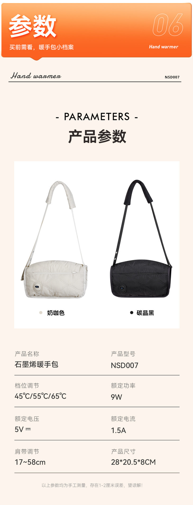 这个冬天,愿你有衣暖身,有人暖心。 八大优势~ 1、经济环保:可重复使用,长期使用成本远低于一次性暖手贴或暖宝宝,减少资源浪费。减少垃圾,避免一次性化学暖手贴的内置材料污染,更环保。 2、内含诺贝尔奖的石墨烯【目前已知的最薄、最坚硬的纳米材料】发热片,接近人体波长,易渗透皮肤,热能转换率高达98%,更容易被人体吸收,但是不干燥皮肤,3秒速热,升温+锁温+热感循环。 3、加厚五层布料【内含蓄光发热纤维】,保暖性能更稳定,减少寒风灌入,锁温更持久。 4、三防布料,防水放油防污渍,且可全身水洗。 5、多功能用途,既是暖手袋也是秋冬背包。 6、三档【45°,55°,65°】智能控温,适应不同场景需求,避免过热或不够暖。 7、可调节肩带,多种背法,男女老少皆可。 8、双色可选,奶咖,炭金黑。