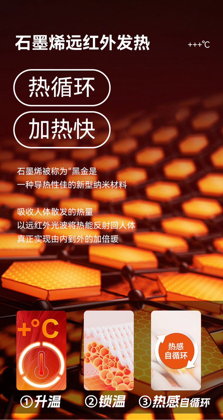 石墨烯黑科技3秒速热, 表面温度恒定在安全范围,不会烫伤皮肤。 家里有老人、小孩的,都可以放心用!