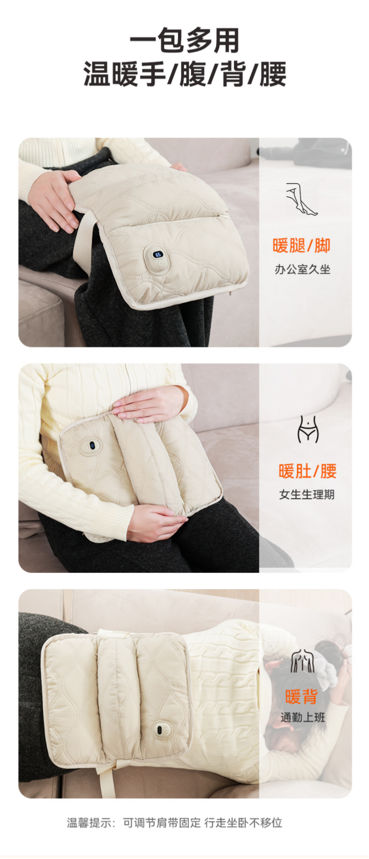 挎上「暖暖包」,带上围巾🧣帽子🧢即可出行 通勤捂手、办公室捂腿、晚上捂腰 顺便还借给生理期的同事暖宫🥵 接上充电宝(充电宝自配),就可以供暖一整天