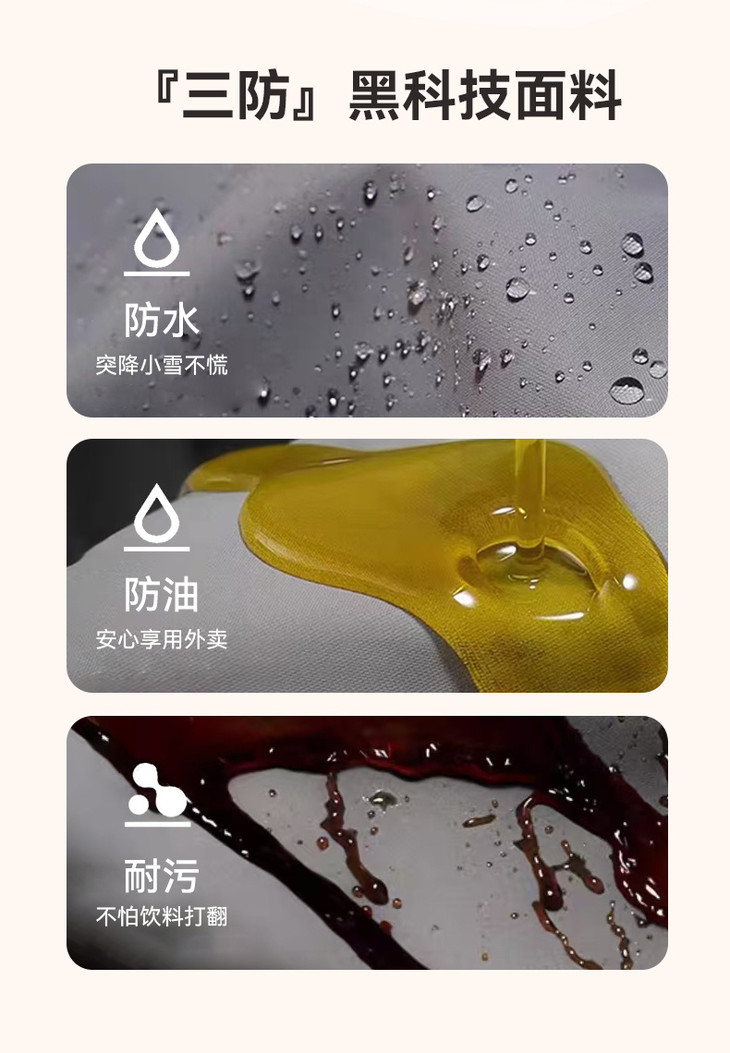 三防面料(防水,防油,防污)一擦即净, 不怕雨雪天气,不怕咖啡奶茶溅洒,日常污渍轻松打理