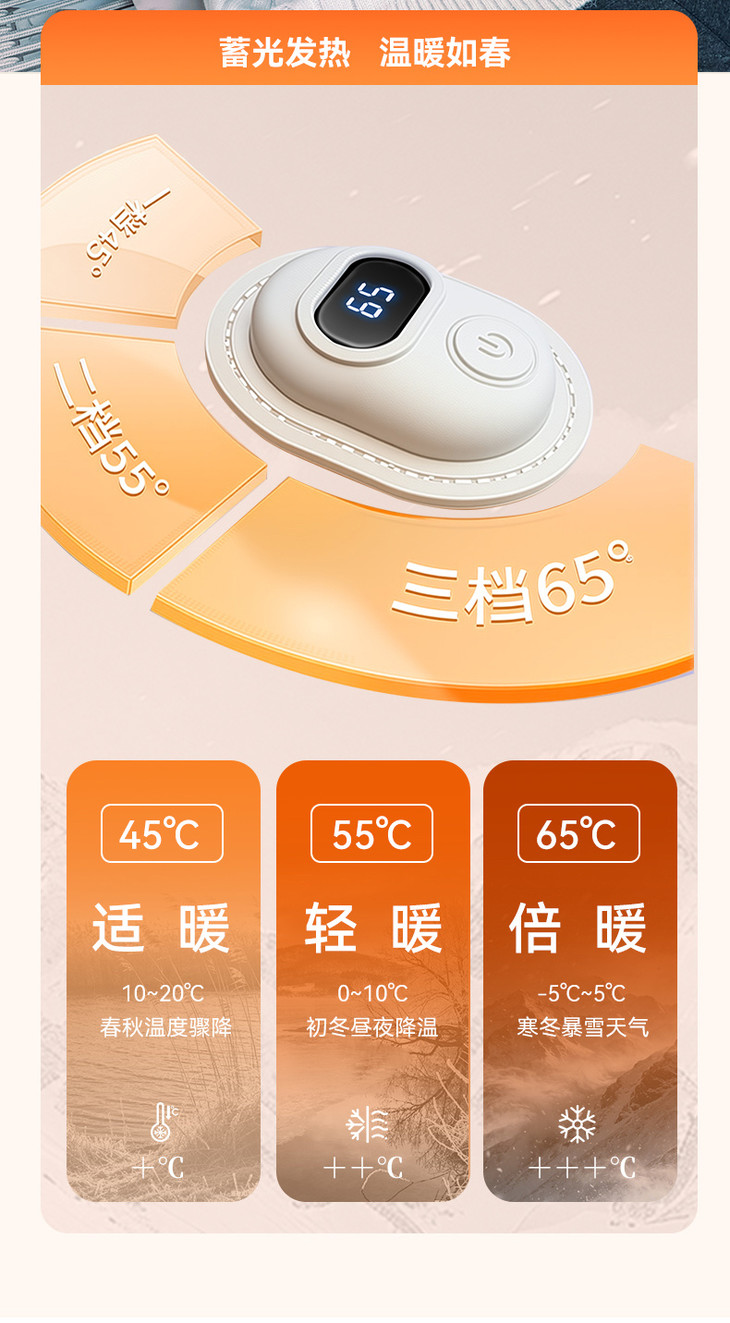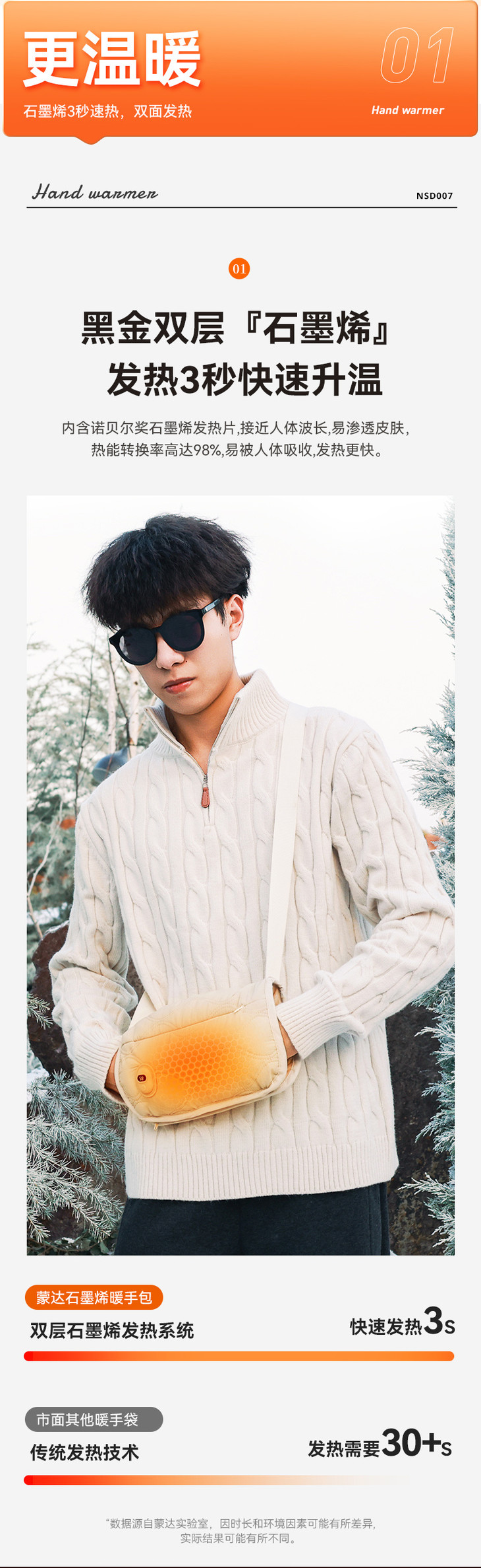 既是暖手袋也是秋冬背包 诺贝尔奖的石墨烯发热片 热能转换率高达98% 升温+锁温+热感循环。 三防布料,防水放油防污渍 三档【45°,55°,65°】智能控温