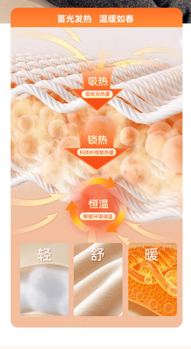 蓄光发热纤维转化热量锁温蓄热 不仅可吸收光源,并将光能转化为热能 且在停止光照后仍能保持一定温度。
