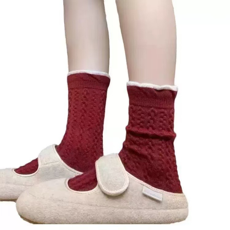 超值19.9四双!【节日氛围感满满❗️软糯亲肤舒适】新款秋冬毛线加厚袜子新年本命年圣诞红袜子百搭保暖线条波点中筒袜子女。ja