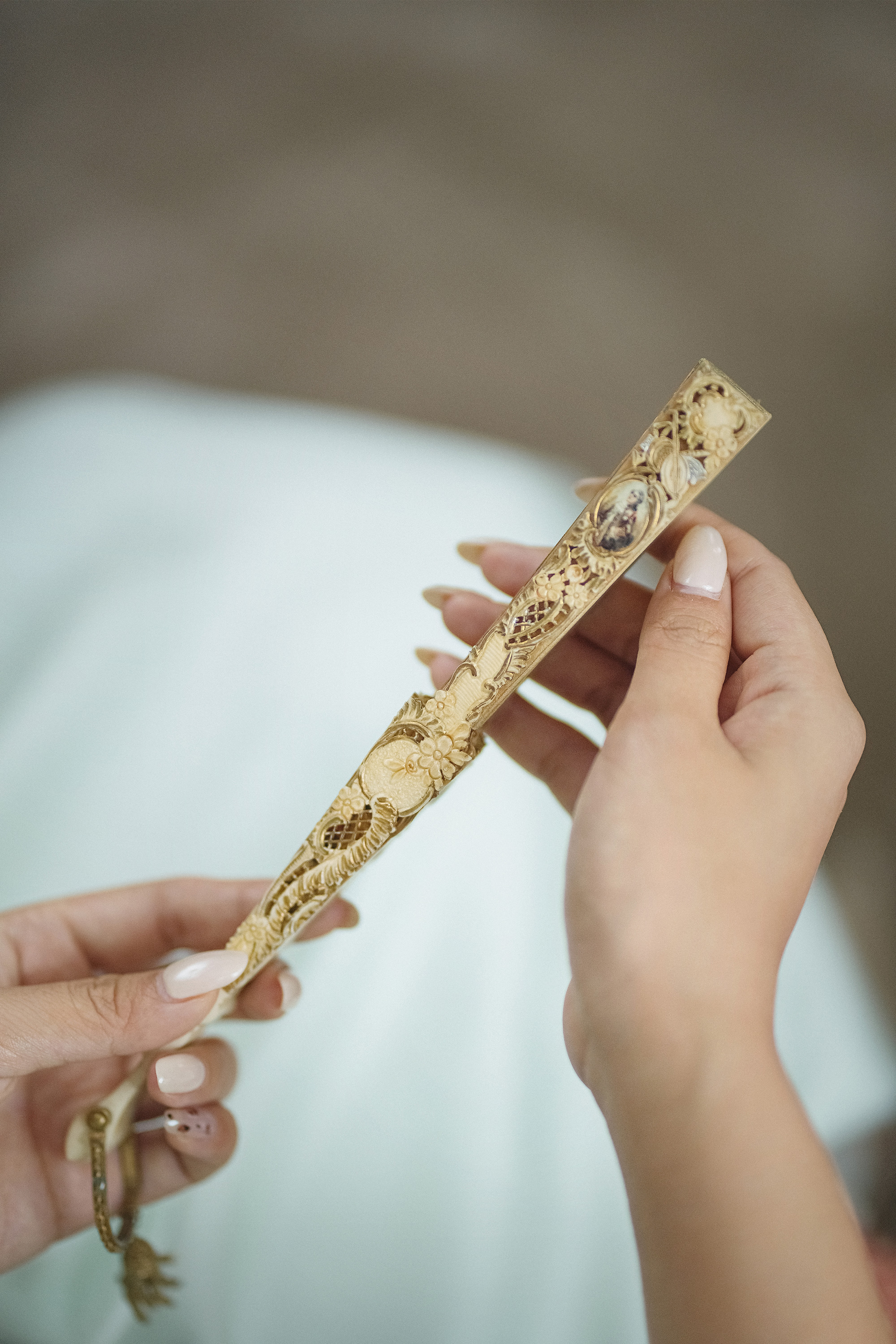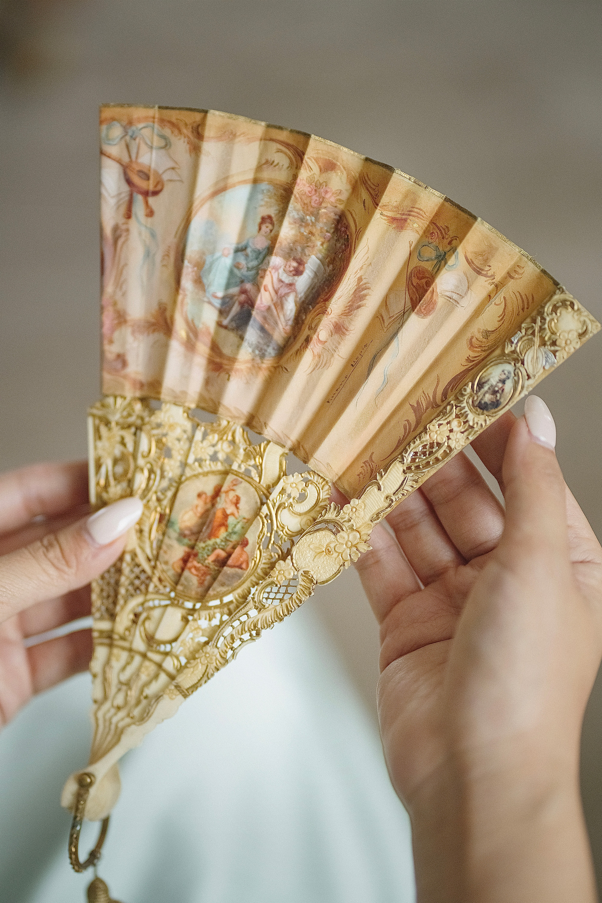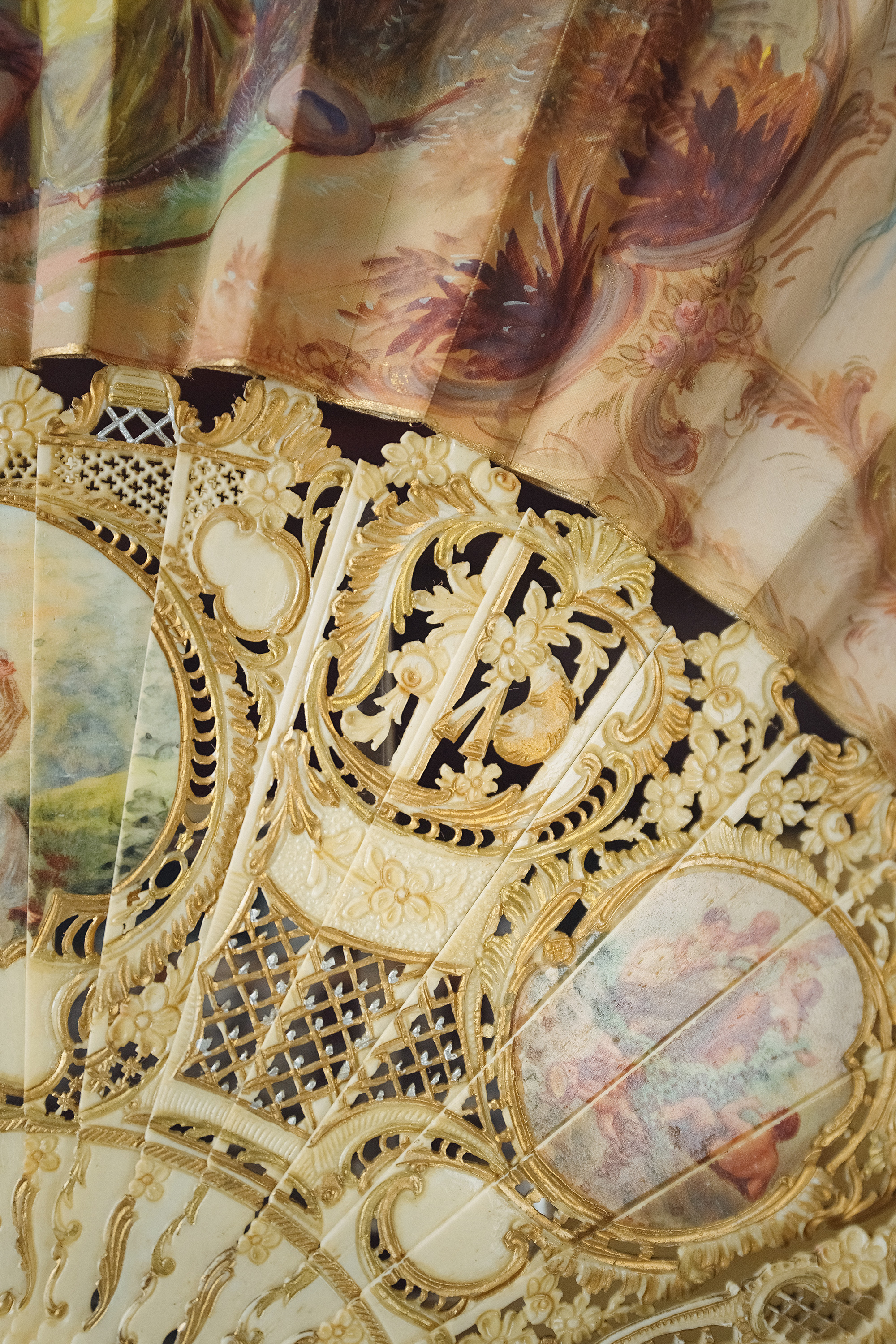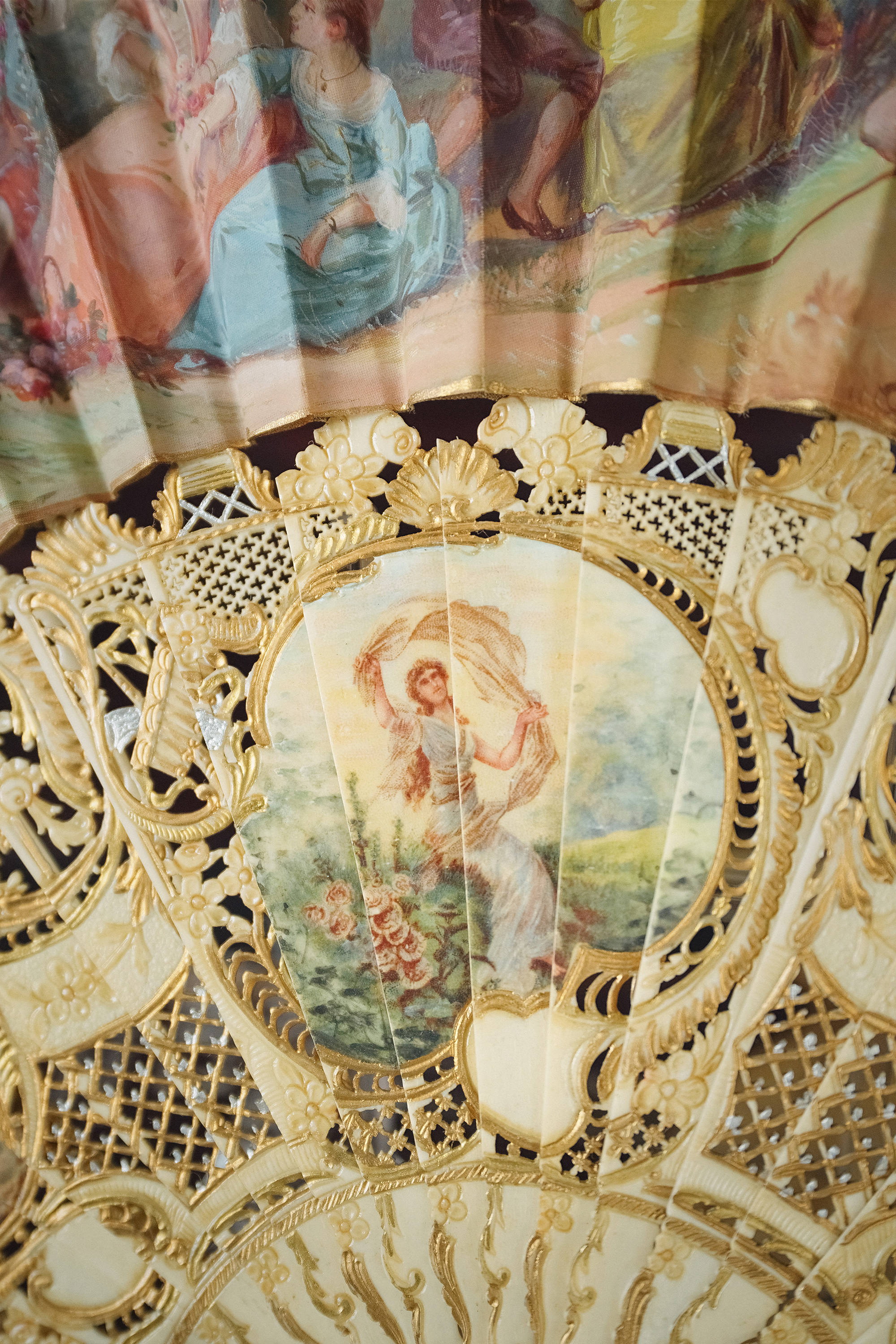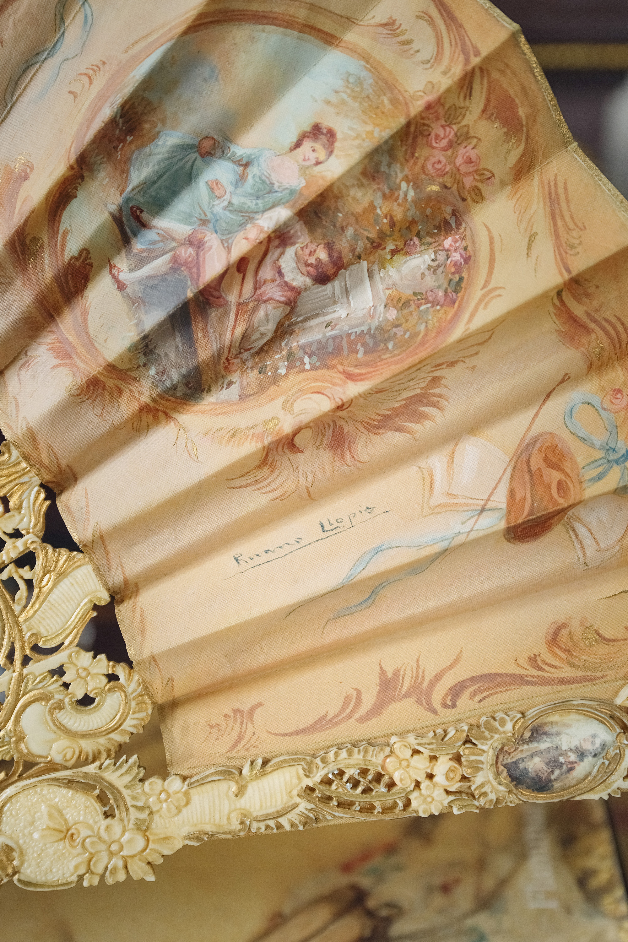 19世纪末20世纪初西班牙艺术家Ruano Llopis签名创作卷叶纹描金骨雕扇骨装饰田园恋歌及神话主题手绘扇面双面折扇