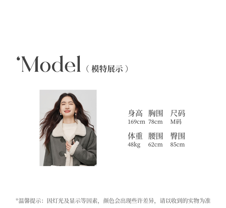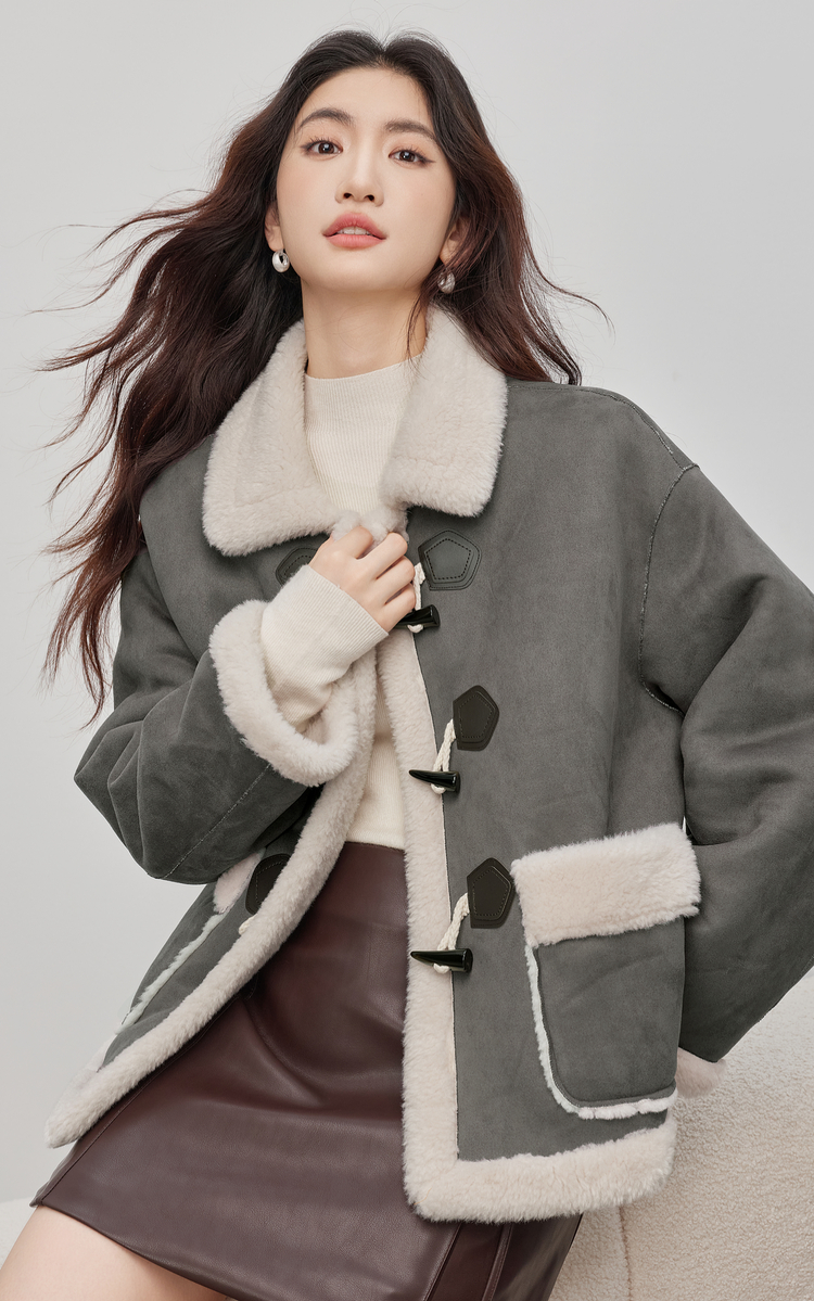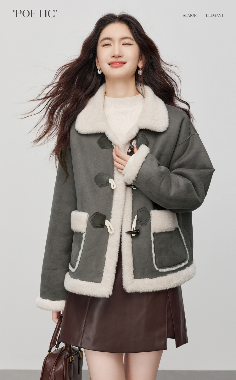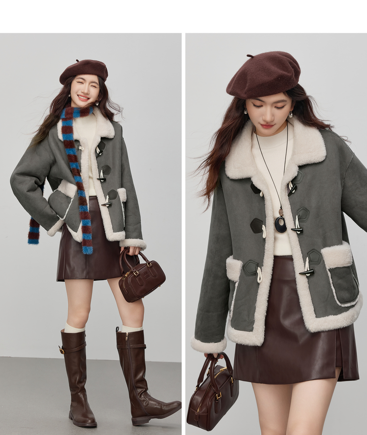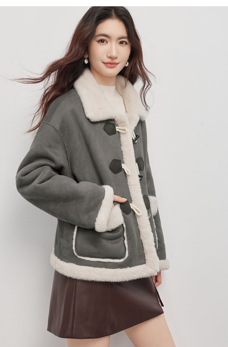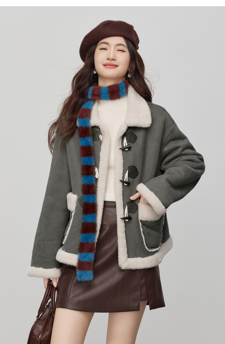 【年货节】熙世界仿生麂皮绒牛角扣短外套女冬季皮毛一体毛绒绒翻领保暖大衣