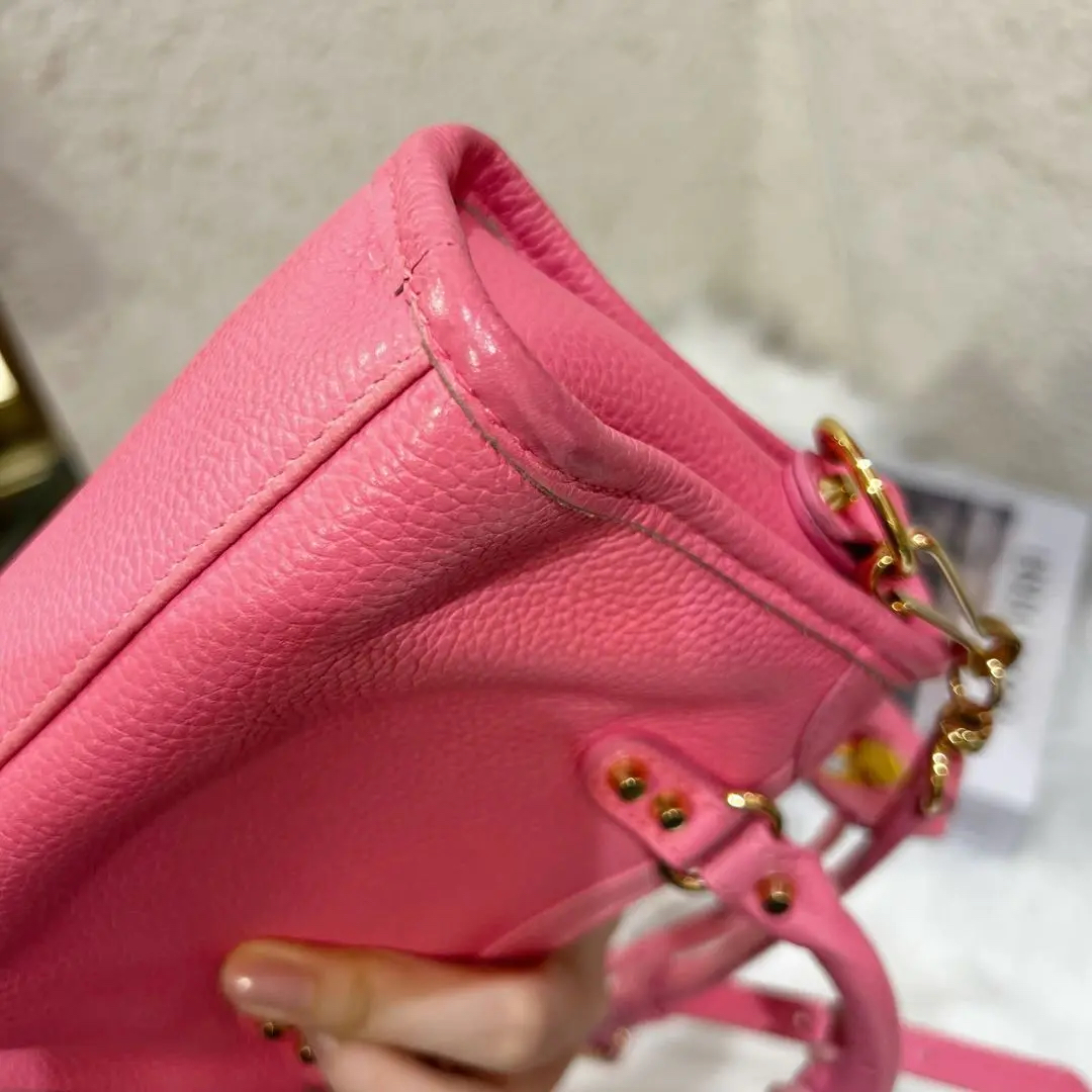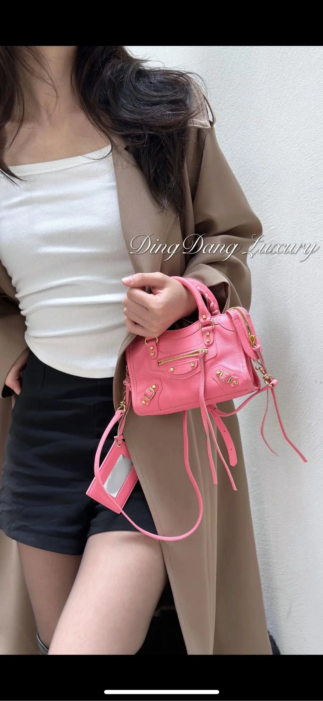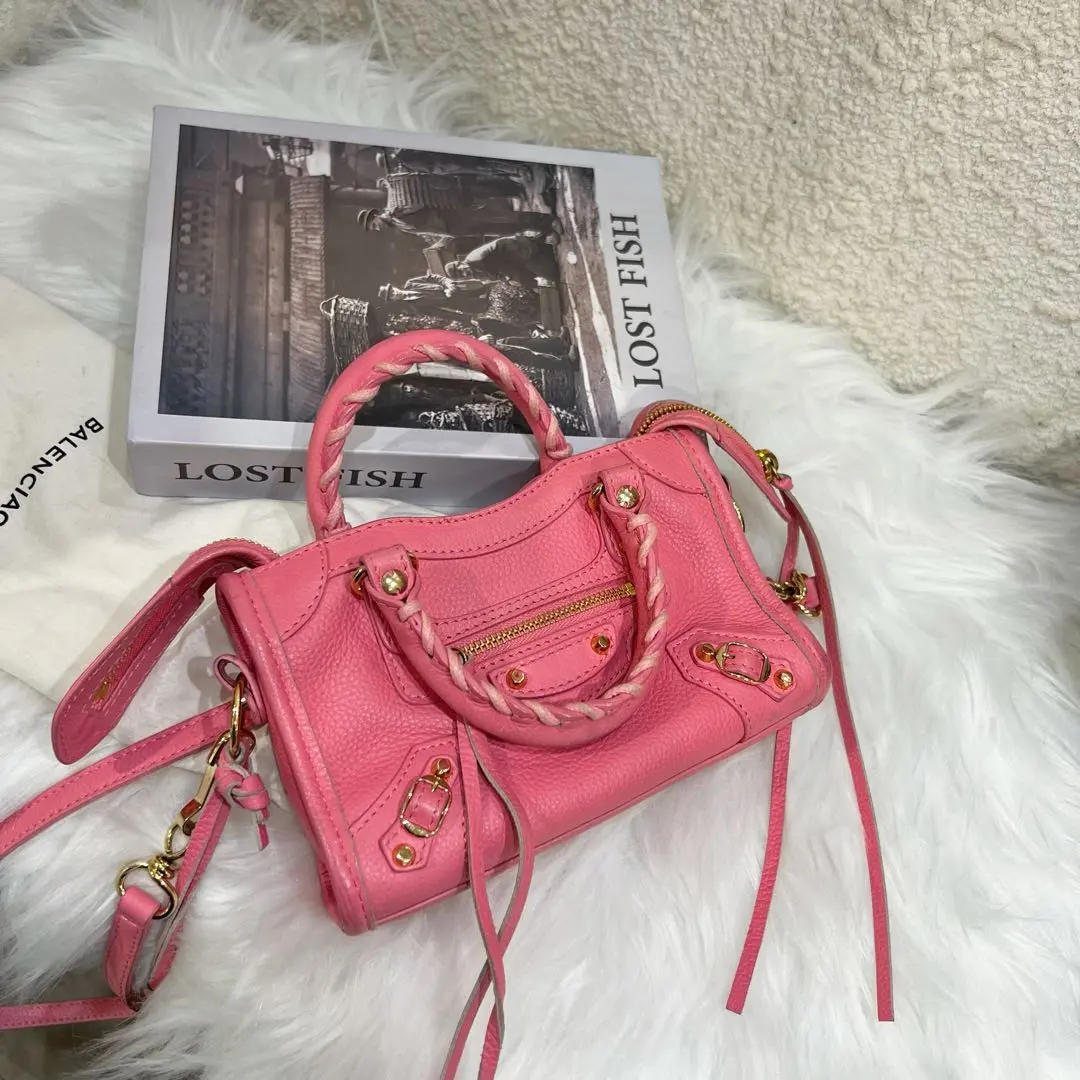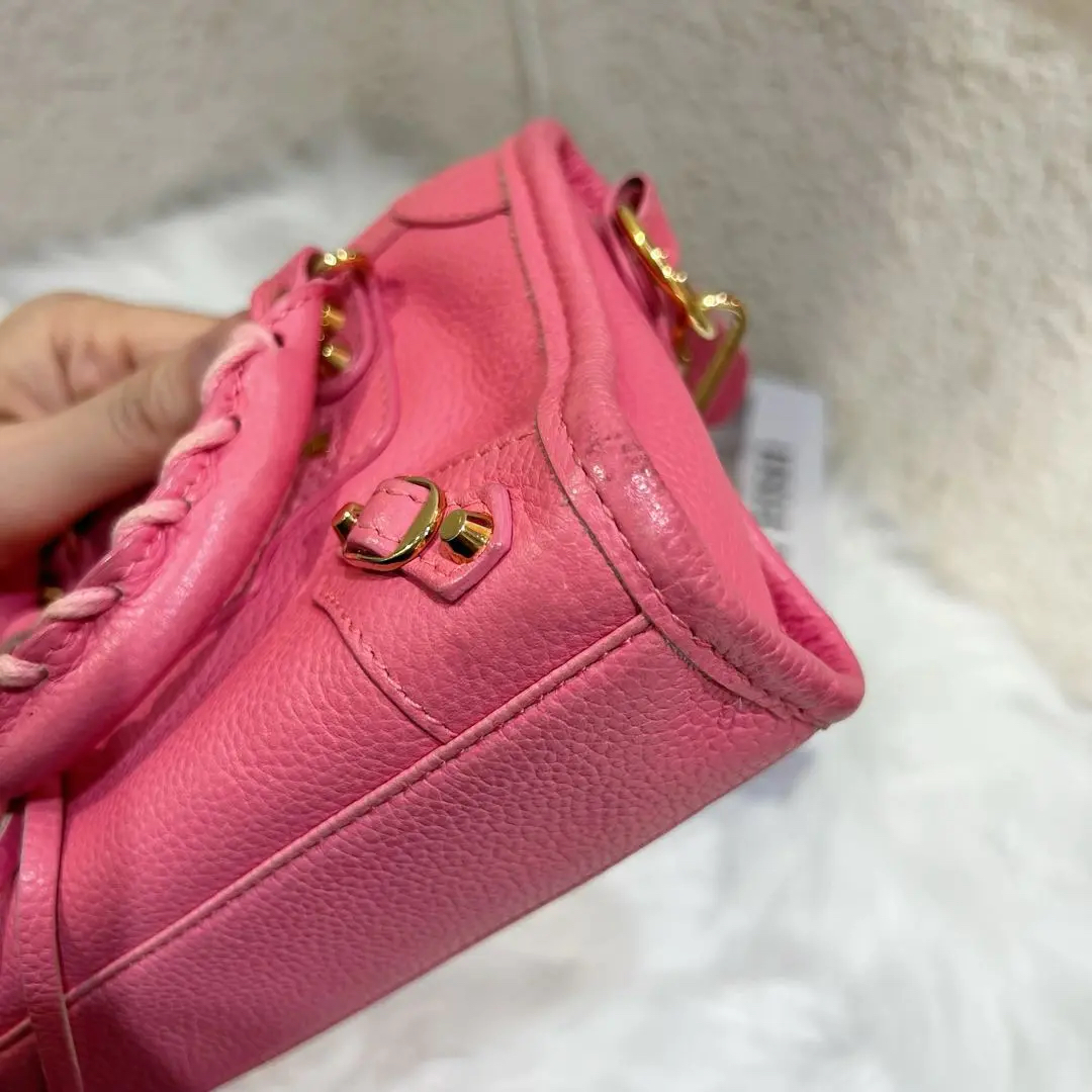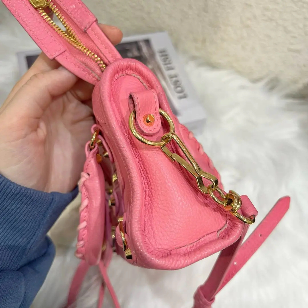 商品详情】正品二手 巴黎世家 Le City mini 粉色 羊皮 机车包🏍️ 97新 18*12 配件:镜子 肩带 防尘袋。金属铆钉 拉链开合 甜酷复古