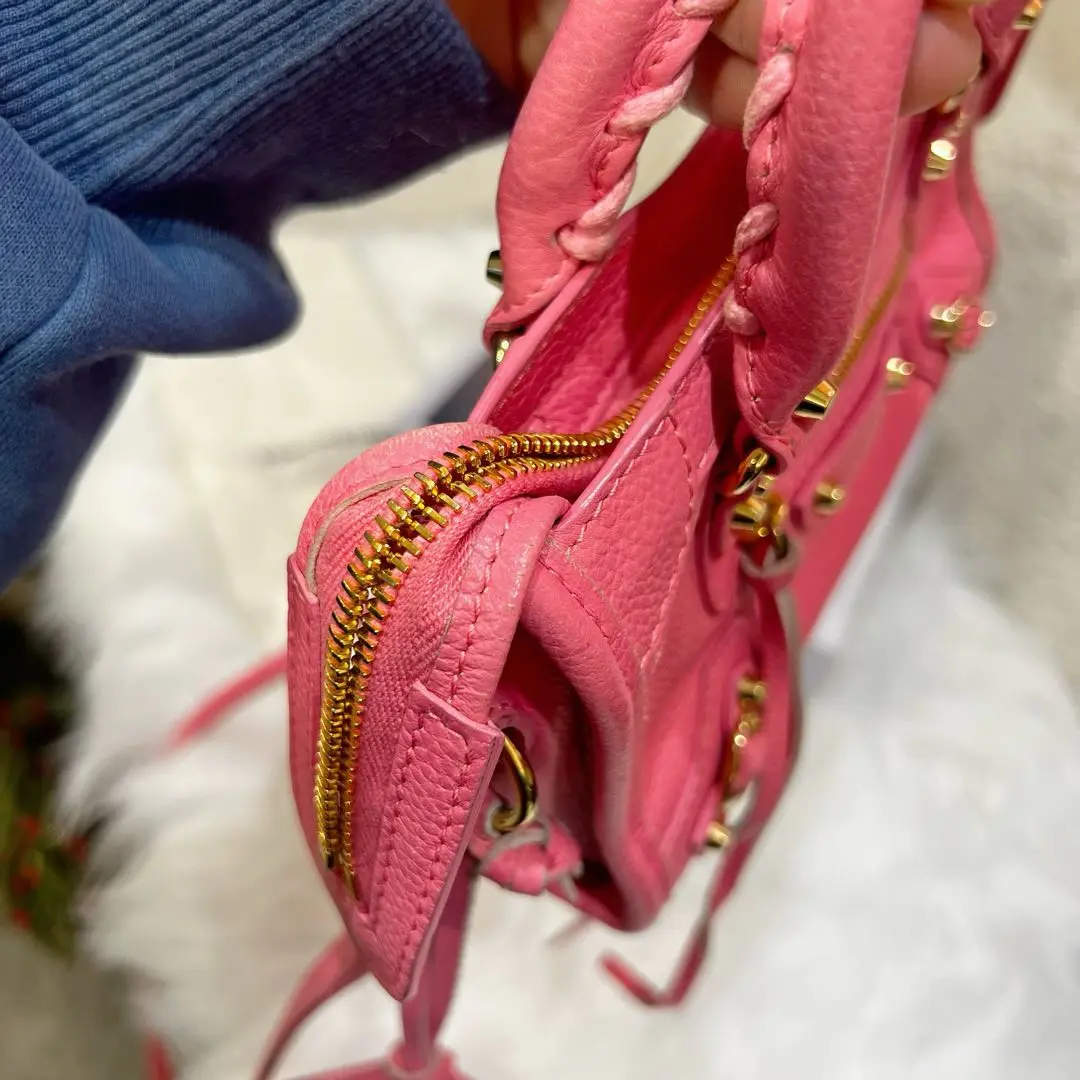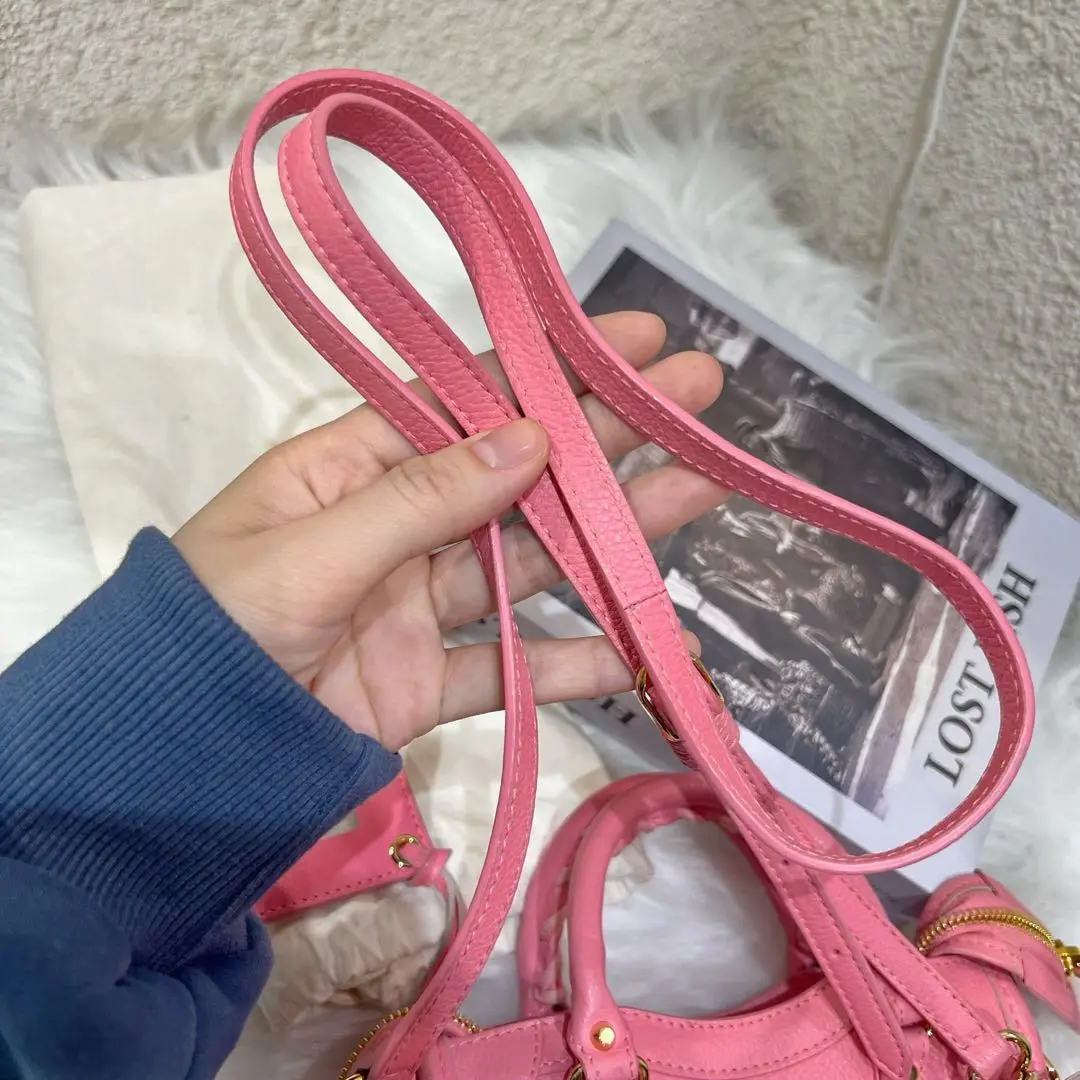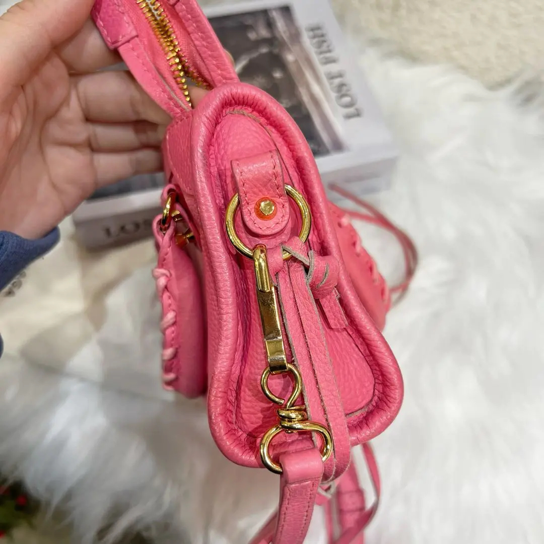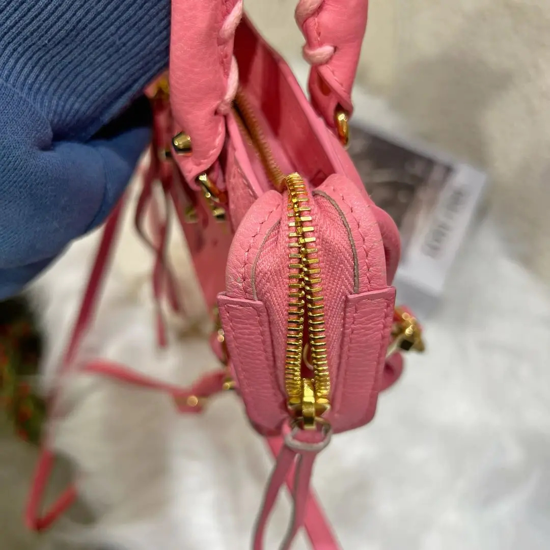 商品详情】正品二手 巴黎世家 Le City mini 粉色 羊皮 机车包🏍️ 97新 18*12 配件:镜子 肩带 防尘袋。金属铆钉 拉链开合 甜酷复古
